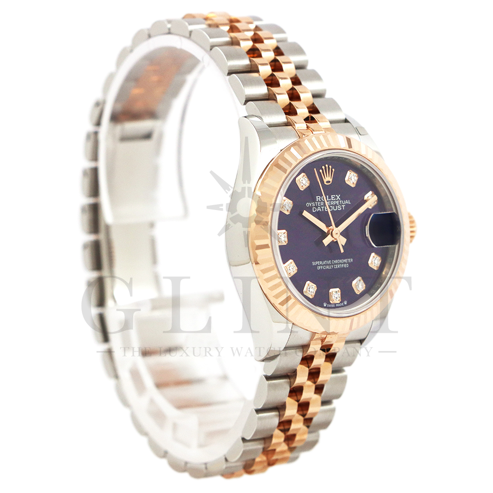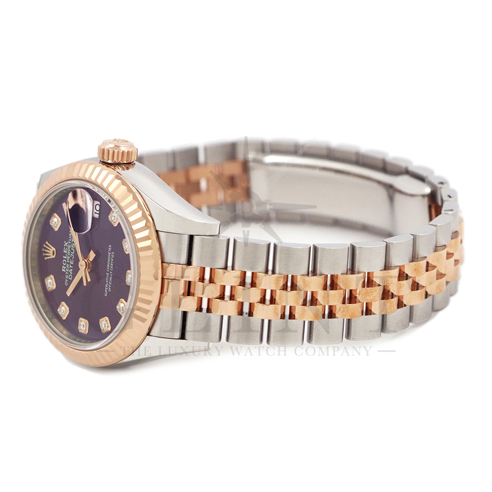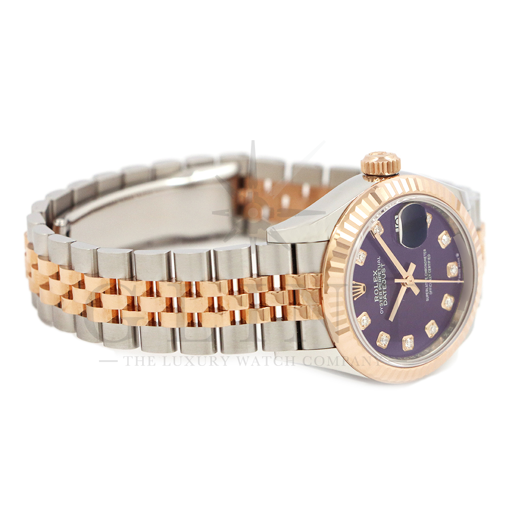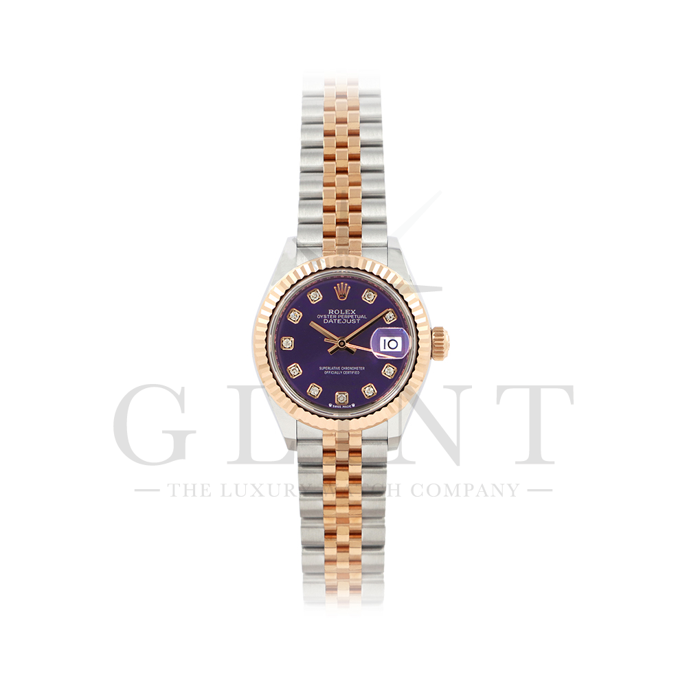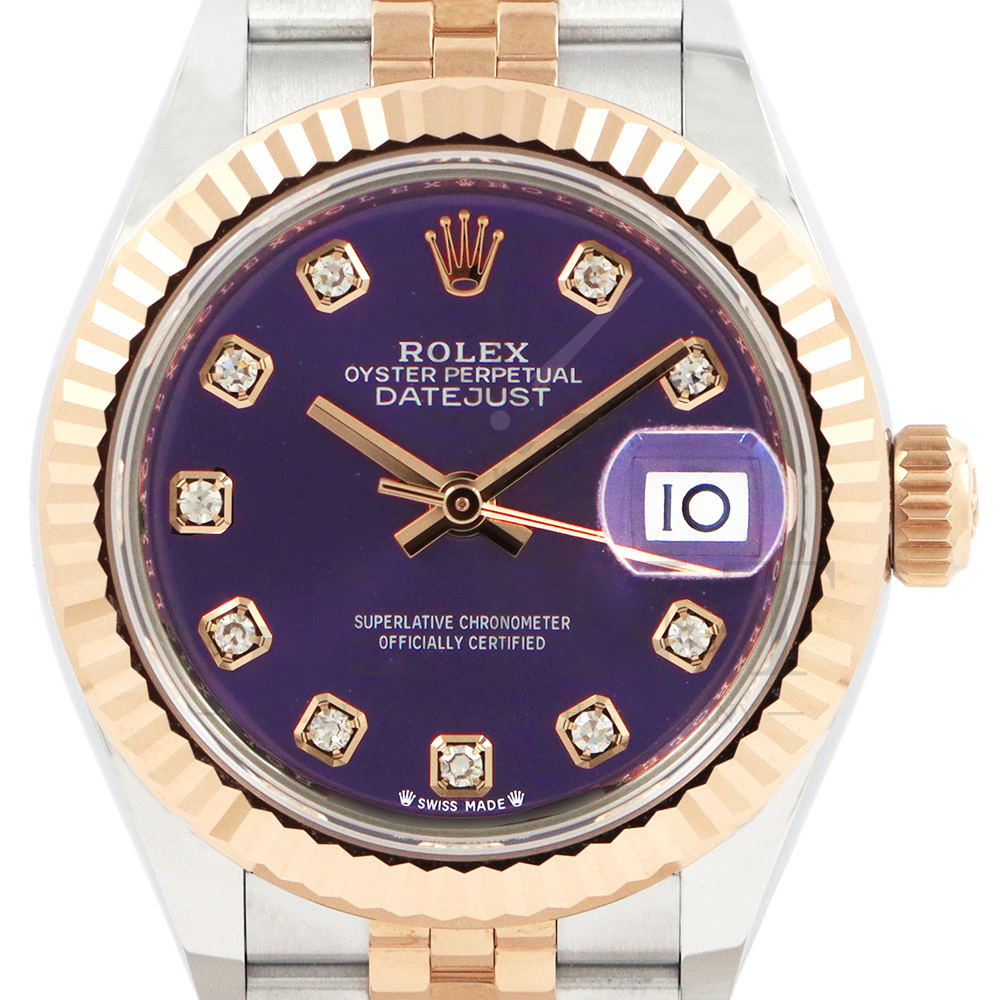 こちらはロレックス オイスターパーペチュアル レディ デイトジャストです。美しいカッティングが施されたフルーテッドベゼルに18Kエバーローズゴールドを使用しており、上品な高級感が漂うデイリーユースに最適な機能性と飽きのこないシンプルなデザインが魅力のモデル。オーベルジーヌ文字盤のインデックスにはダイヤモンドがセッティングされており、より上品な高級感を演出してくれるでしょう。搭載されているキャリバー 2236は、ロレックスが再定義した高レベルなクロノメーター性能を提供し、従来のヘアスプリングの約10倍もの耐衝撃性が実現されました。5連のジュビリーブレスにはバックルが見えないコンシールドクラスプを採用しており、それによってブレスレットの一体感が強調され、ジュエリーテイストが色濃く反映されております。女性の目線で考え抜かれた非常に豪華なタイムピースをご堪能ください。