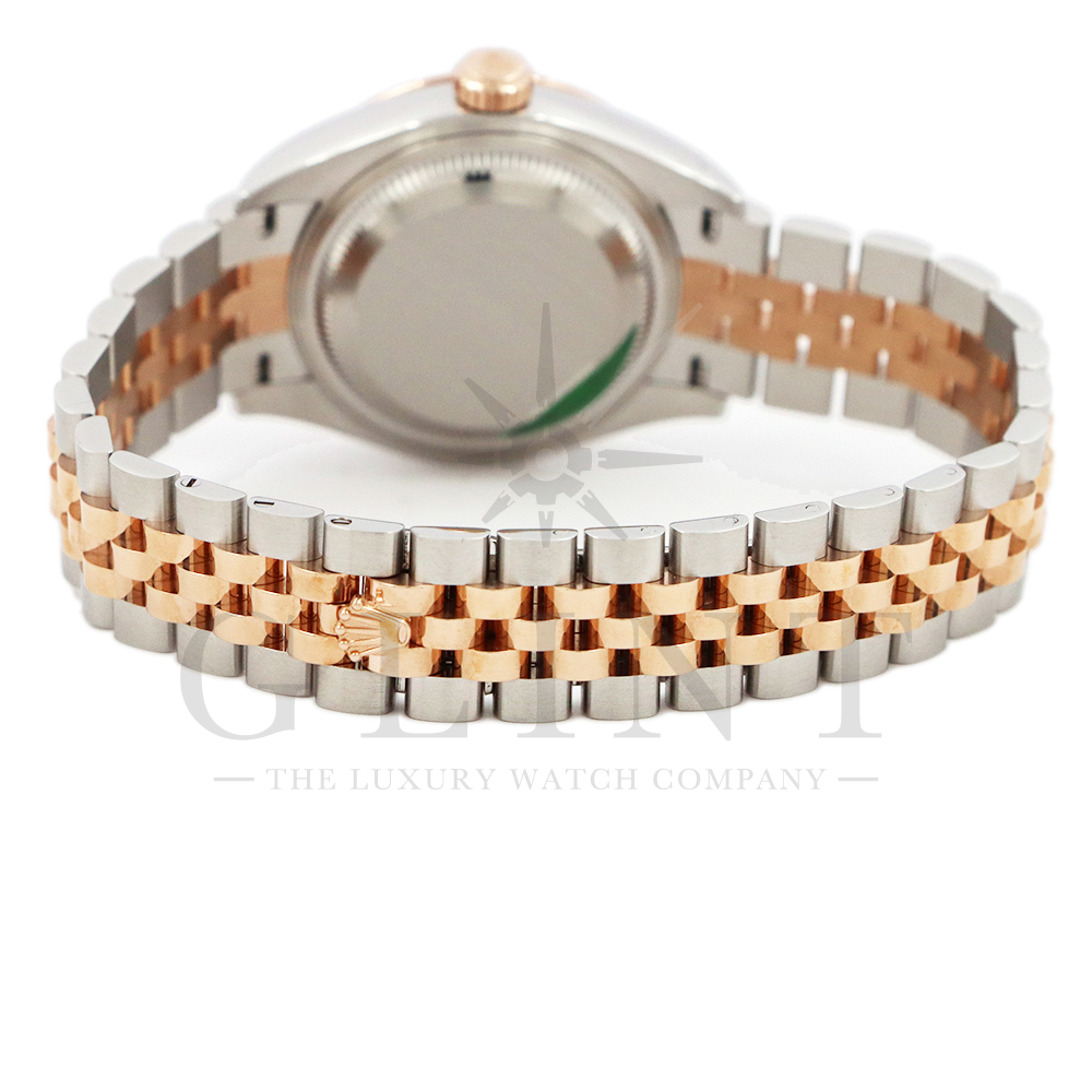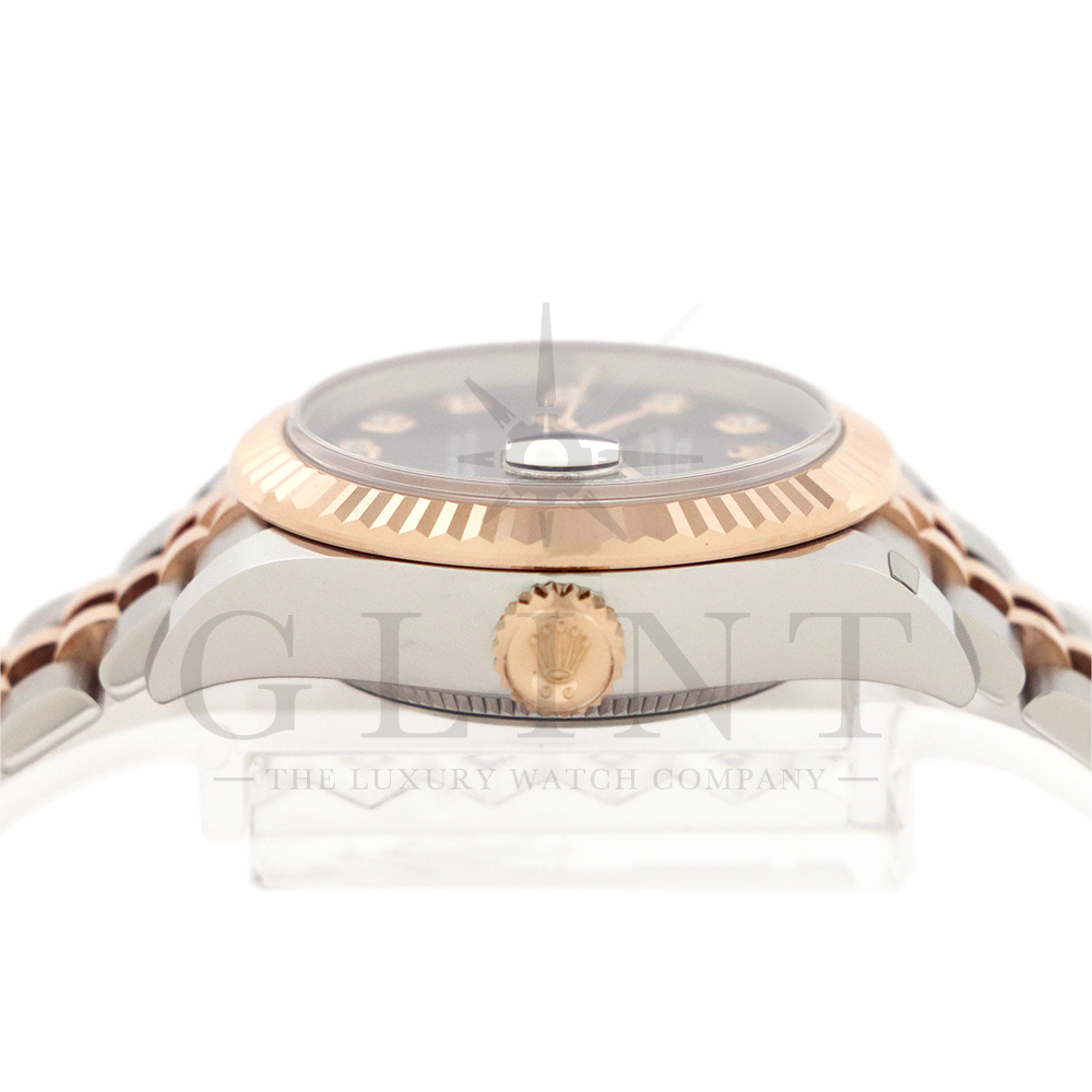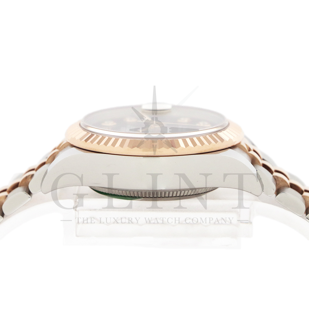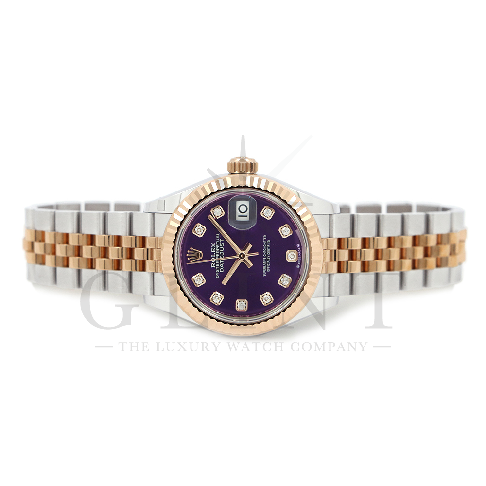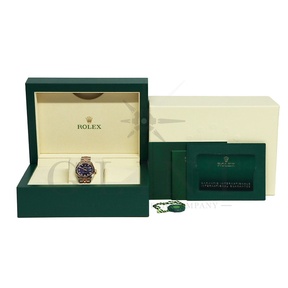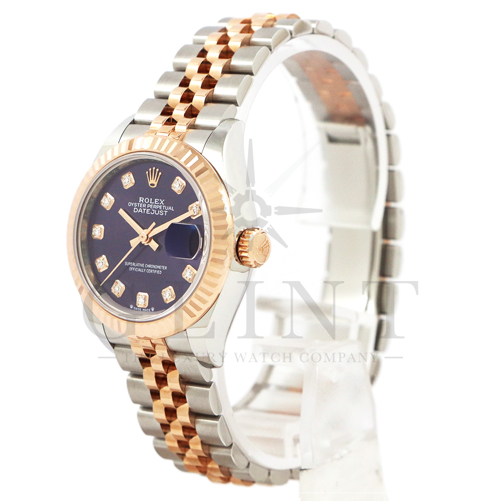 こちらはロレックス オイスターパーペチュアル レディ デイトジャストです。美しいカッティングが施されたフルーテッドベゼルに18Kエバーローズゴールドを使用しており、上品な高級感が漂うデイリーユースに最適な機能性と飽きのこないシンプルなデザインが魅力のモデル。オーベルジーヌ文字盤のインデックスにはダイヤモンドがセッティングされており、より上品な高級感を演出してくれるでしょう。搭載されているキャリバー 2236は、ロレックスが再定義した高レベルなクロノメーター性能を提供し、従来のヘアスプリングの約10倍もの耐衝撃性が実現されました。5連のジュビリーブレスにはバックルが見えないコンシールドクラスプを採用しており、それによってブレスレットの一体感が強調され、ジュエリーテイストが色濃く反映されております。女性の目線で考え抜かれた非常に豪華なタイムピースをご堪能ください。