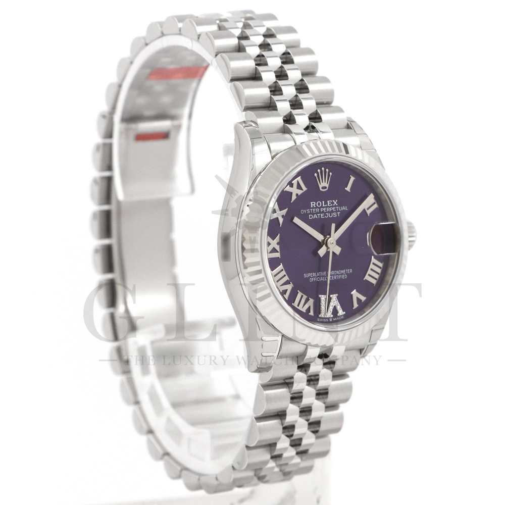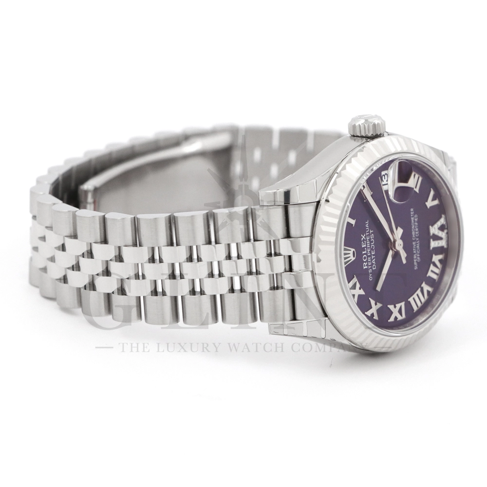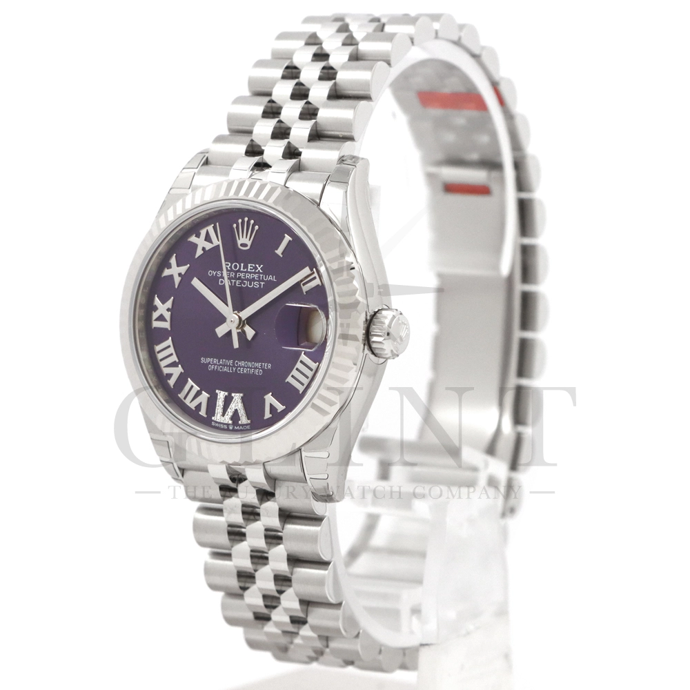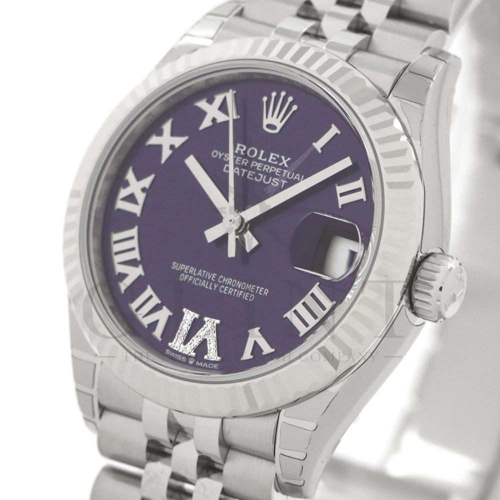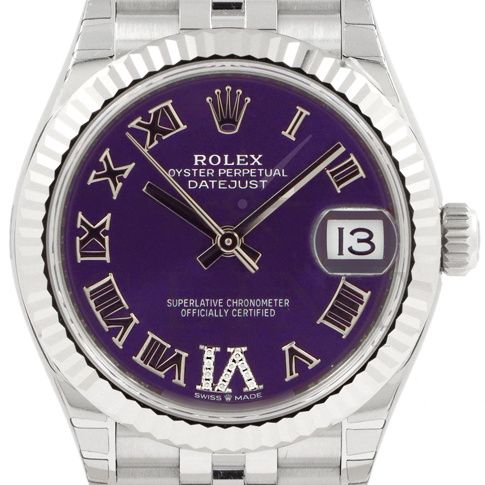 こちらはロレックス デイトジャスト31です。妖艶な雰囲気を放つサンレイ仕上げのオーベルジーヌダイアルには大型のVIに11個のダイヤモンドがセッティングされており、上品な印象を与えてくれるでしょう。ムーブメントにはロレックスによる完全自社製造キャリバー2236を搭載し、パワーリザーブが55時間まで延長され、何時でも日付調整を可能とする事で実用性も上がりました。ブレスレットはジュビリーブレスレットを採用しており、エレガントな雰囲気を与えてくれるでしょう。ジュビリーブレスレットにはコンシールドクラスプが採用され、あたかもバックルが無いようなスマートなシルエットになり、ジュエリー感覚としてもお楽しみになれる一本です。