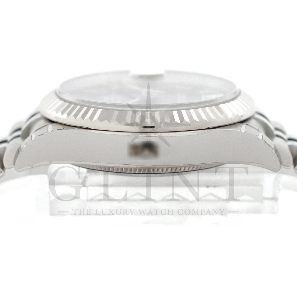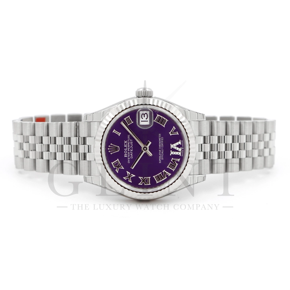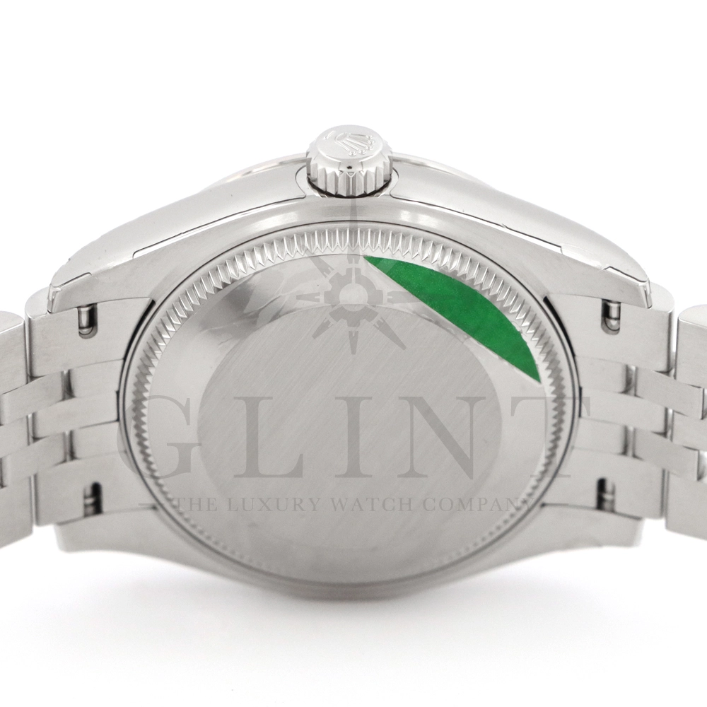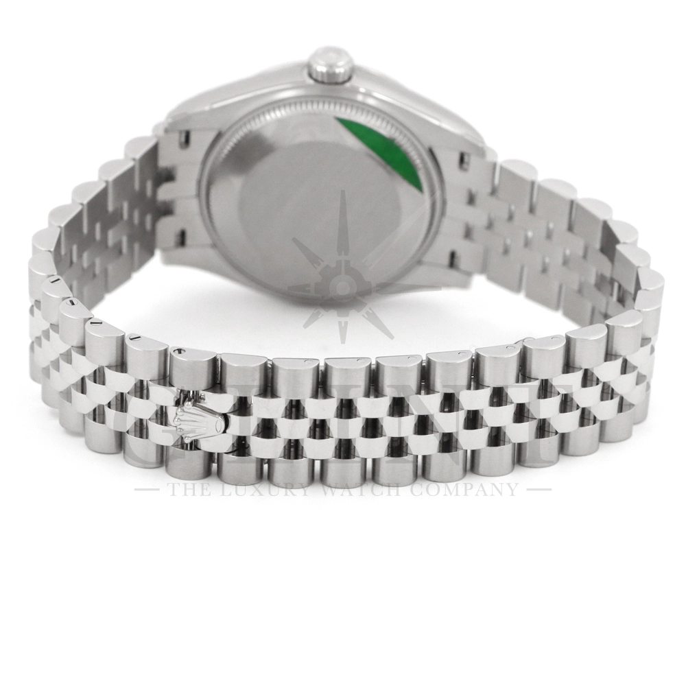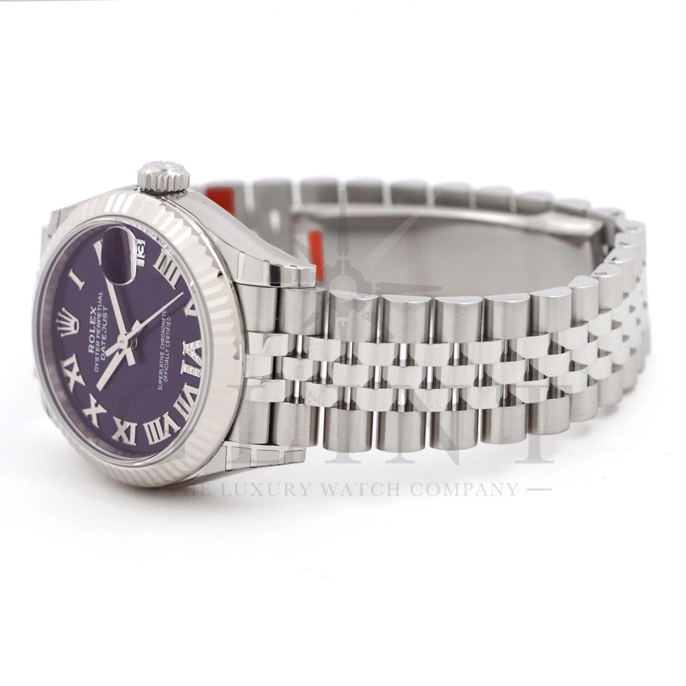 こちらはロレックス デイトジャスト31です。妖艶な雰囲気を放つサンレイ仕上げのオーベルジーヌダイアルには大型のVIに11個のダイヤモンドがセッティングされており、上品な印象を与えてくれるでしょう。ムーブメントにはロレックスによる完全自社製造キャリバー2236を搭載し、パワーリザーブが55時間まで延長され、何時でも日付調整を可能とする事で実用性も上がりました。ブレスレットはジュビリーブレスレットを採用しており、エレガントな雰囲気を与えてくれるでしょう。ジュビリーブレスレットにはコンシールドクラスプが採用され、あたかもバックルが無いようなスマートなシルエットになり、ジュエリー感覚としてもお楽しみになれる一本です。