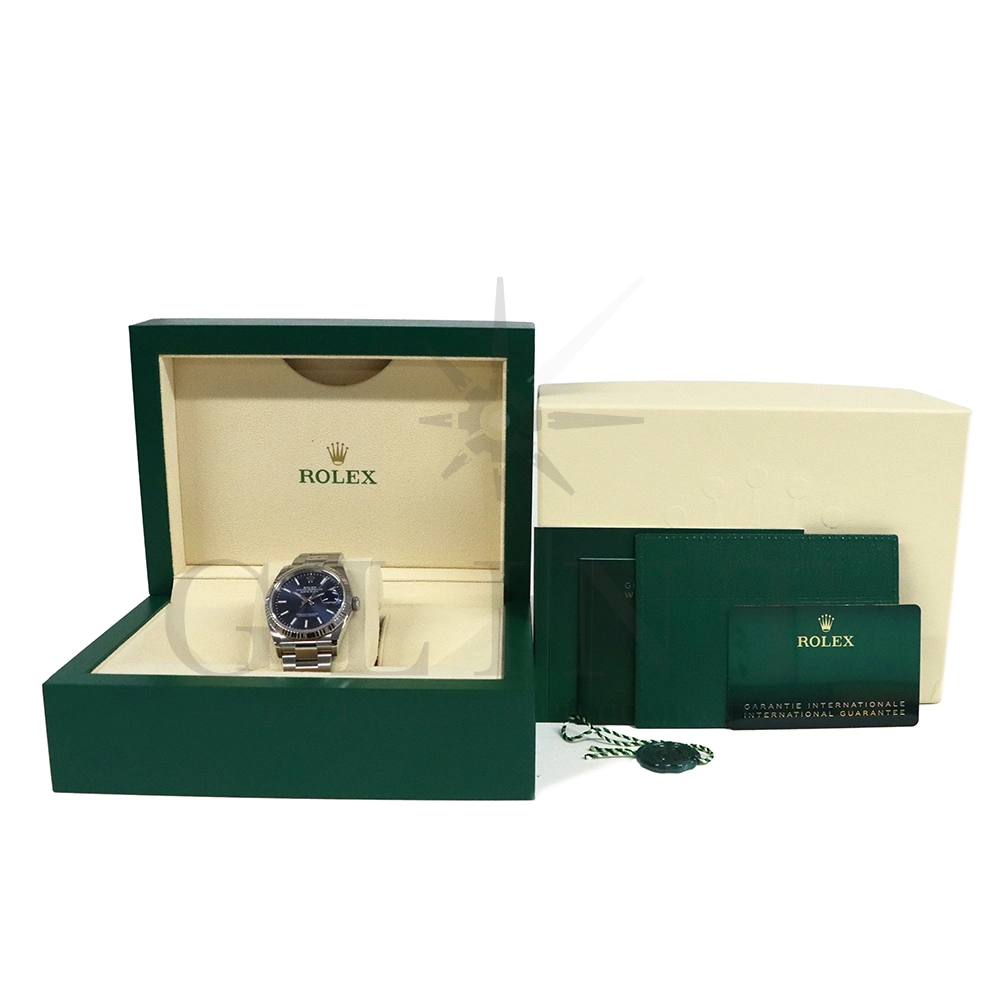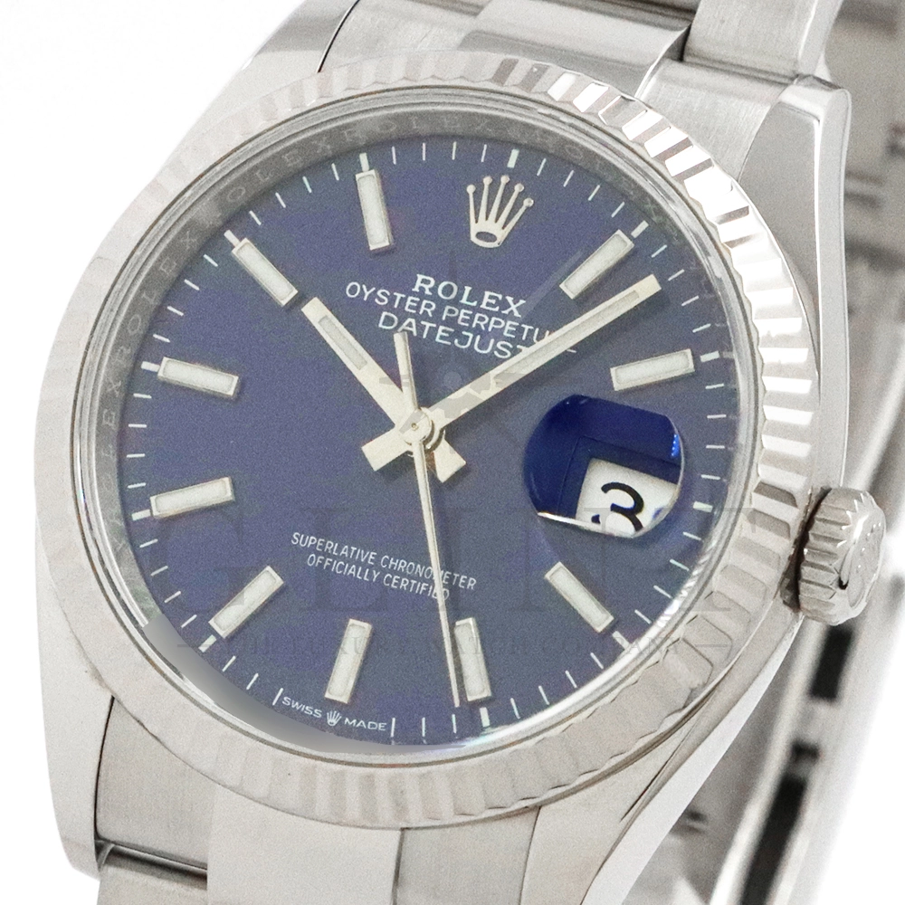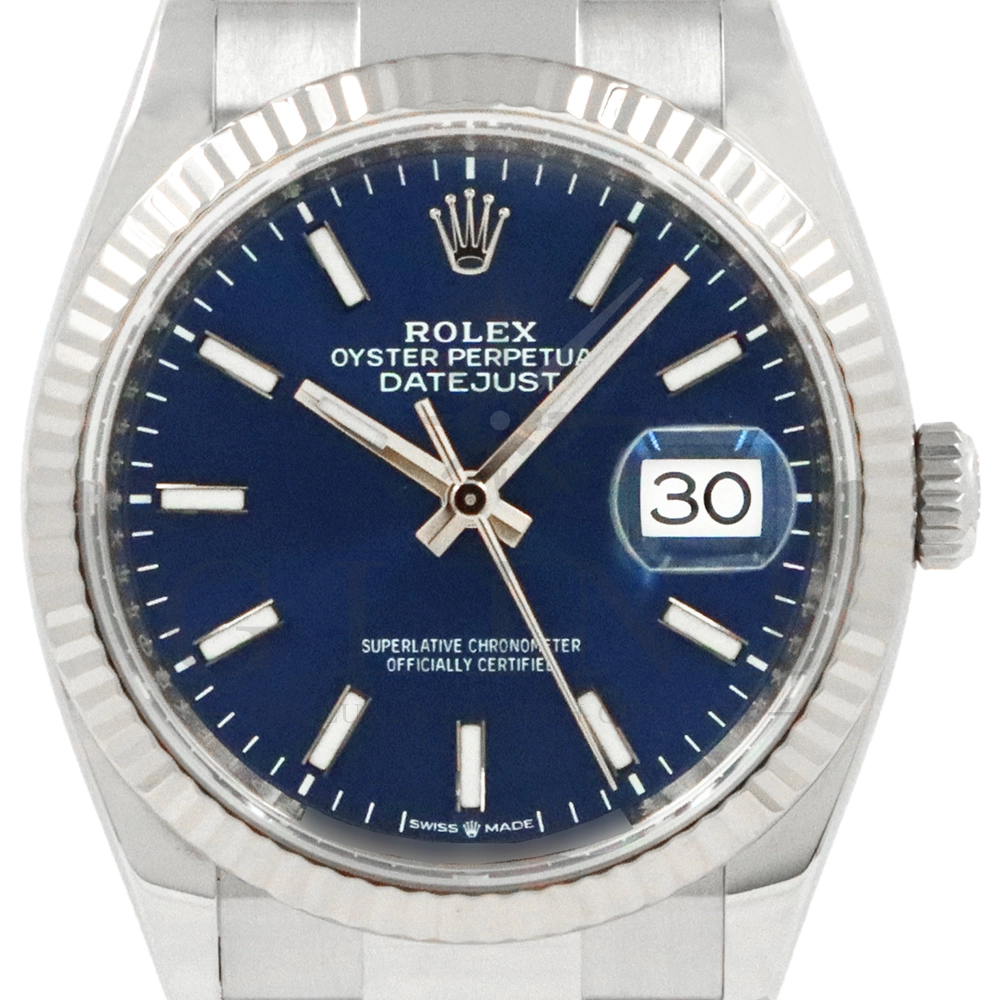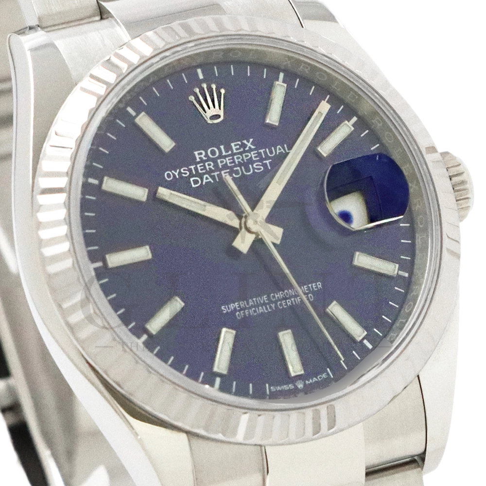 こちらはロレックス デイトジャスト36です。18Kホワイトゴールドで製造されたフルーテッドベゼルはロレックスのシンボルともいうべく、デザインの要素となり、高級感を演出してくれます。深みのあるサンレイ仕上げのブルーが光の角度によって様々な表情を見せ、見る者を飽きさせません。ムーブメントにはロレックスによる完全自社製造キャリバー3235を搭載し、パワーリザーブが70時間まで延長され、何時でも日付調整を可能とする事で実用性も上がりました。ブレスレットはオイスターブレスレットを採用しており、堅牢な印象を与えてくれるでしょう。正に唯一無二の雰囲気を感じさせてくれる特別なデイトジャストです。