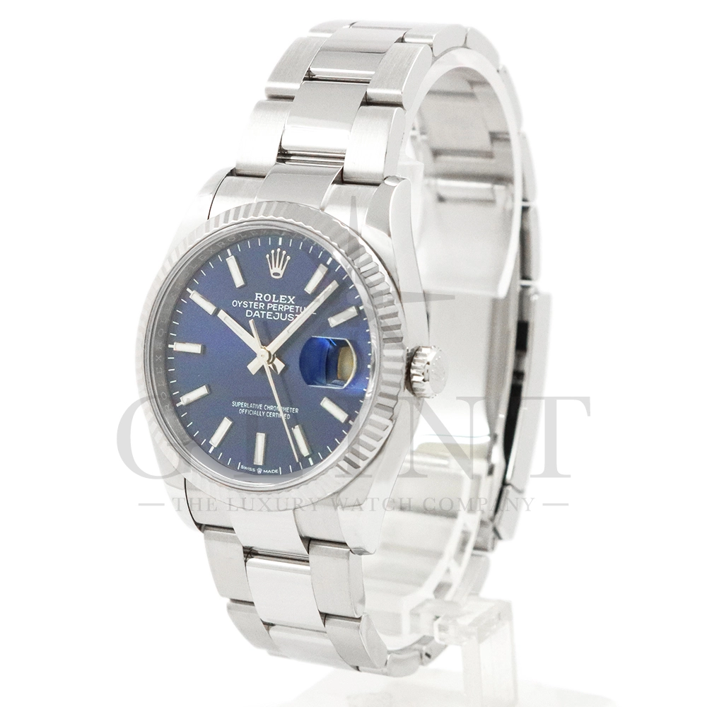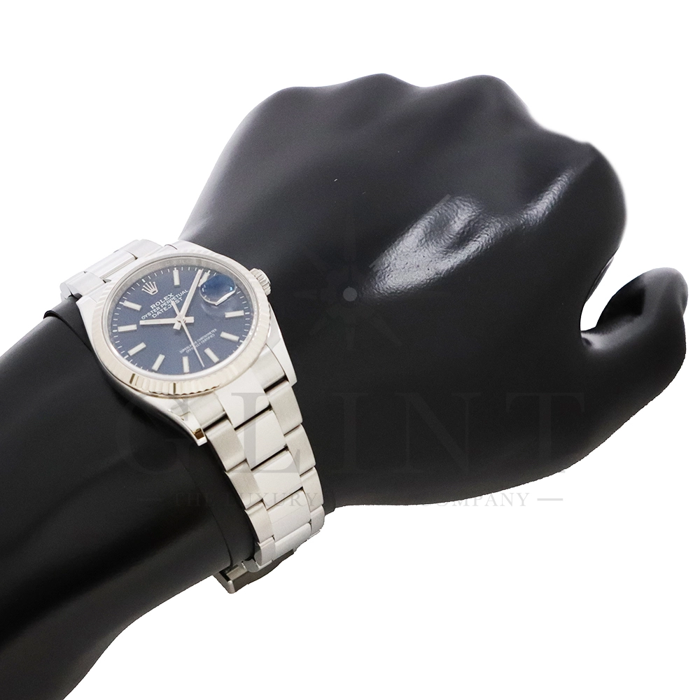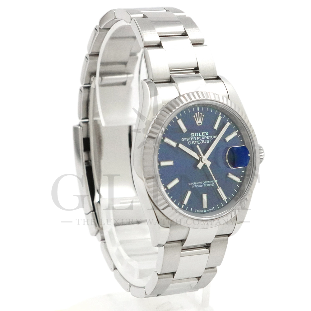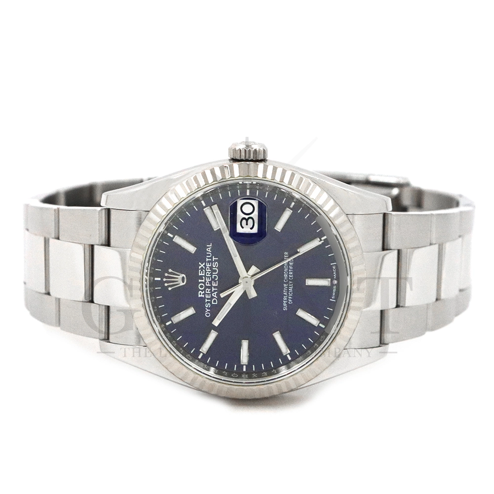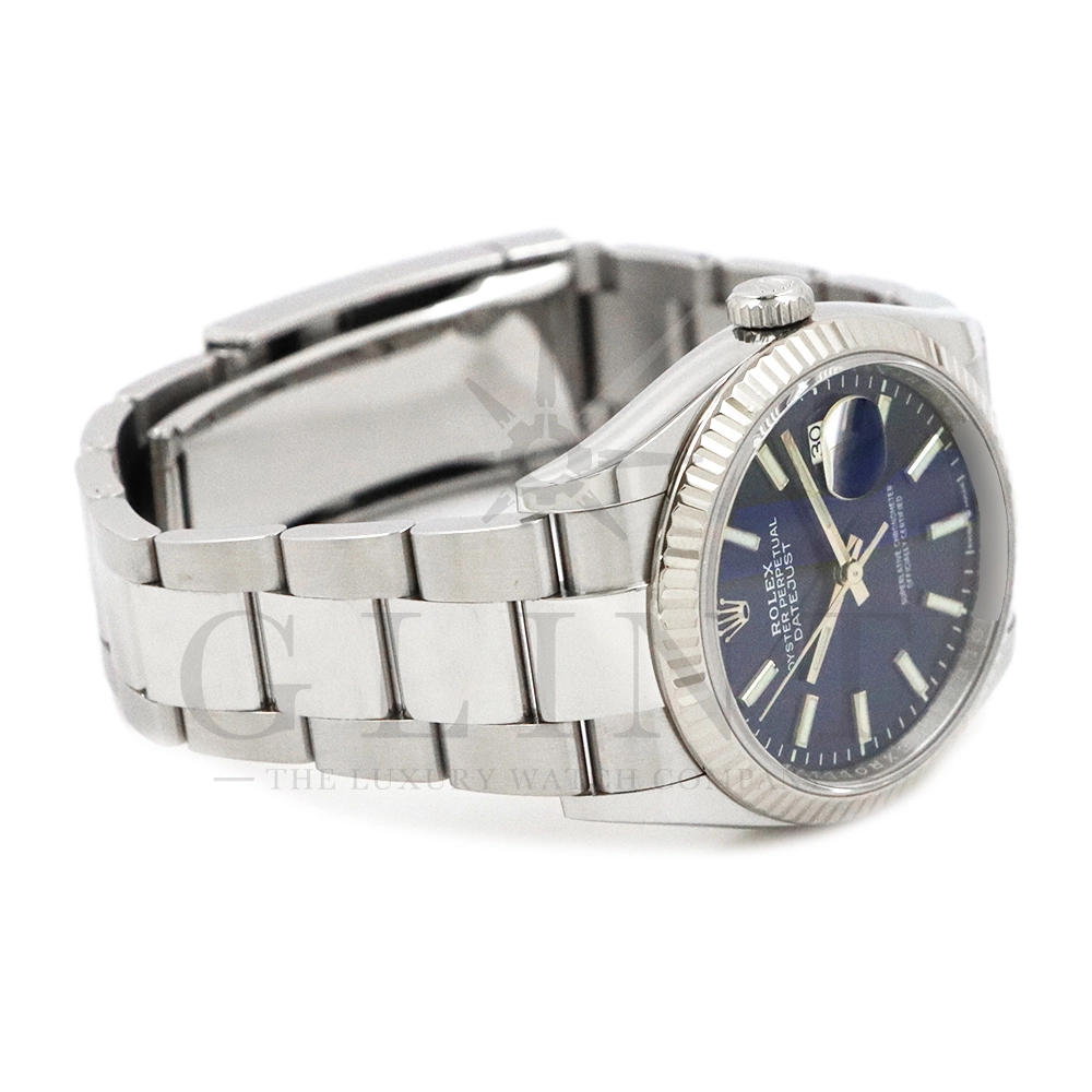こちらはロレックス デイトジャスト36です。18Kホワイトゴールドで製造されたフルーテッドベゼルはロレックスのシンボルともいうべく、デザインの要素となり、高級感を演出してくれます。深みのあるサンレイ仕上げのブルーが光の角度によって様々な表情を見せ、見る者を飽きさせません。ムーブメントにはロレックスによる完全自社製造キャリバー3235を搭載し、パワーリザーブが70時間まで延長され、何時でも日付調整を可能とする事で実用性も上がりました。ブレスレットはオイスターブレスレットを採用しており、堅牢な印象を与えてくれるでしょう。正に唯一無二の雰囲気を感じさせてくれる特別なデイトジャストです。