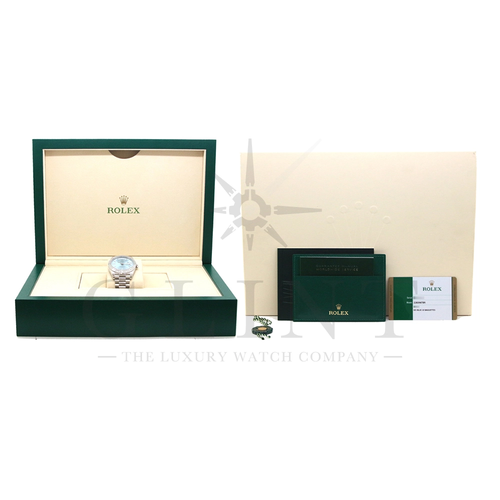 こちらはロレックス オイスターパーペチュアル デイデイト40 Ref.228396TBRです。2015年に誕生したデイデイト40は、その名の通り、前機のデイデイトIIよりケースサイズを40mmにサイズダウンし、ロレックスが自社で新たに開発した機械式自動巻きムーブメント「Cal.3255」が搭載。パワーリザーブが約70時間までに延長されました。ケースデザインは、ロレックスならではのバランスが取れた美しい印象を与え、腕にフィットするミドルケースとラグ、そして大きくて視認性に優れたダイアルに。デイデイトのみに与えられてきたプレジデントブレスのデザインも一新され、従来以上にケースとの一体感が増した仕上がりとなっております。素材にプラチナを使用した同モデルは特有のアイスブルー文字盤を採用しており、一目で特別感を感じられるでしょう。ロレックス最高峰のモデルは必ず所有者に筆舌に尽くしがたい格別な気持ちとステータスを与えてくれる事は間違いありません。