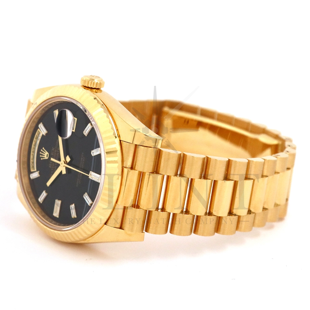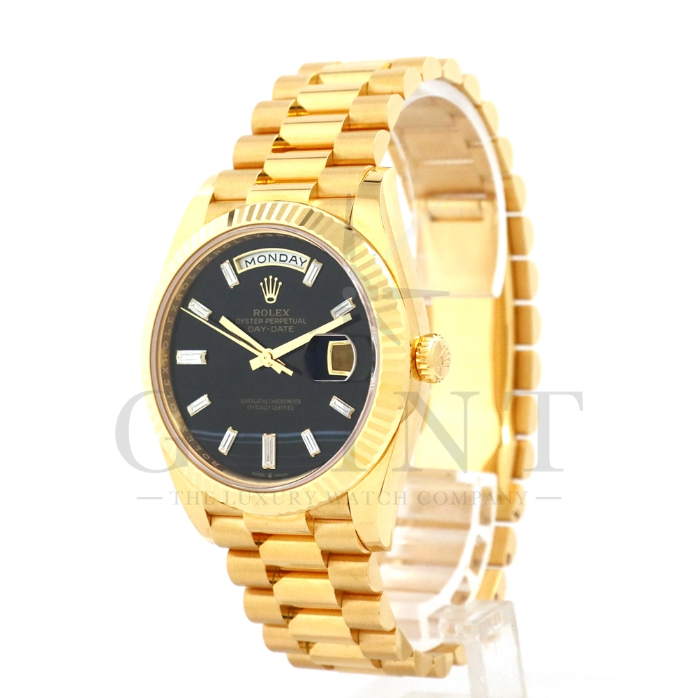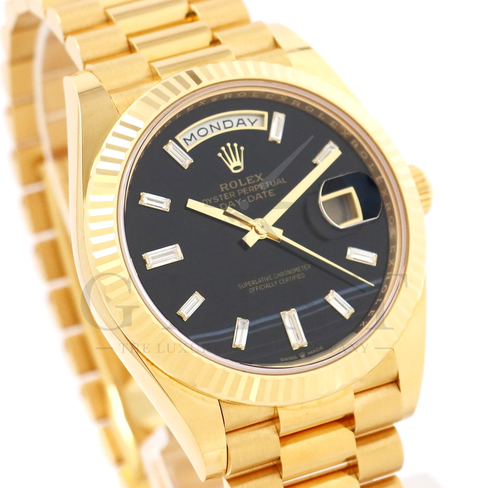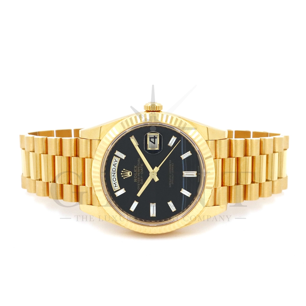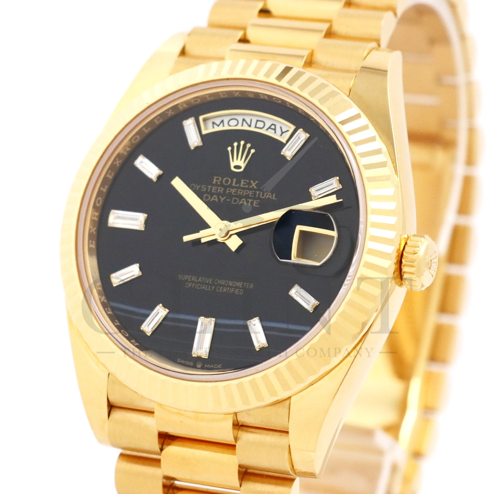 こちらはロレックス オイスターパーペチュアル デイデイト40 228238Aです。2015年に誕生したデイデイト40は、その名の通り、前機のデイデイトIIよりケースサイズを40mmにサイズダウンし、ロレックスが自社で新たに開発した機械式自動巻きムーブメント「Cal.3255」が搭載。パワーリザーブが約70時間までに延長されました。ケースデザインは、ロレックスならではのバランスが取れた美しい印象を与え、腕にフィットするミドルケースとラグ、そして大きくて視認性に優れたダイアルに。デイデイトのみに与えられてきたプレジデントブレスのデザインも一新され、従来以上にケースとの一体感が増した仕上がりとなっております。また、こちらのモデルは特徴的な模様が入ったブラックオニキス文字盤に10pcのバゲットダイヤモンドがインデックスにセッティングされており、上品な高級感も感じさせてくれるでしょう。ロレックス最高峰のモデルは必ず所有者に筆舌に尽くしがたい格別な気持ちとステータスを与えてくれる事は間違いありません。