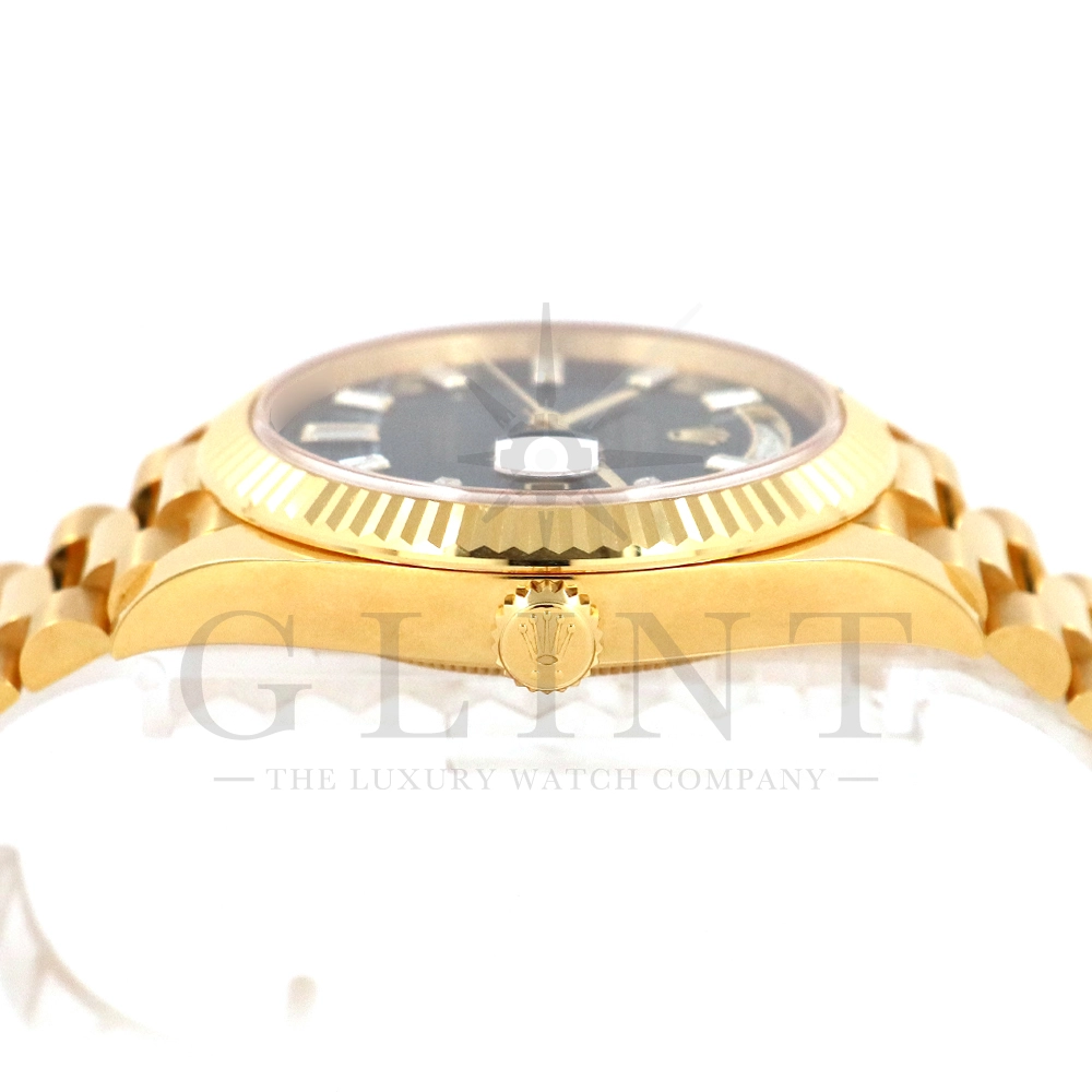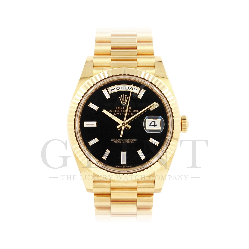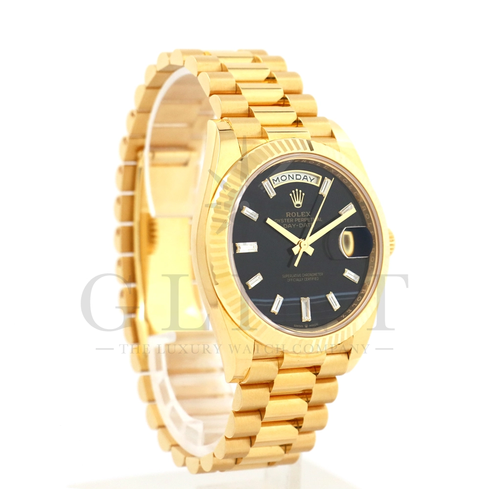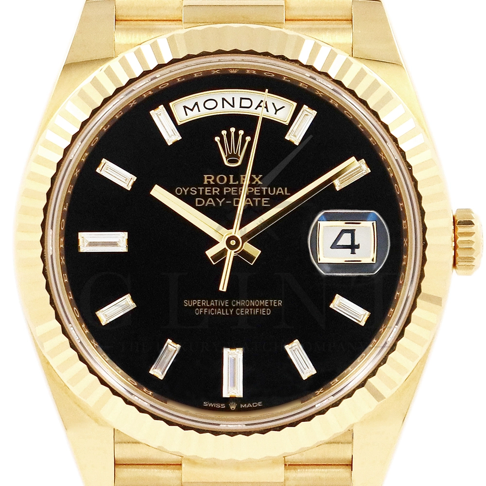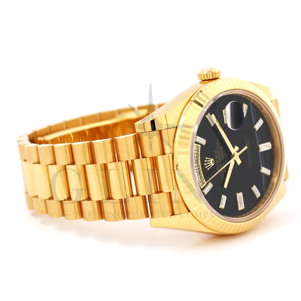 こちらはロレックス オイスターパーペチュアル デイデイト40 228238Aです。2015年に誕生したデイデイト40は、その名の通り、前機のデイデイトIIよりケースサイズを40mmにサイズダウンし、ロレックスが自社で新たに開発した機械式自動巻きムーブメント「Cal.3255」が搭載。パワーリザーブが約70時間までに延長されました。ケースデザインは、ロレックスならではのバランスが取れた美しい印象を与え、腕にフィットするミドルケースとラグ、そして大きくて視認性に優れたダイアルに。デイデイトのみに与えられてきたプレジデントブレスのデザインも一新され、従来以上にケースとの一体感が増した仕上がりとなっております。また、こちらのモデルは特徴的な模様が入ったブラックオニキス文字盤に10pcのバゲットダイヤモンドがインデックスにセッティングされており、上品な高級感も感じさせてくれるでしょう。ロレックス最高峰のモデルは必ず所有者に筆舌に尽くしがたい格別な気持ちとステータスを与えてくれる事は間違いありません。