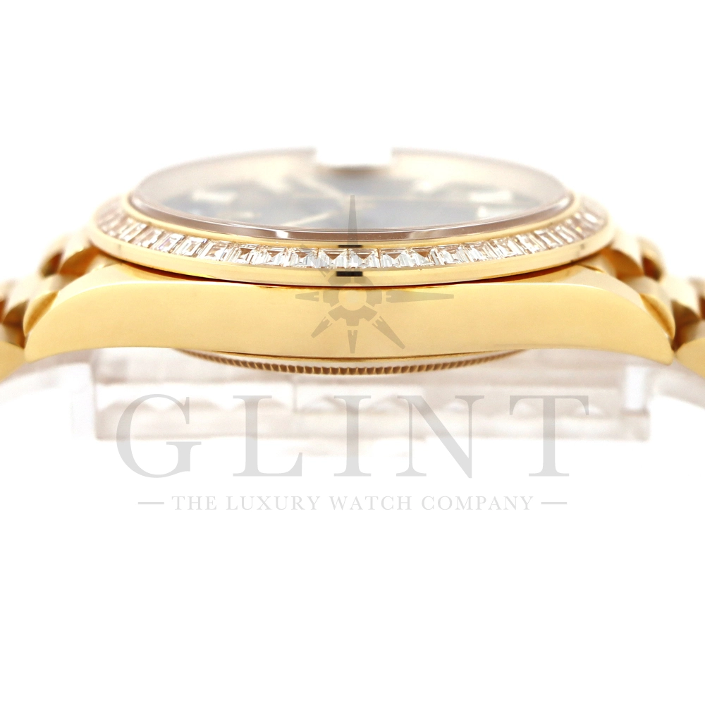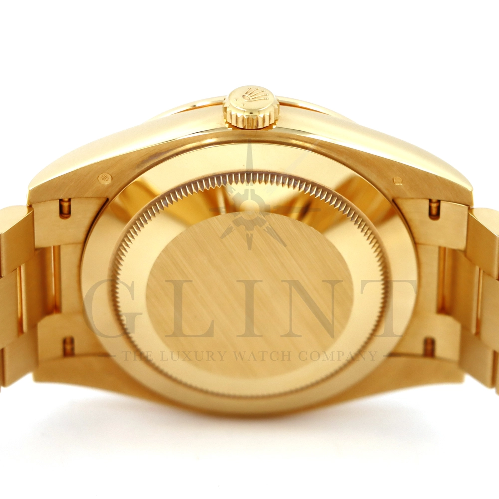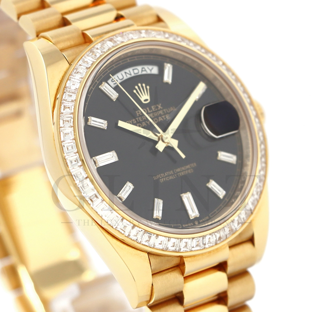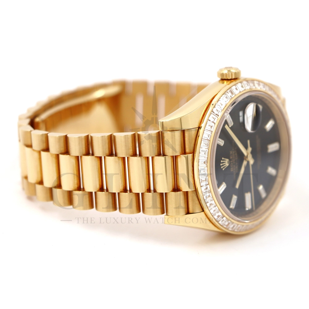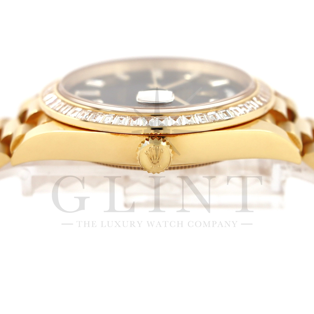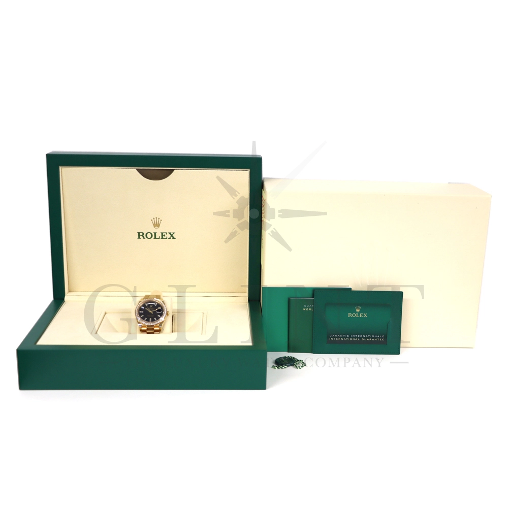 こちらはロレックス オイスターパーペチュアル デイデイト40 Ref.228398TBRです。2015年に誕生したデイデイト40は、その名の通り、前機のデイデイトIIよりケースサイズを40mmにサイズダウンし、ロレックスが自社で新たに開発した機械式自動巻きムーブメント「Cal.3255」が搭載。パワーリザーブが約70時間までに延長されました。ケースデザインは、ロレックスならではのバランスが取れた美しい印象を与え、腕にフィットするミドルケースとラグ、そして大きくて視認性に優れたダイアルに。デイデイトのみに与えられてきたプレジデントブレスのデザインも一新され、従来以上にケースとの一体感が増した仕上がりとなっております。素材に18Kイエローゴールドを使用し文字盤はサンレイ仕上げのブライトブラックで引締まった印象を与えてくれ、王道の特別感を感じられるでしょう。ロレックス最高峰のモデルは必ず所有者に筆舌に尽くしがたい格別な気持ちとステータスを与えてくれる事は間違いありません。