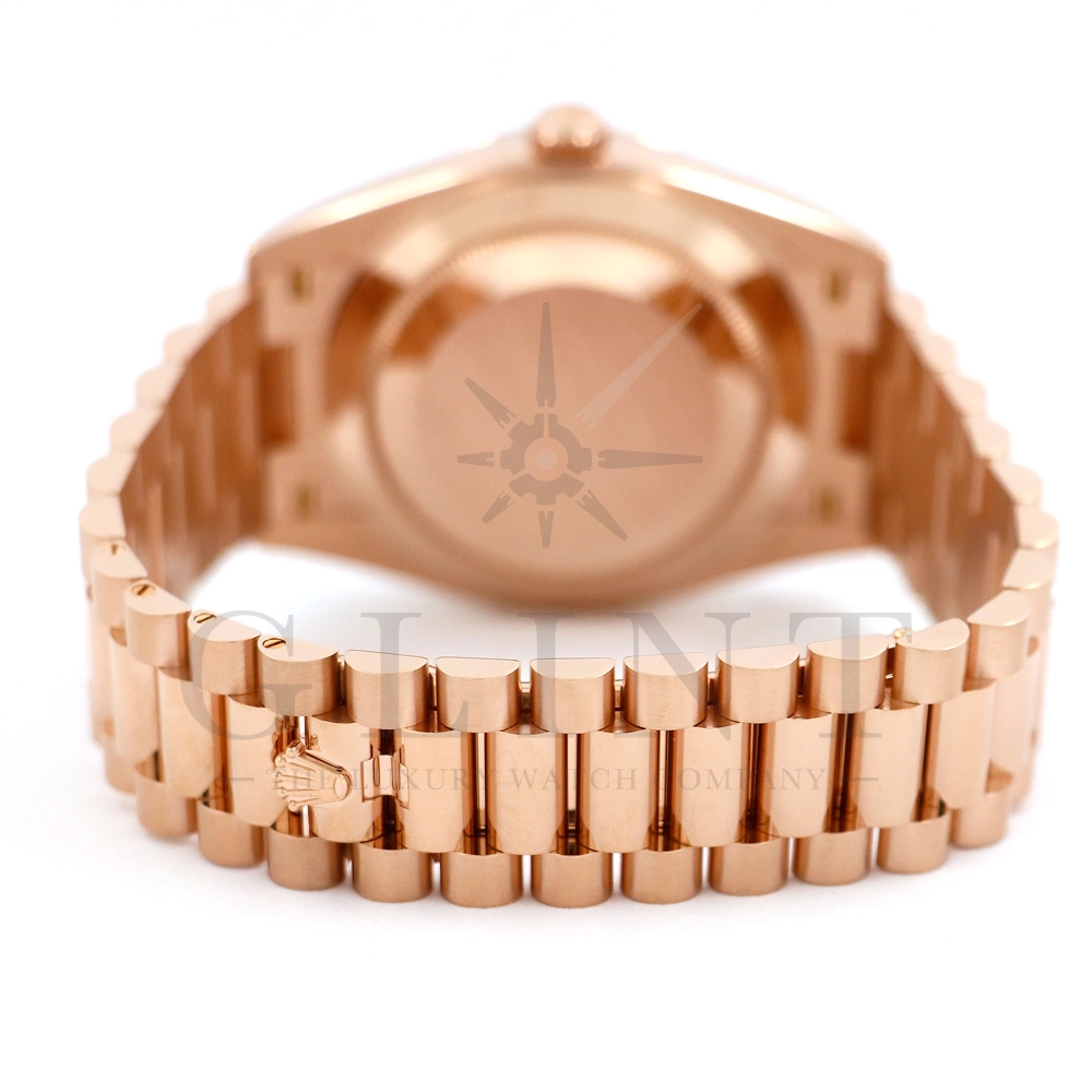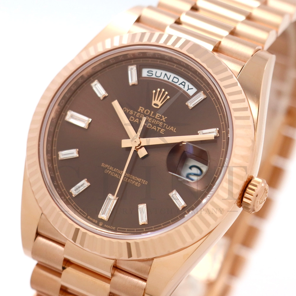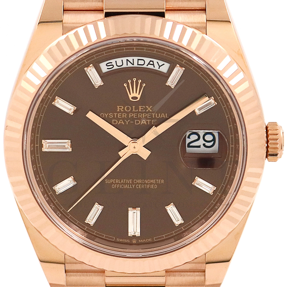 こちらはロレックス デイデイト40 228235Aです。2015年に誕生したデイデイト40は、その名の通り、前機のデイデイトIIよりケースサイズを40mmにサイズダウンし、ロレックスが自社で新たに開発した機械式自動巻きムーブメント「Cal.3255」が搭載。パワーリザーブが約70時間までに延長されました。ケースデザインは、ロレックスならではのバランスが取れた美しい印象を与え、腕にフィットするミドルケースとラグ、そして大きくて視認性に優れたダイアルに。デイデイトのみに与えられてきたプレジデントブレスのデザインも一新され、従来以上にケースとの一体感が増した仕上がりとなっております。ロレックス最高峰のモデルは必ず所有者に筆舌に尽くしがたい格別な気持ちとステータスを与えてくれる事は間違いありません。