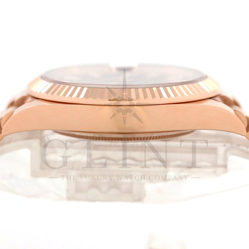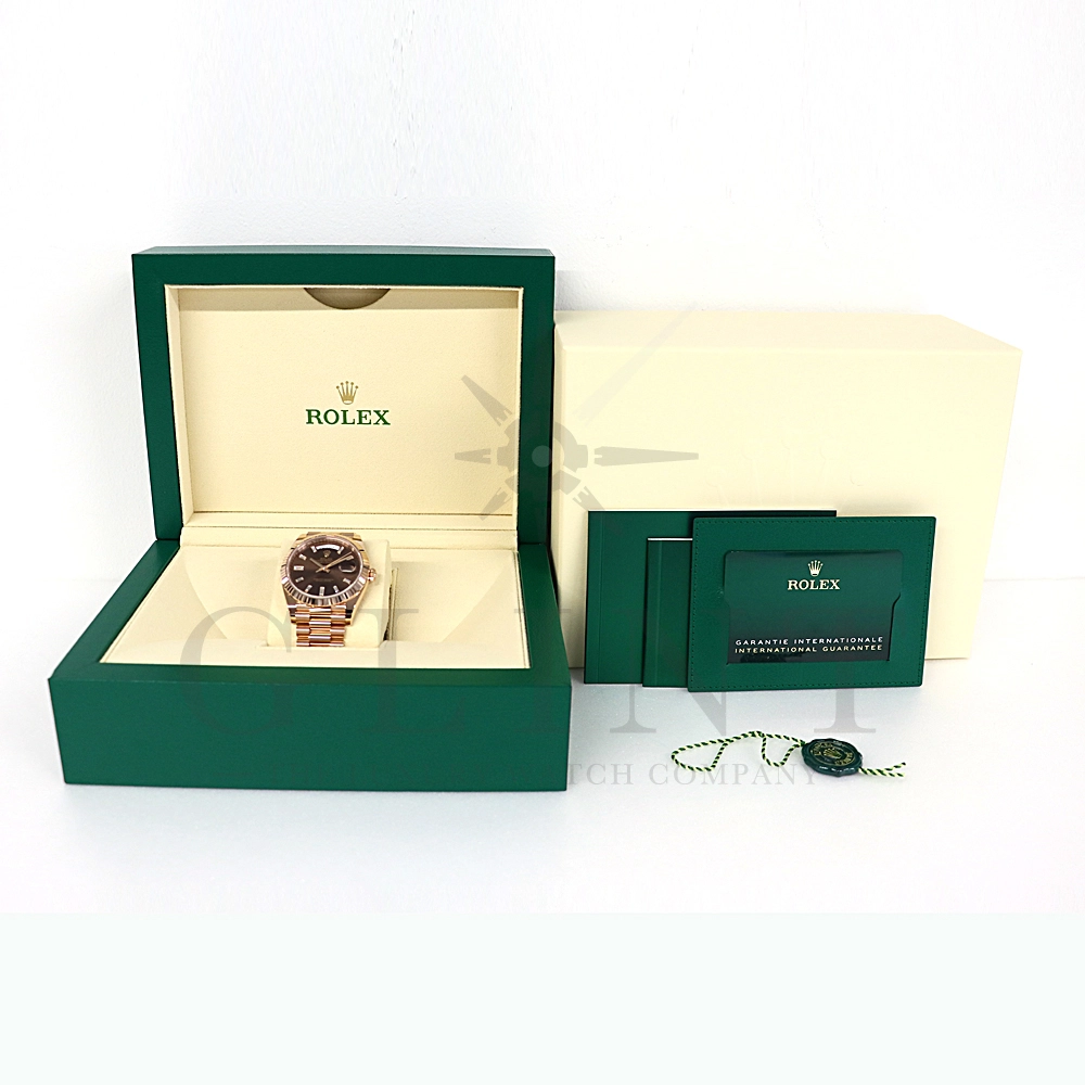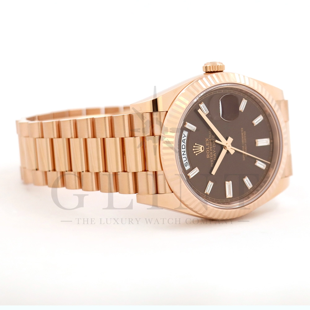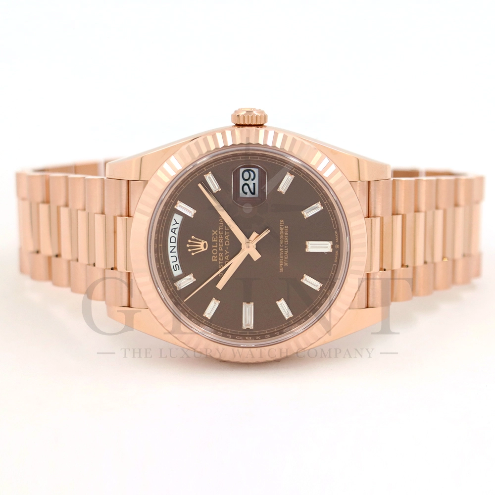 こちらはロレックス デイデイト40 228235Aです。2015年に誕生したデイデイト40は、その名の通り、前機のデイデイトIIよりケースサイズを40mmにサイズダウンし、ロレックスが自社で新たに開発した機械式自動巻きムーブメント「Cal.3255」が搭載。パワーリザーブが約70時間までに延長されました。ケースデザインは、ロレックスならではのバランスが取れた美しい印象を与え、腕にフィットするミドルケースとラグ、そして大きくて視認性に優れたダイアルに。デイデイトのみに与えられてきたプレジデントブレスのデザインも一新され、従来以上にケースとの一体感が増した仕上がりとなっております。ロレックス最高峰のモデルは必ず所有者に筆舌に尽くしがたい格別な気持ちとステータスを与えてくれる事は間違いありません。