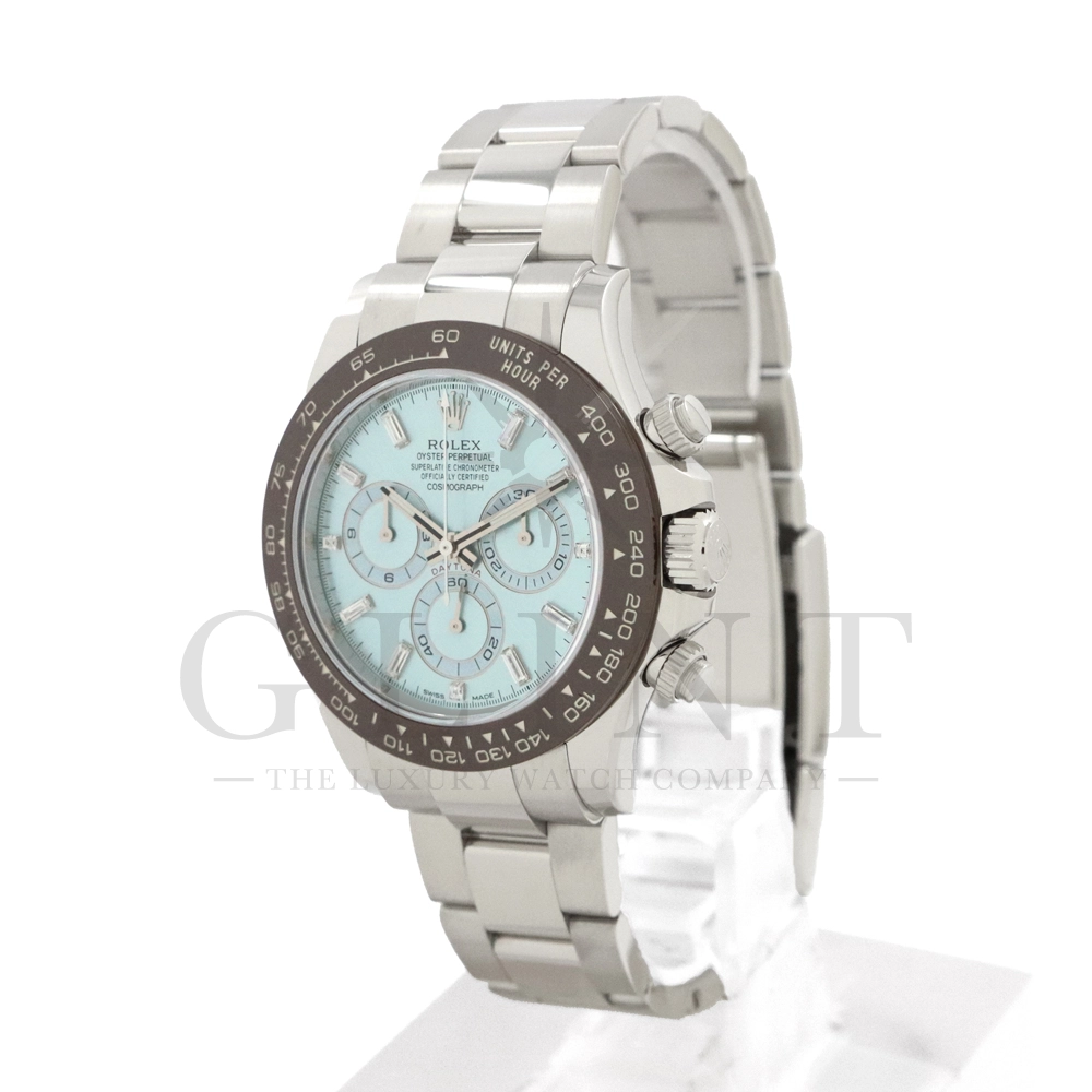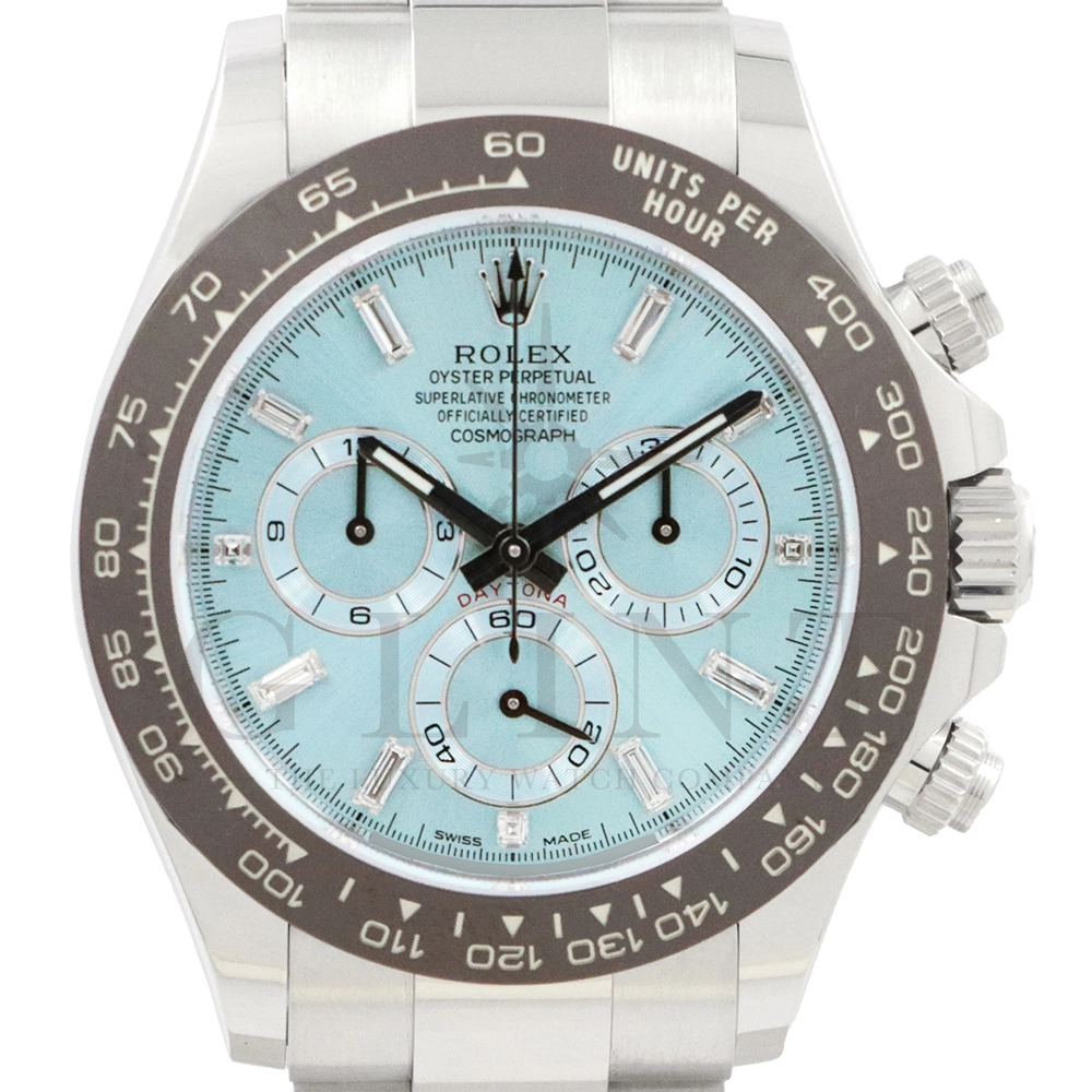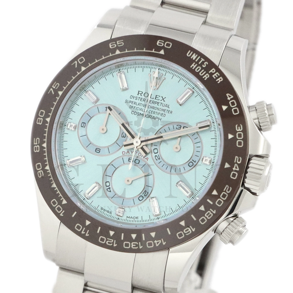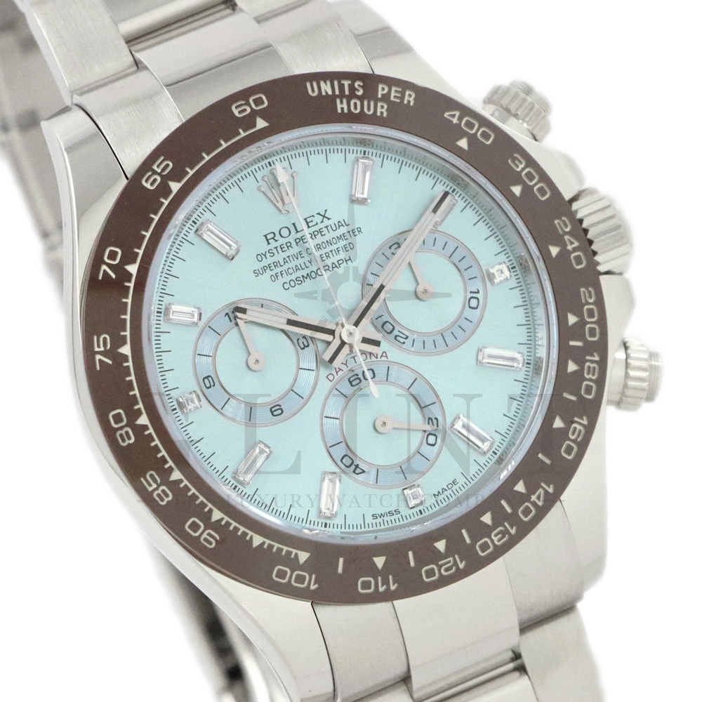 ロレックス デイトナ アイスブルー11Pダイヤモデルです。デイトナ生誕50周年を記念して登場したデイトナ史上初となるプラチナ仕様のモデル。こちらのRef.116506Aはアイスブルーダイアルのインデックスにバゲットダイヤモンドが8石、ラウンドブリリアントカットのダイヤモンドが3石セッティングされております。従来のインダイヤルはチェスナットブラウンカラーの外周でしたが、こちらのインダイヤルはダイヤルカラーと同じくアイスブルーとなっており、より高級感を感じさせてくれる仕上がりです。サンレイ仕上げの文字盤がより美しくアイスブルーを表現してくれます。ロレックス独自の強靭なセラミック素材となるセラクロムベゼルに使用されたチェスナットブラウンカラーとの相性は絶妙で、一目で特別なモデルと感じさせてくれるでしょう。数ある種類のデイトナの中でも圧倒的なステータスを与えてくれる至極の一本です。
