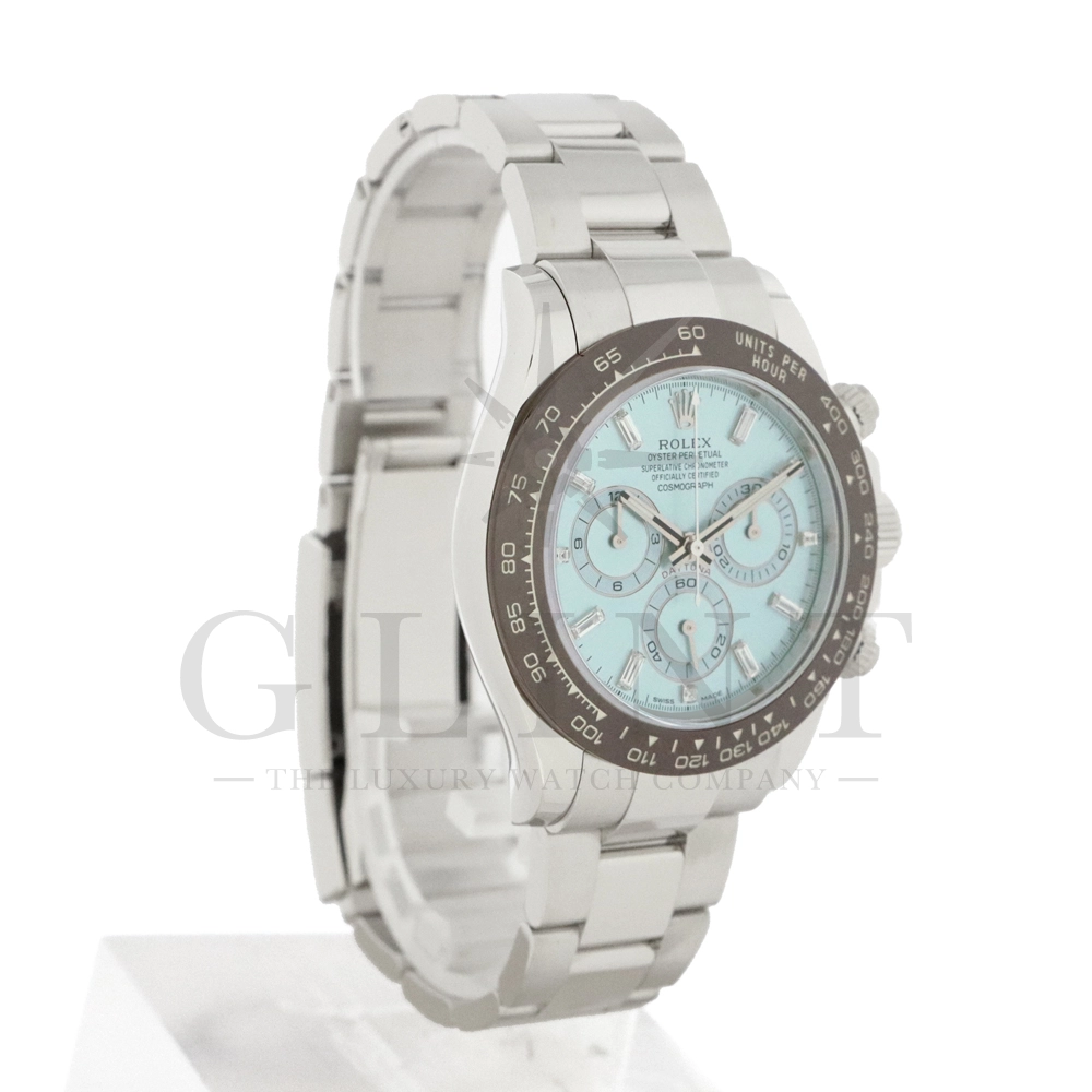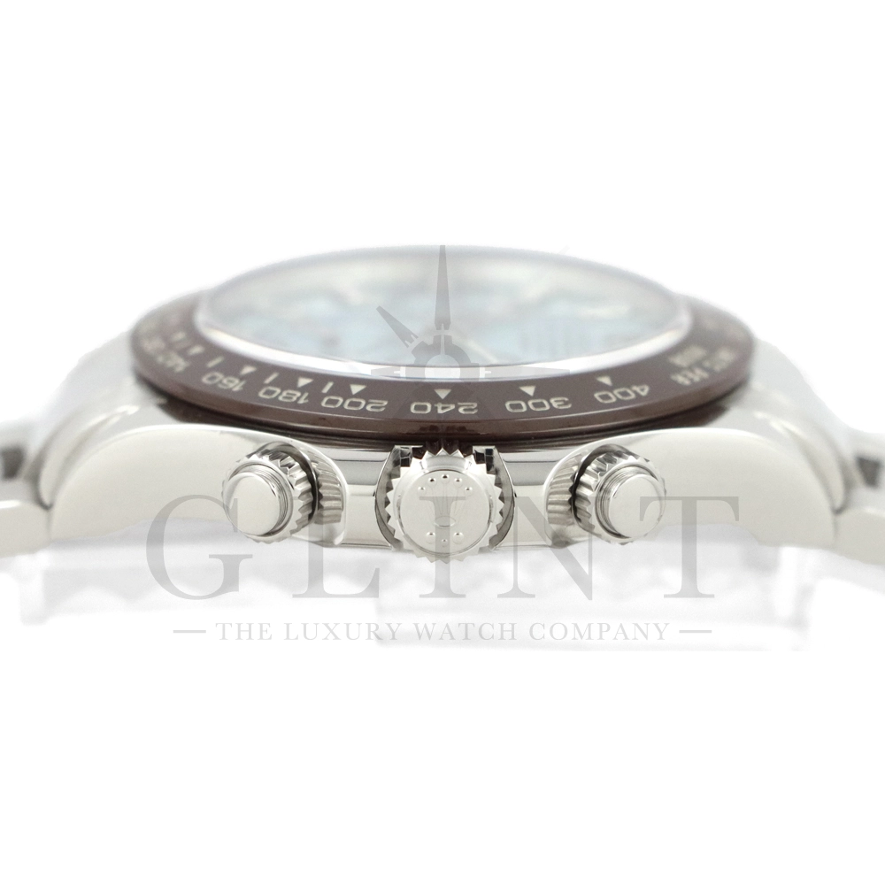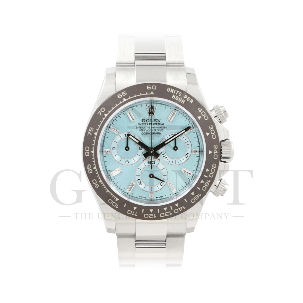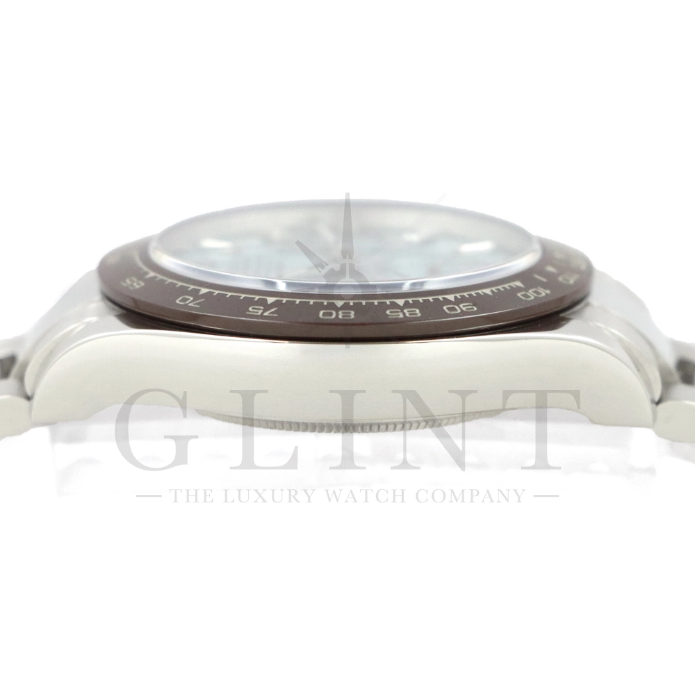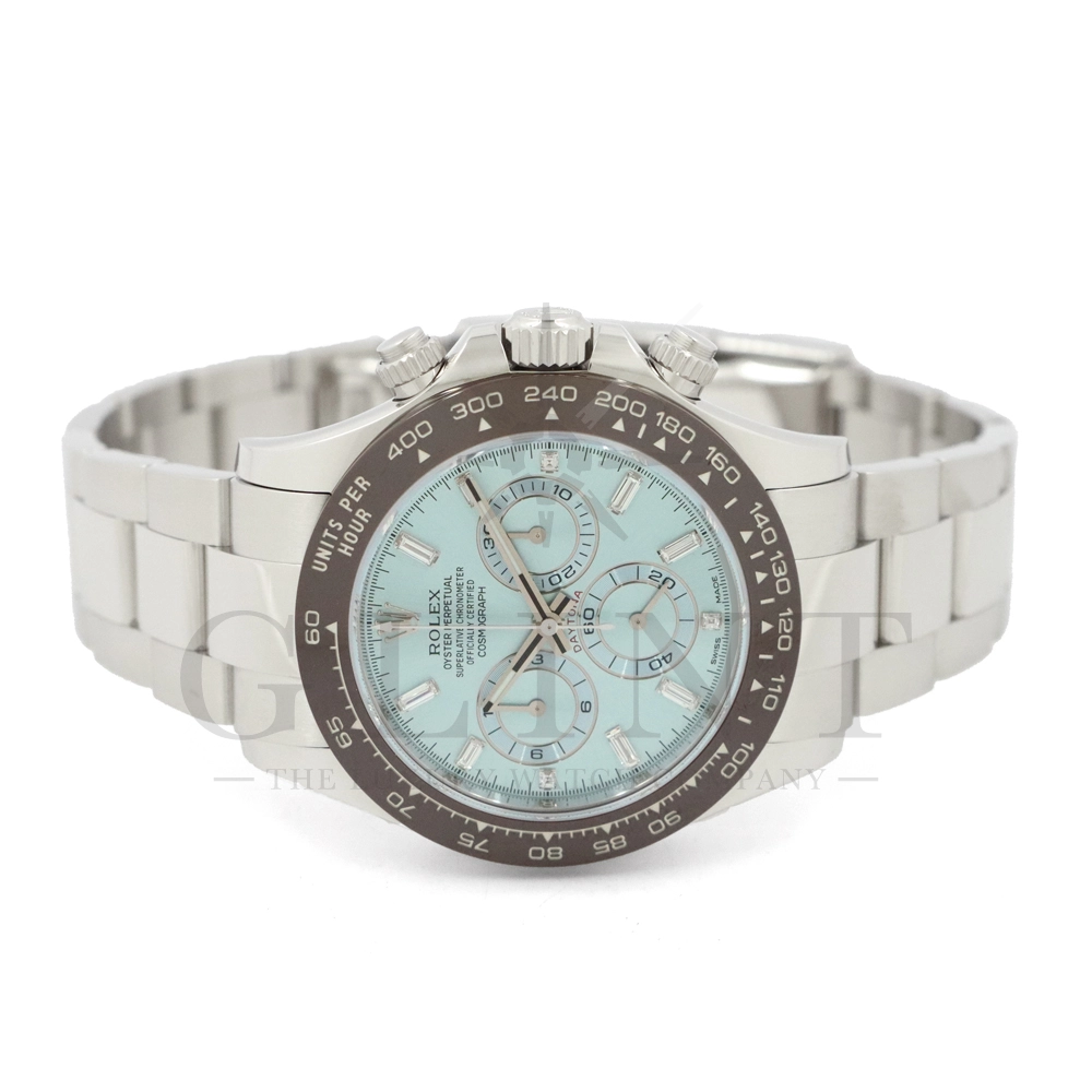 ロレックス デイトナ アイスブルー11Pダイヤモデルです。デイトナ生誕50周年を記念して登場したデイトナ史上初となるプラチナ仕様のモデル。こちらのRef.116506Aはアイスブルーダイアルのインデックスにバゲットダイヤモンドが8石、ラウンドブリリアントカットのダイヤモンドが3石セッティングされております。従来のインダイヤルはチェスナットブラウンカラーの外周でしたが、こちらのインダイヤルはダイヤルカラーと同じくアイスブルーとなっており、より高級感を感じさせてくれる仕上がりです。サンレイ仕上げの文字盤がより美しくアイスブルーを表現してくれます。ロレックス独自の強靭なセラミック素材となるセラクロムベゼルに使用されたチェスナットブラウンカラーとの相性は絶妙で、一目で特別なモデルと感じさせてくれるでしょう。数ある種類のデイトナの中でも圧倒的なステータスを与えてくれる至極の一本です。