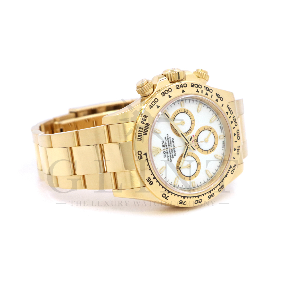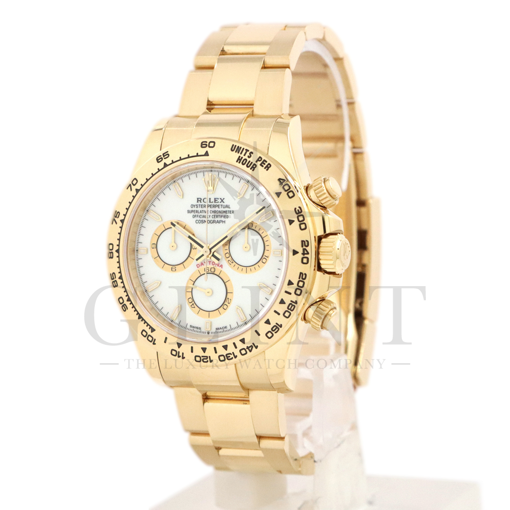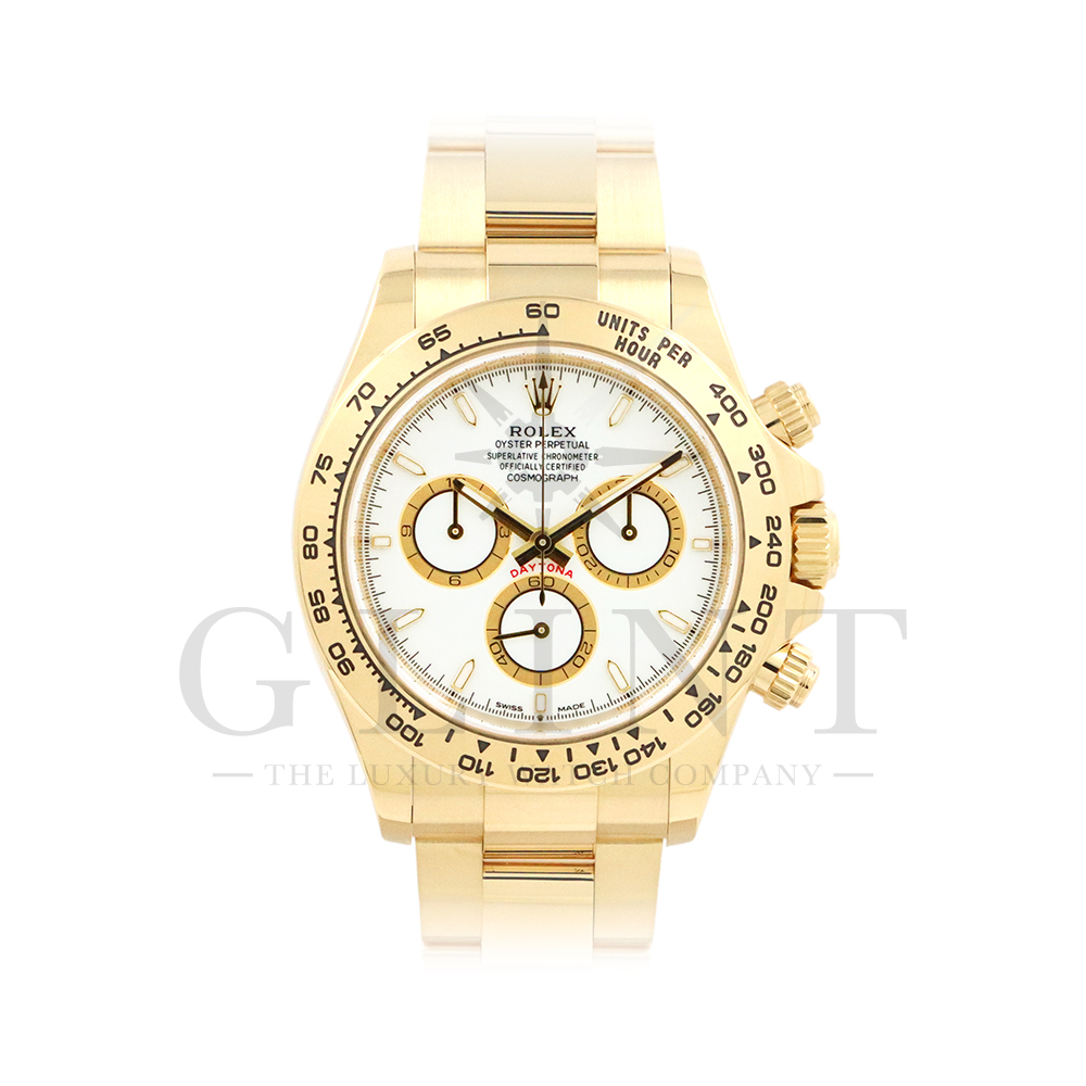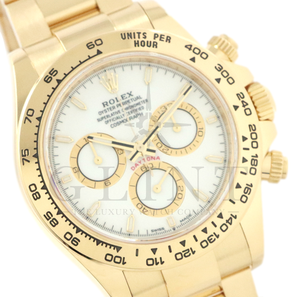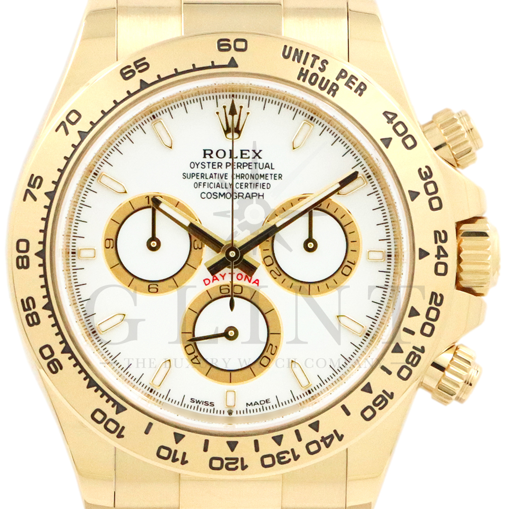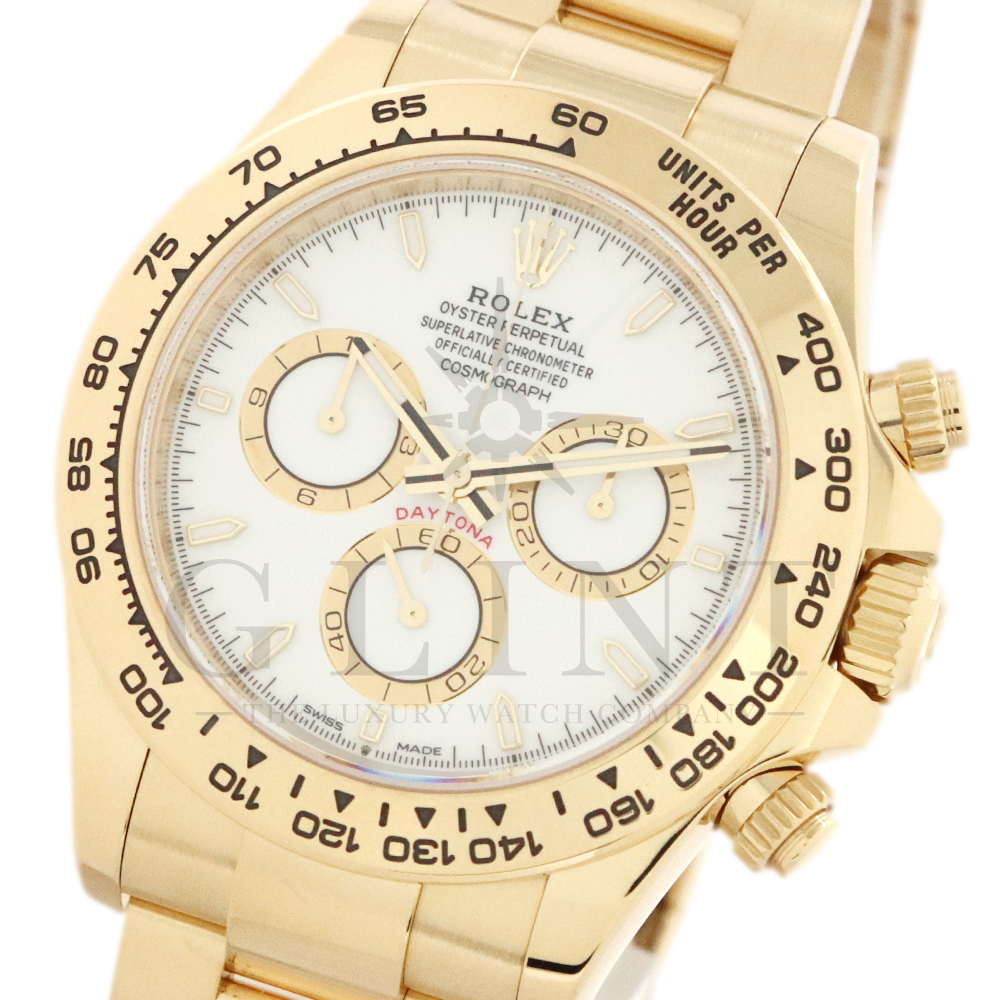 こちらはロレックス デイトナ 126508です。コスモグラフ デイトナ誕生60周年を迎えた2023年に新モデルとして生まれ変わりました。ダイアルのアワーマーカーとカウンター目盛り等のグラフィックバランスが一新され、自社開発・製造の新ムーブメントCal.4131を搭載。エネルギーロスを低減するクロナジー エスケープメント、耐衝撃性に優れるパラフレックス ショック・アブソーバ等の革新技術が採用されております。ケースとブレスレットには18Kイエローゴールドを採用。文字盤にはホワイトカラーにインダイヤルはゴールデンカウンターリングとなっております。さらに進化したデイトナは必ずや所有者を満足させることは間違いありません。