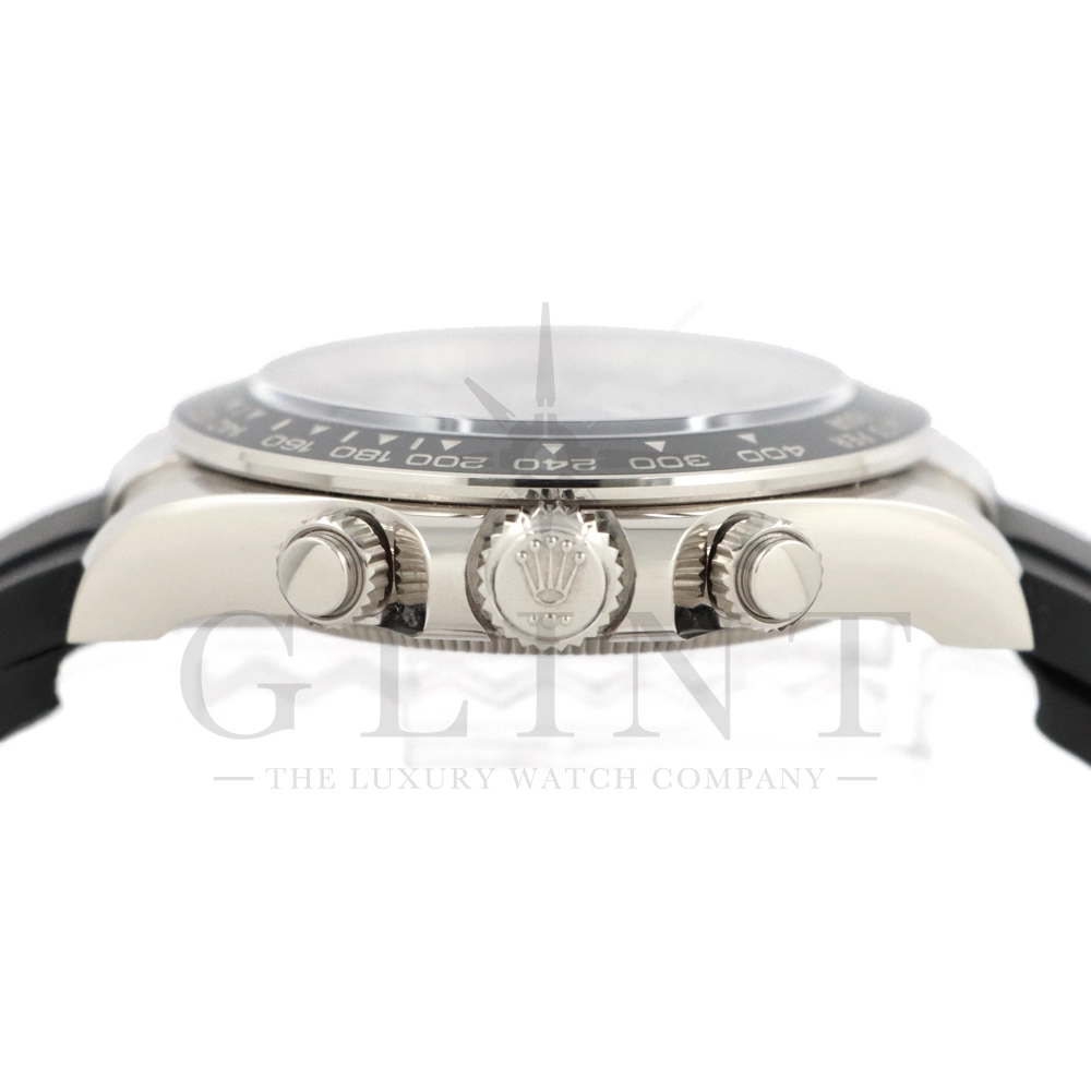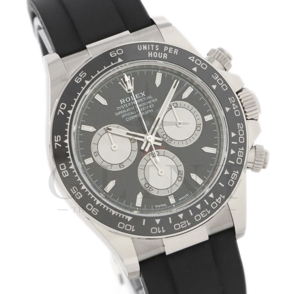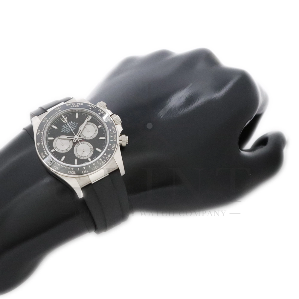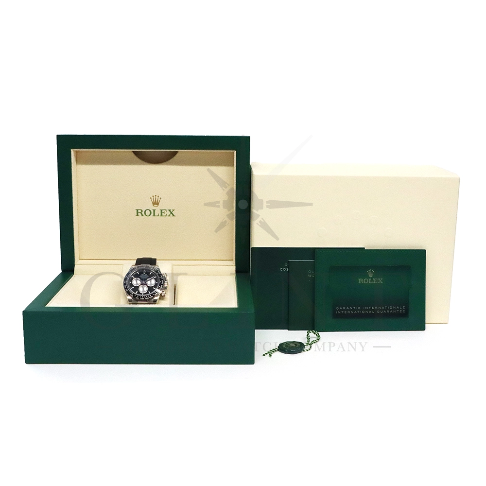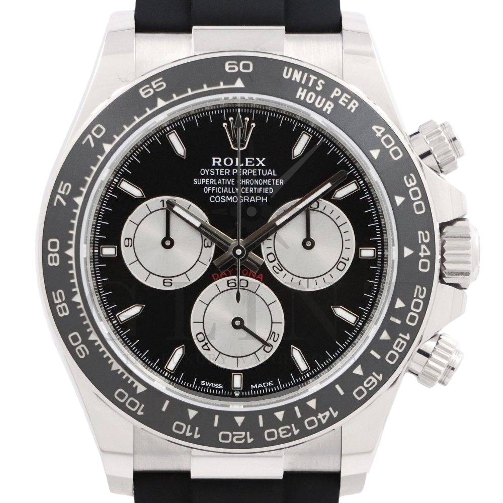 こちらはロレックス デイトナです。コスモグラフ デイトナ誕生60周年を迎えた2023年に新モデルとして生まれ変わりました。ダイアルのアワーマーカーとカウンター目盛り等のグラフィックバランスが一新され、自社開発・製造の新ムーブメントCal.4131を搭載。エネルギーロスを低減するクロナジー エスケープメント、耐衝撃性に優れるパラフレックス ショック・アブソーバ等の革新技術が採用されております。18Kホワイトゴールドのケースに文字盤にはブライトブラックにインダイヤルにはスチールカラー使用。また、バックルもグライドロックエクステンションシステムが搭載された事で容易にサイズを調整できる事で実用性が高まりました。さらに進化したデイトナは必ずや所有者を満足させることは間違いありません。