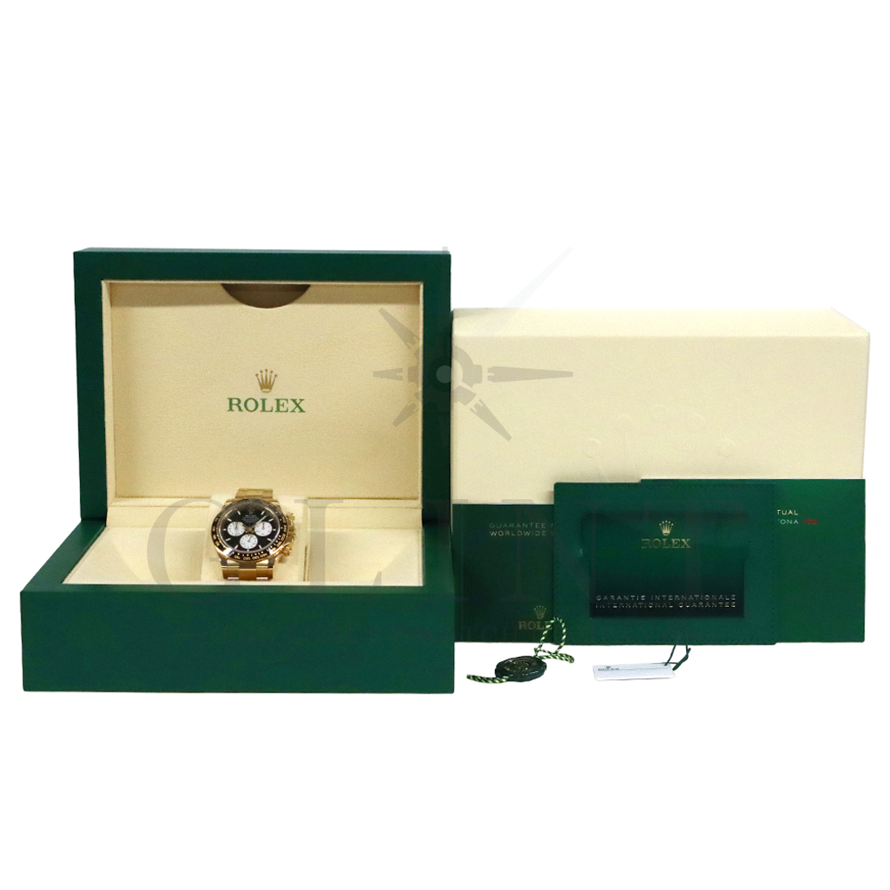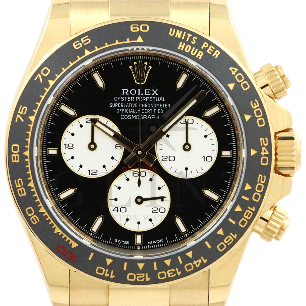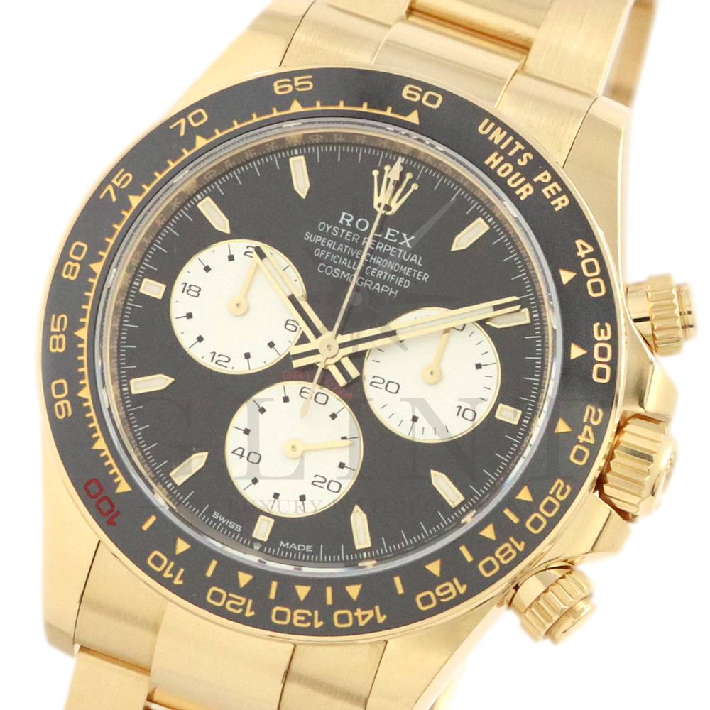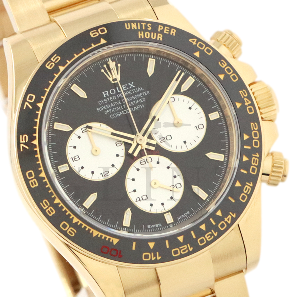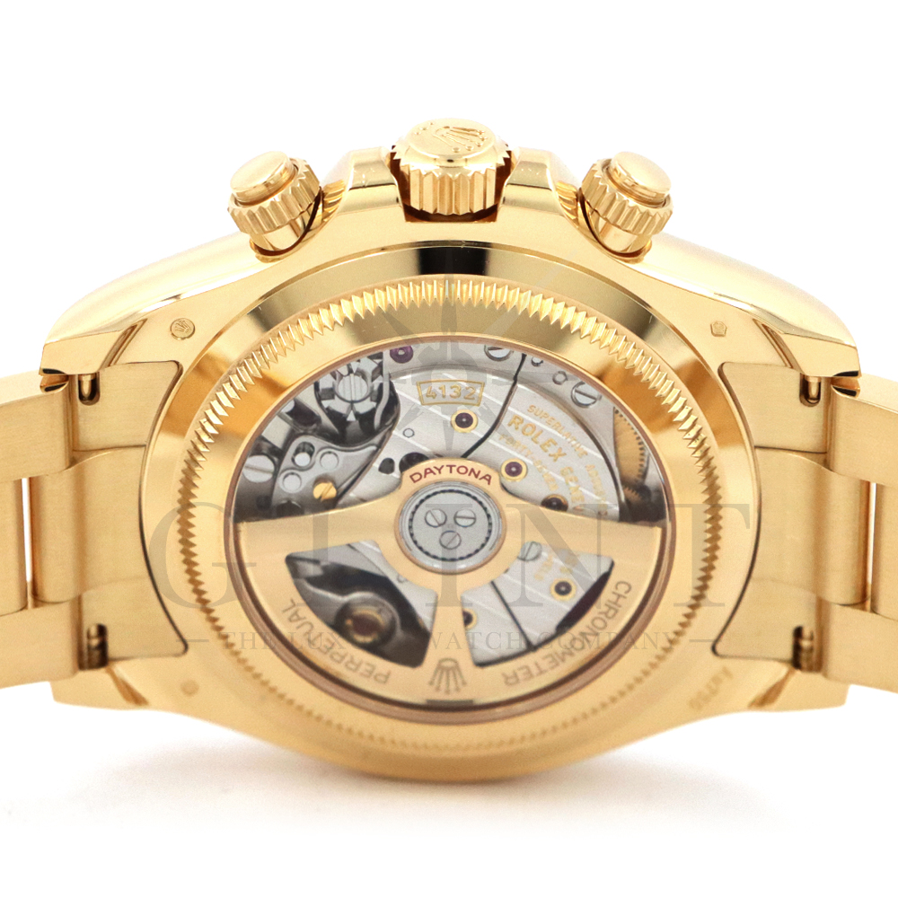 こちらはロレックス デイトナ 126528LNです。2023年のル・マン24時間レース第100回を記念して発表された126529LNのイエローゴールドモデルが登場。同様に文字盤には往年のヴィンテージモデルに見受けられたモチーフ、エキゾチックダイアル(ポール・ニューマンダイアル)を再現しており、イエローゴールドで縁取られたブラックのセラミック製ベゼルには、メーターの「100」がレッドセラミックでコーティング。ムーブメントは126529LNと同じく9時位置の積算計がル・マン24時間レースに因んで12時間から24時間に変更されたことに伴い、Cal.4131をブラッシュアップしたCal.4132を搭載しております。更にケースバックはシースルー化されたことによって、Cal.4132を堪能することができるでしょう。デイトナ60周年、ル・マン24時間レース100周年に相応しい比類なき魅力が存分に詰まった非常に豪華な逸品となっております。