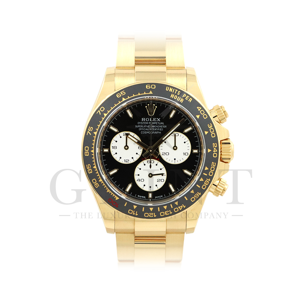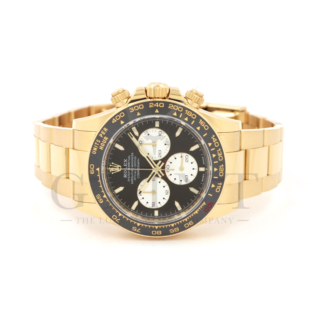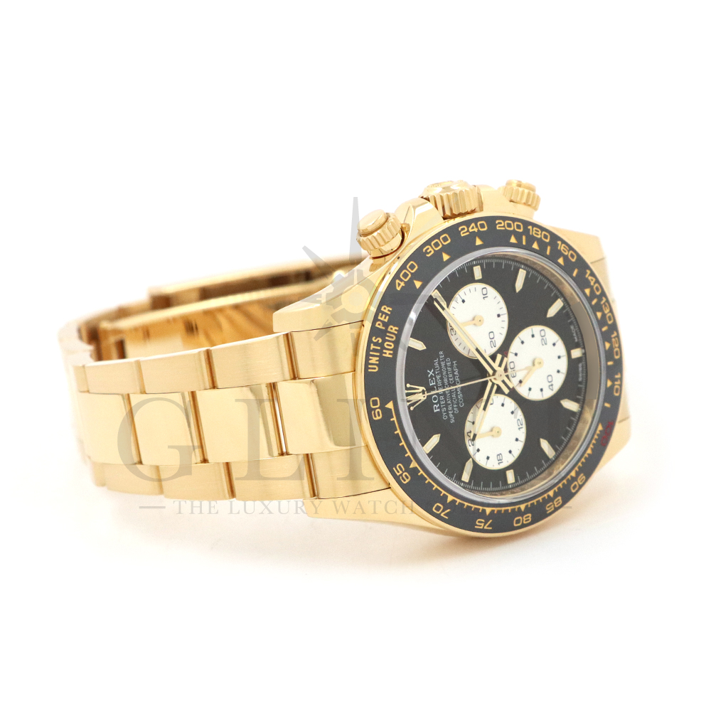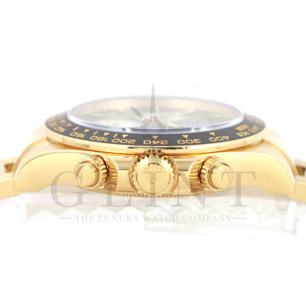 こちらはロレックス デイトナ 126528LNです。2023年のル・マン24時間レース第100回を記念して発表された126529LNのイエローゴールドモデルが登場。同様に文字盤には往年のヴィンテージモデルに見受けられたモチーフ、エキゾチックダイアル(ポール・ニューマンダイアル)を再現しており、イエローゴールドで縁取られたブラックのセラミック製ベゼルには、メーターの「100」がレッドセラミックでコーティング。ムーブメントは126529LNと同じく9時位置の積算計がル・マン24時間レースに因んで12時間から24時間に変更されたことに伴い、Cal.4131をブラッシュアップしたCal.4132を搭載しております。更にケースバックはシースルー化されたことによって、Cal.4132を堪能することができるでしょう。デイトナ60周年、ル・マン24時間レース100周年に相応しい比類なき魅力が存分に詰まった非常に豪華な逸品となっております。