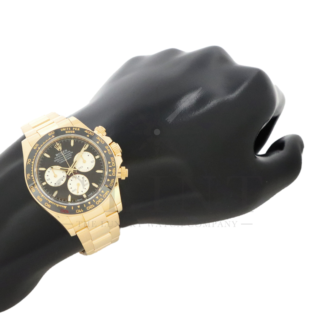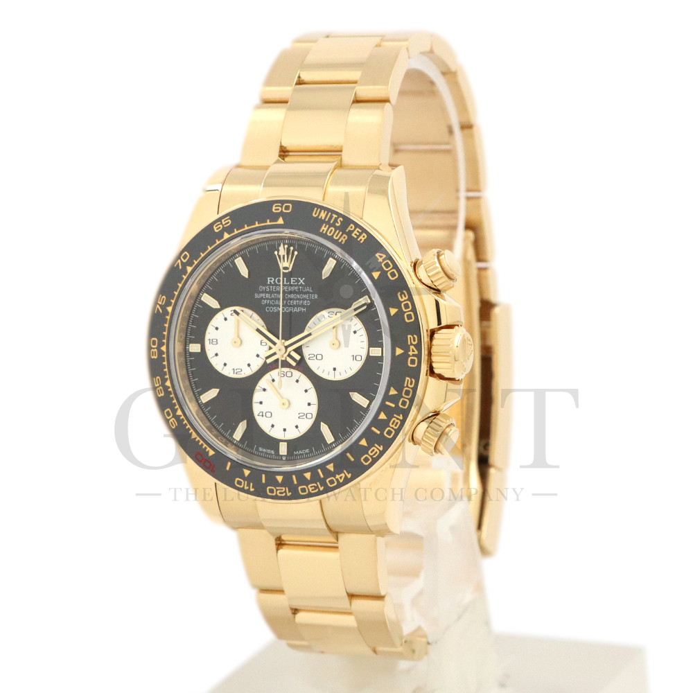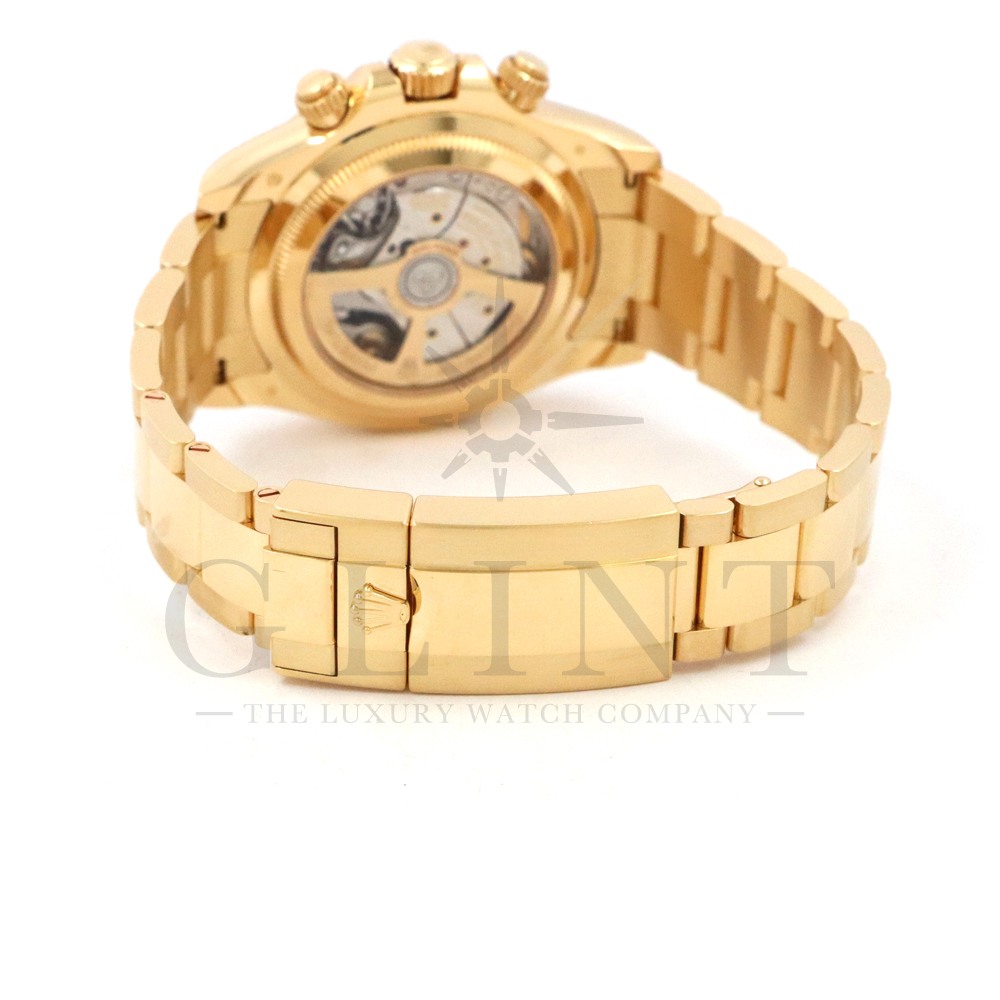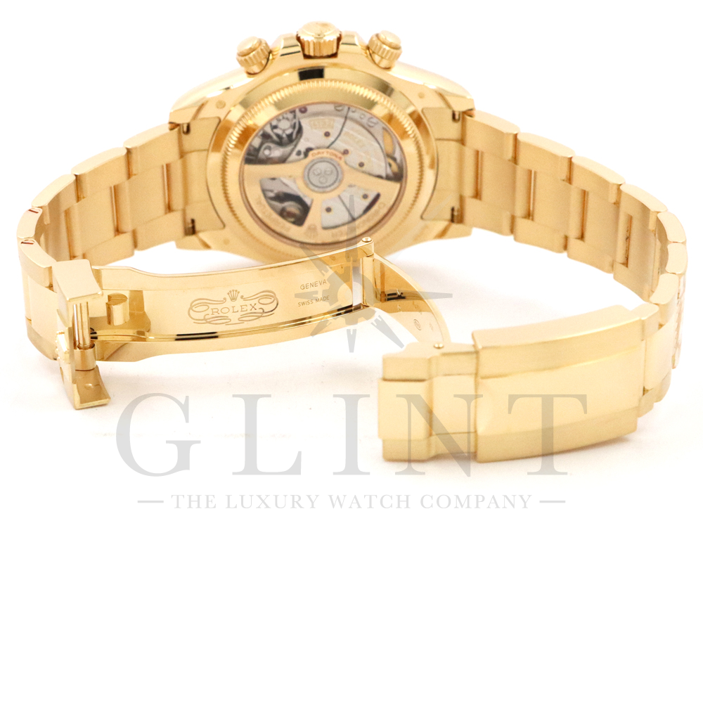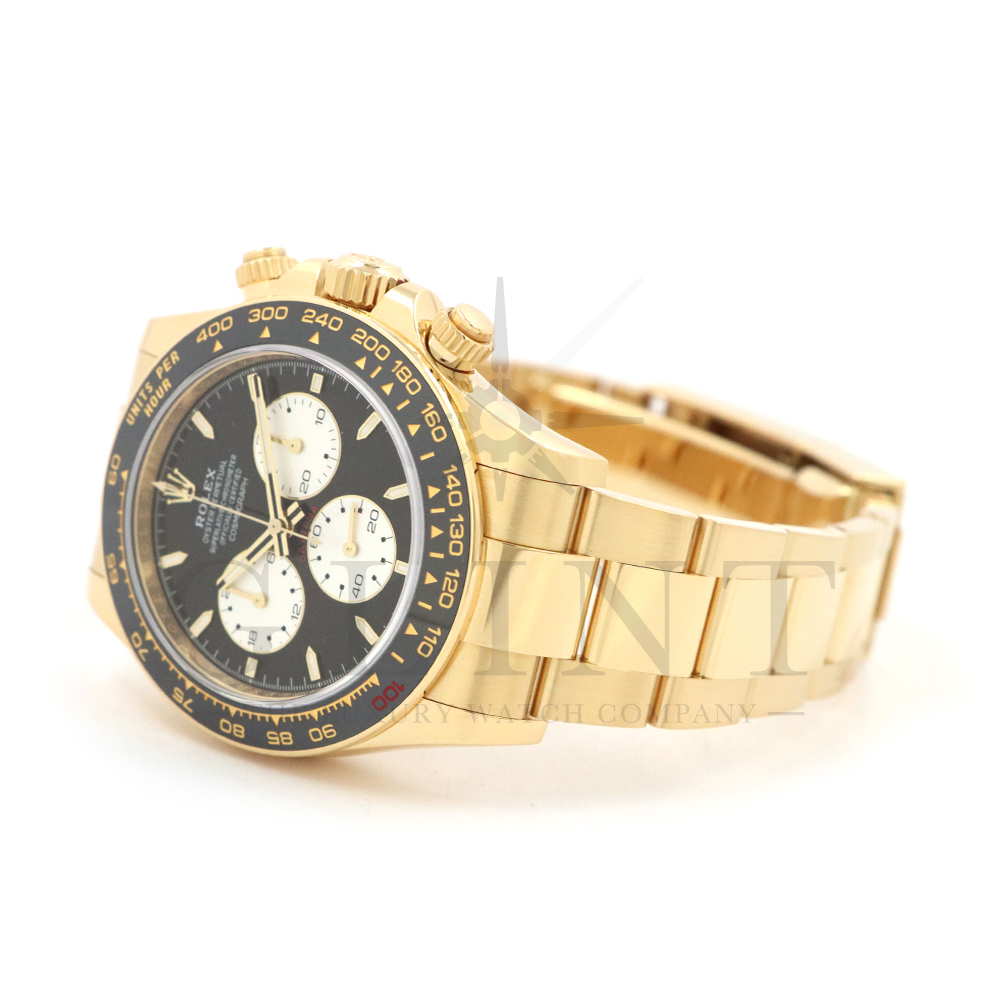 こちらはロレックス デイトナ 126528LNです。2023年のル・マン24時間レース第100回を記念して発表された126529LNのイエローゴールドモデルが登場。同様に文字盤には往年のヴィンテージモデルに見受けられたモチーフ、エキゾチックダイアル(ポール・ニューマンダイアル)を再現しており、イエローゴールドで縁取られたブラックのセラミック製ベゼルには、メーターの「100」がレッドセラミックでコーティング。ムーブメントは126529LNと同じく9時位置の積算計がル・マン24時間レースに因んで12時間から24時間に変更されたことに伴い、Cal.4131をブラッシュアップしたCal.4132を搭載しております。更にケースバックはシースルー化されたことによって、Cal.4132を堪能することができるでしょう。デイトナ60周年、ル・マン24時間レース100周年に相応しい比類なき魅力が存分に詰まった非常に豪華な逸品となっております。