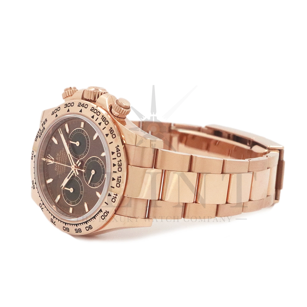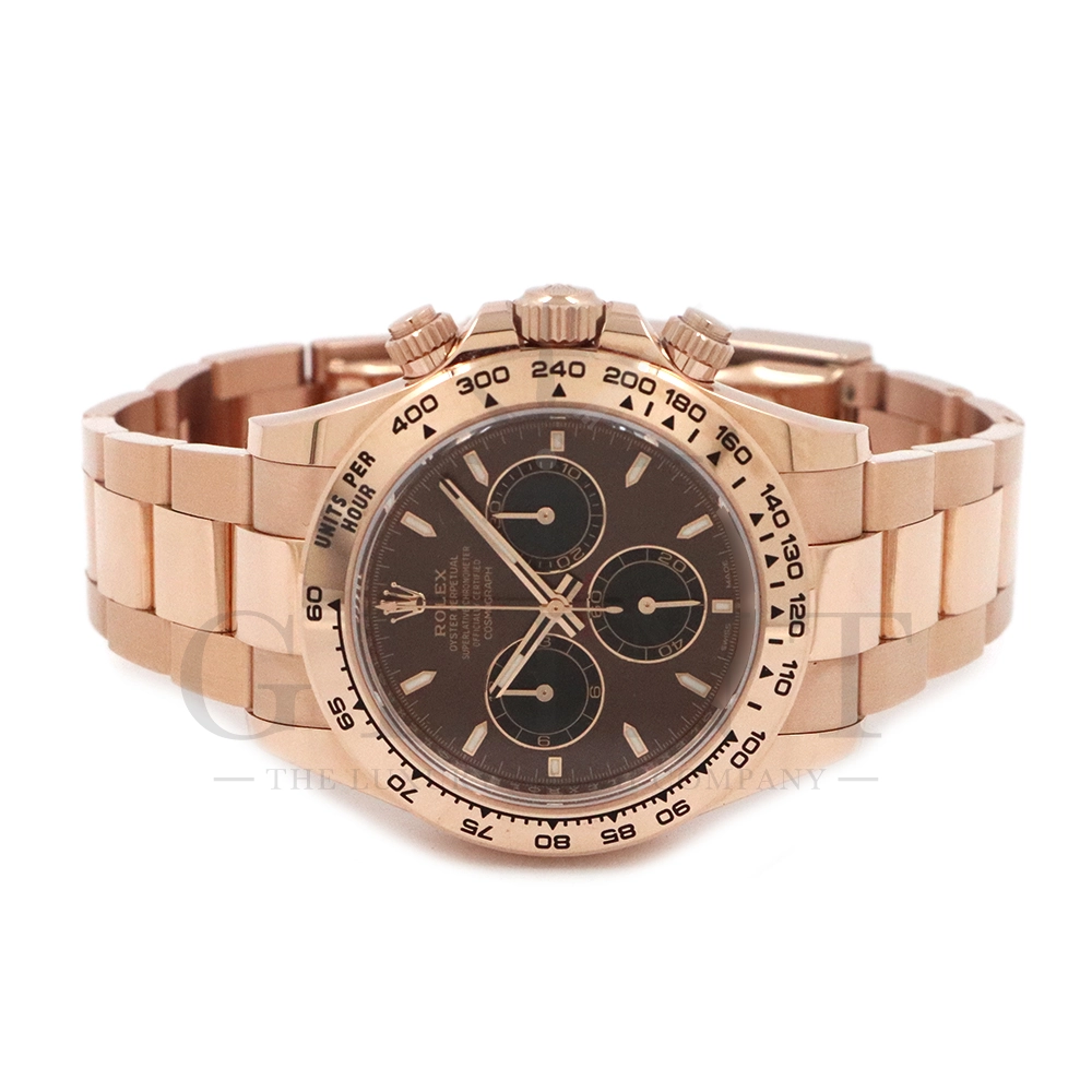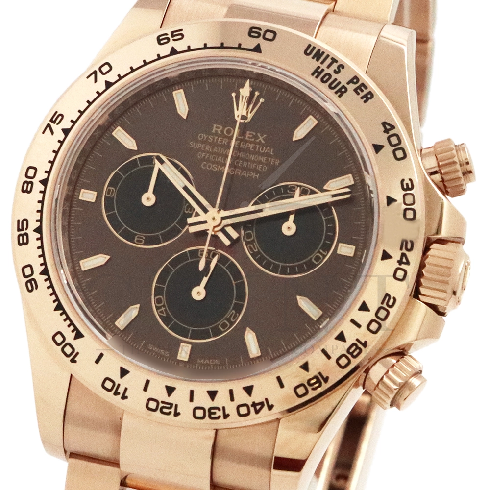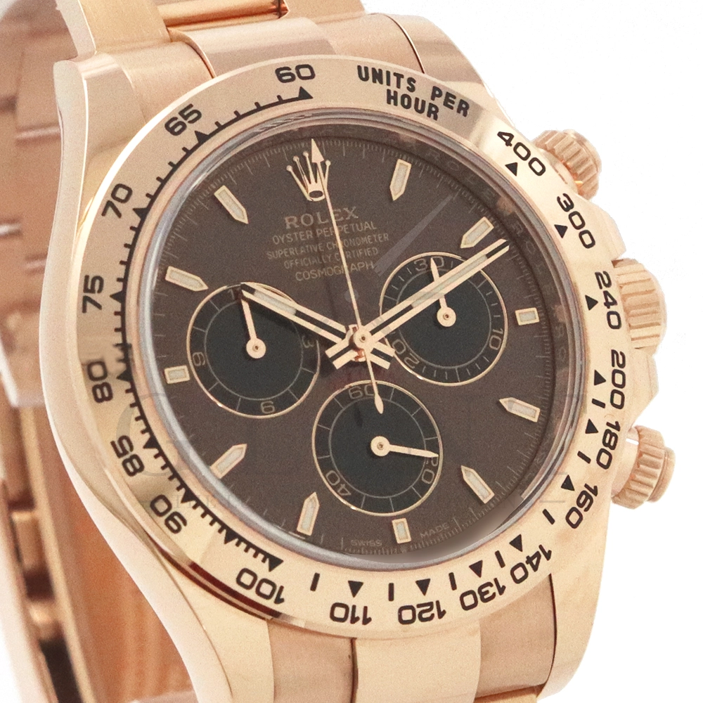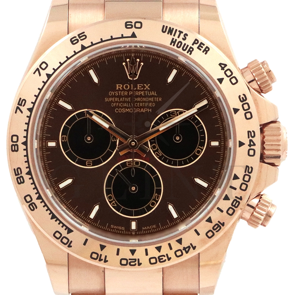 こちらはロレックス デイトナ 126505です。独自の18ctピンクゴールドを自社開発し特許を取得したエバーローズゴールドを素材に使用した豪華なモデル。ロレックスはケース素材を自社専用の鋳造場で調合している唯一のメゾンであり、鮮やかな発色と優れた耐久性を持ち、眩い輝きを保証する最高品質の18ctゴールドを生産しています。ブレスレットに至るまで贅沢にエバーローズゴールドを使用しており、一目で分かる高級感が所有者を格別な気持ちにさせてくれるでしょう。そしてダイアルは2025年に登場したブライトチョコレートに、インダイアルはブラックの仕様となっております。自社開発・製造の新ムーブメントCal.4131を搭載し、プッシュボタンで操作可能な秒・分・時のクロノグラフ、タキメーターベゼルなど機能性も十分に備わったロレックスを代表するデイトナ。お客様の最高のパートナーとして腕元で優雅なひと時を刻んでくれる事は間違いありません。