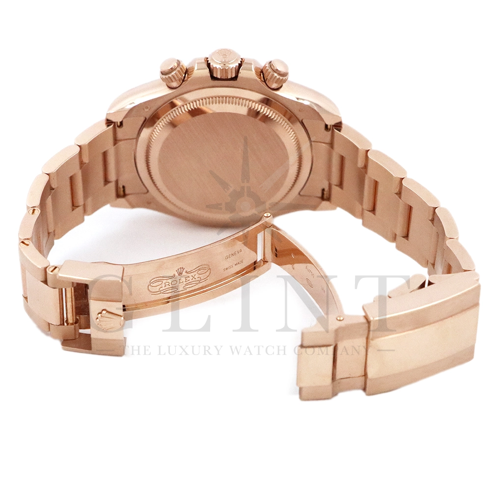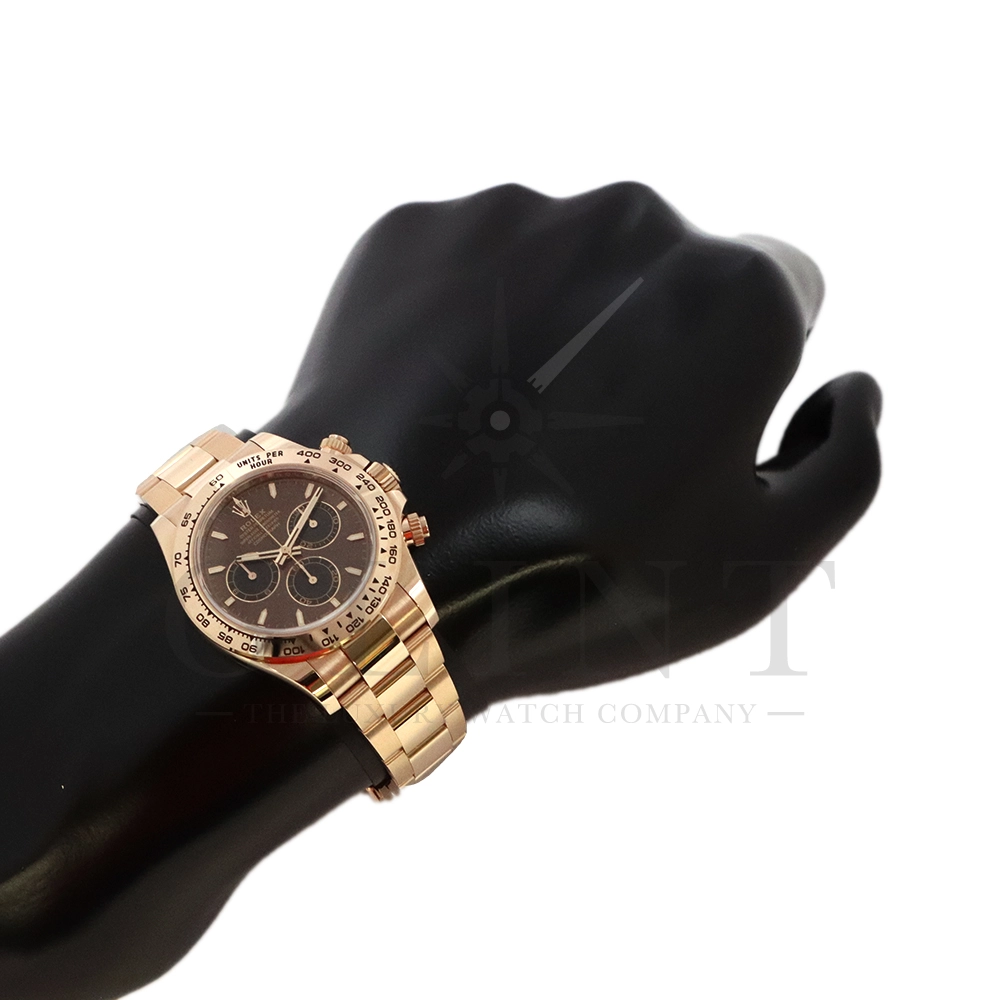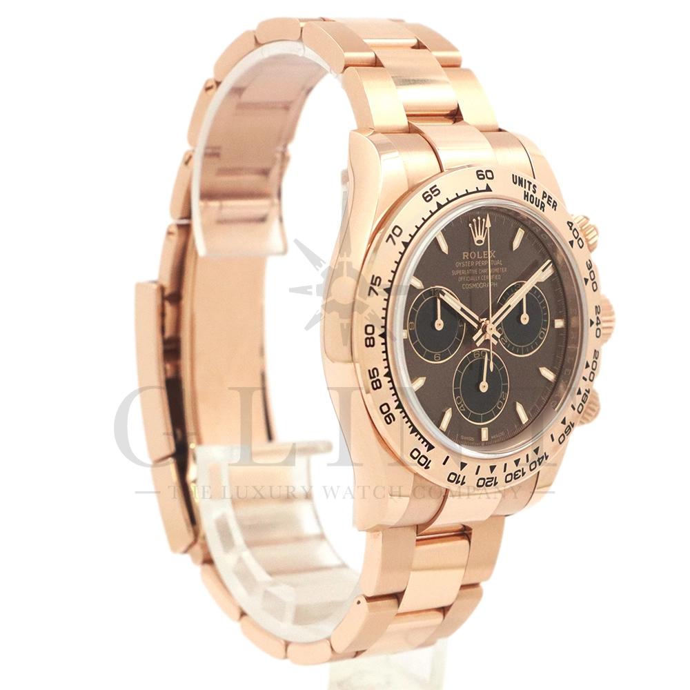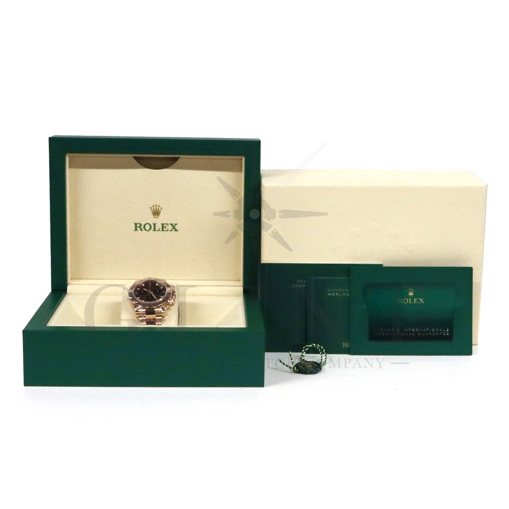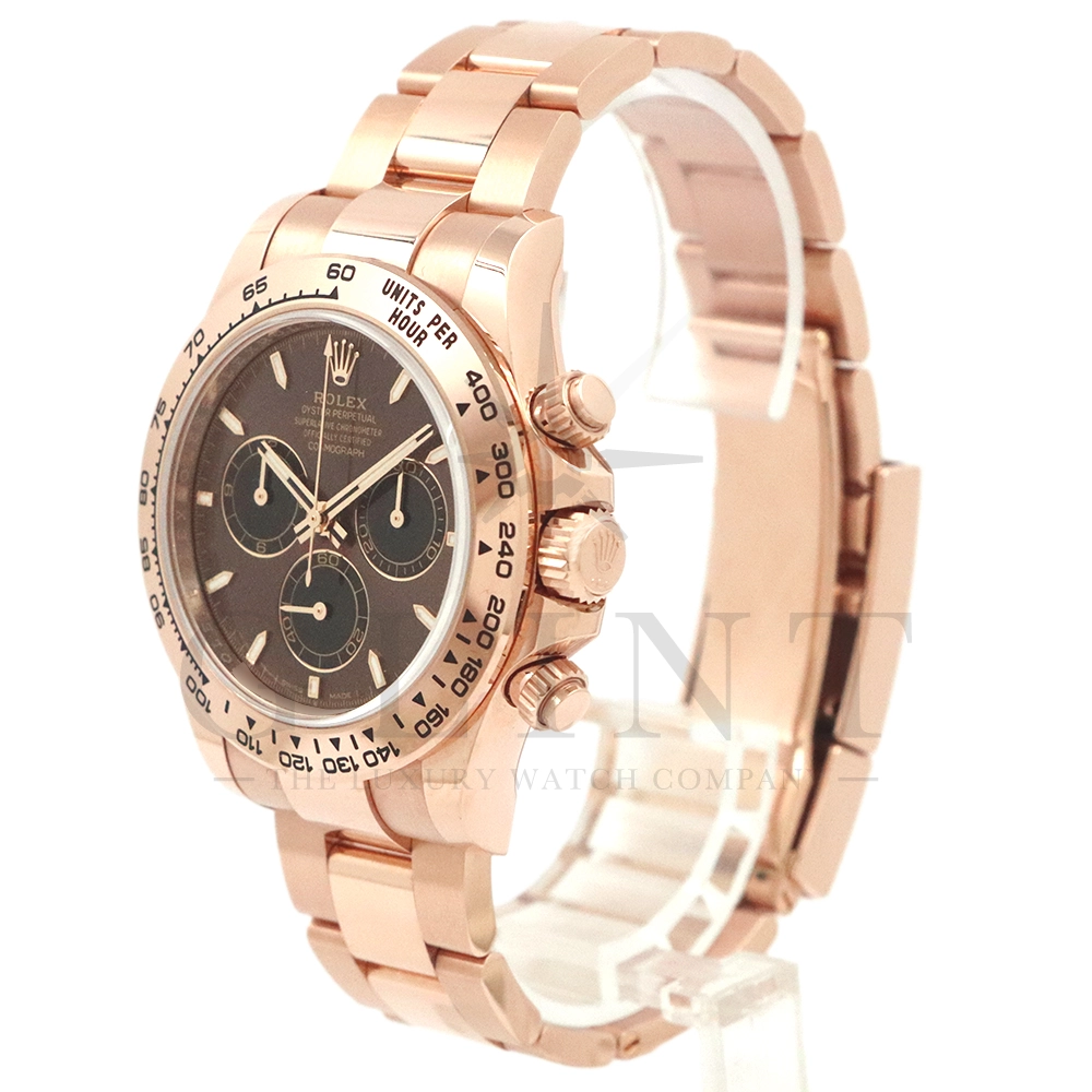 こちらはロレックス デイトナ 126505です。独自の18ctピンクゴールドを自社開発し特許を取得したエバーローズゴールドを素材に使用した豪華なモデル。ロレックスはケース素材を自社専用の鋳造場で調合している唯一のメゾンであり、鮮やかな発色と優れた耐久性を持ち、眩い輝きを保証する最高品質の18ctゴールドを生産しています。ブレスレットに至るまで贅沢にエバーローズゴールドを使用しており、一目で分かる高級感が所有者を格別な気持ちにさせてくれるでしょう。そしてダイアルは2025年に登場したブライトチョコレートに、インダイアルはブラックの仕様となっております。自社開発・製造の新ムーブメントCal.4131を搭載し、プッシュボタンで操作可能な秒・分・時のクロノグラフ、タキメーターベゼルなど機能性も十分に備わったロレックスを代表するデイトナ。お客様の最高のパートナーとして腕元で優雅なひと時を刻んでくれる事は間違いありません。