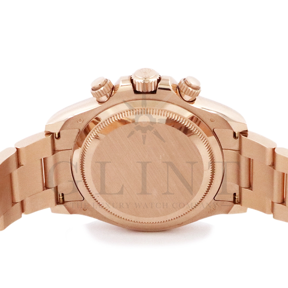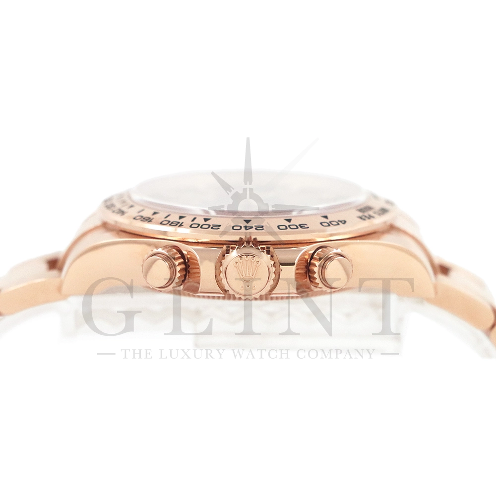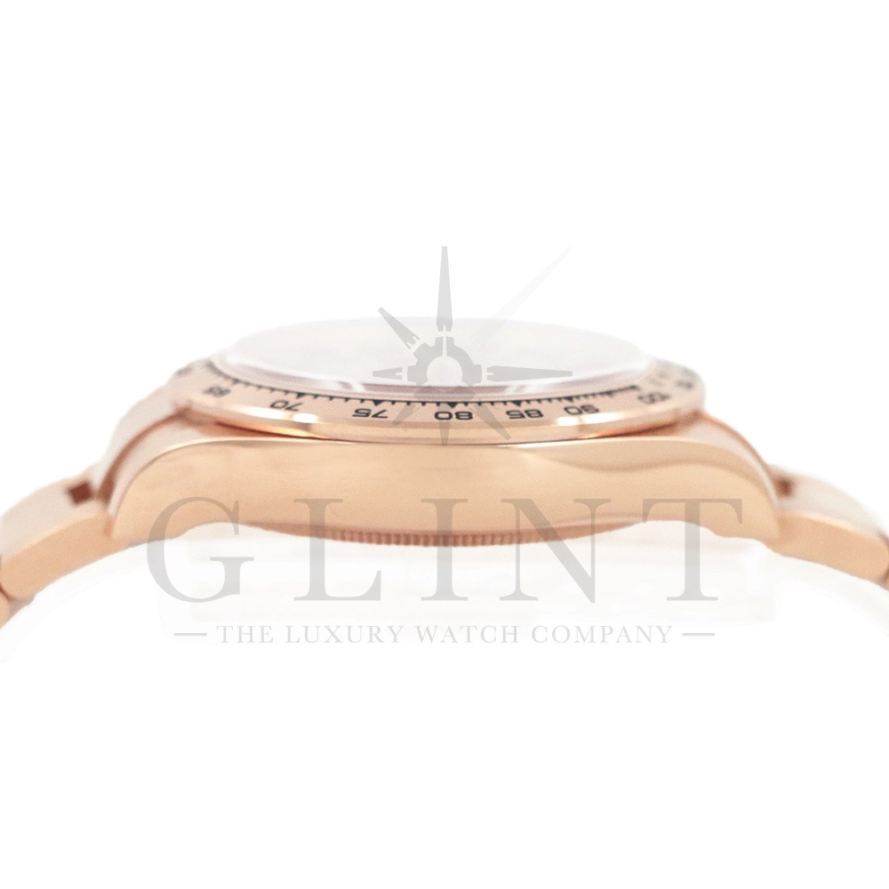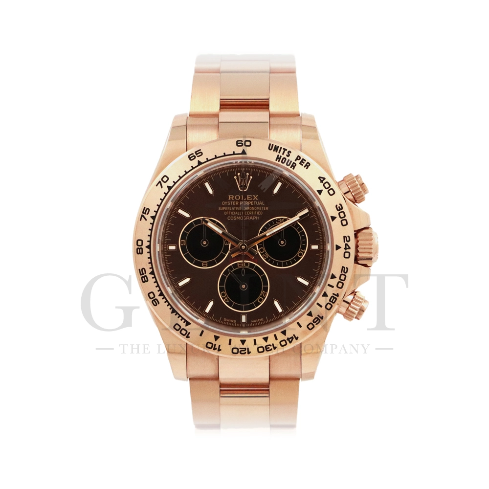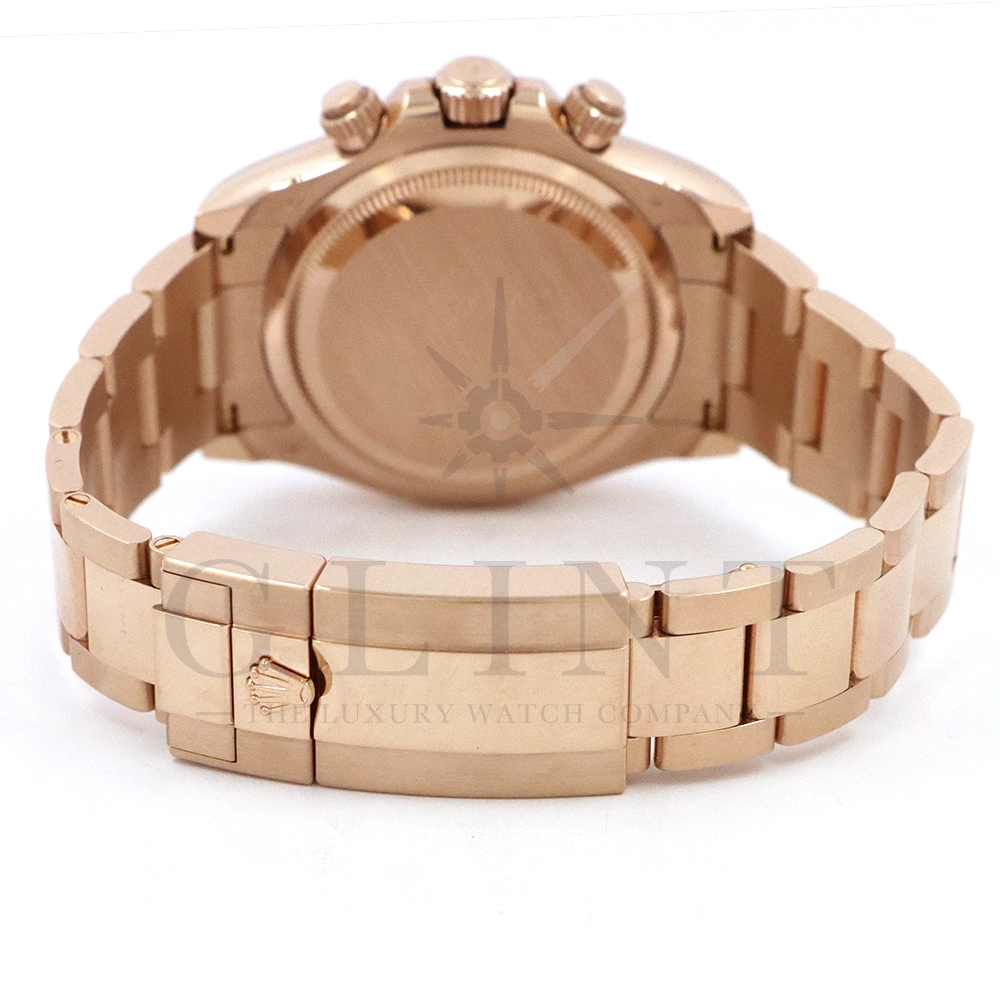 こちらはロレックス デイトナ 126505です。独自の18ctピンクゴールドを自社開発し特許を取得したエバーローズゴールドを素材に使用した豪華なモデル。ロレックスはケース素材を自社専用の鋳造場で調合している唯一のメゾンであり、鮮やかな発色と優れた耐久性を持ち、眩い輝きを保証する最高品質の18ctゴールドを生産しています。ブレスレットに至るまで贅沢にエバーローズゴールドを使用しており、一目で分かる高級感が所有者を格別な気持ちにさせてくれるでしょう。そしてダイアルは2025年に登場したブライトチョコレートに、インダイアルはブラックの仕様となっております。自社開発・製造の新ムーブメントCal.4131を搭載し、プッシュボタンで操作可能な秒・分・時のクロノグラフ、タキメーターベゼルなど機能性も十分に備わったロレックスを代表するデイトナ。お客様の最高のパートナーとして腕元で優雅なひと時を刻んでくれる事は間違いありません。