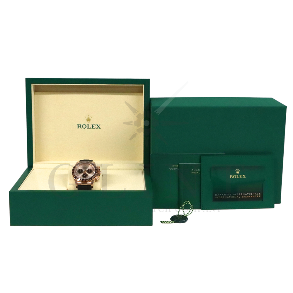 こちらはロレックス デイトナです。コスモグラフ デイトナ誕生60周年を迎えた2023年に新モデルとして生まれ変わりました。ダイアルのアワーマーカーとカウンター目盛り等のグラフィックバランスが一新され、自社開発・製造の新ムーブメントCal.4131を搭載。エネルギーロスを低減するクロナジー エスケープメント、耐衝撃性に優れるパラフレックス ショック・アブソーバ等の革新技術が採用されております。18Kエバーローズゴールドのケースに文字盤はサンダストにインダイヤルにはブライトブラックを使用。また、バックルもグライドロックエクステンションシステムが搭載された事で容易にサイズを調整できる事で実用性が高まりました。さらに進化したデイトナは必ずや所有者を満足させることは間違いありません。