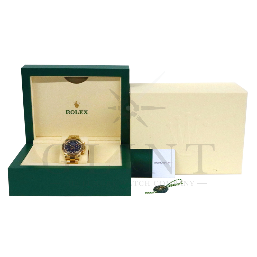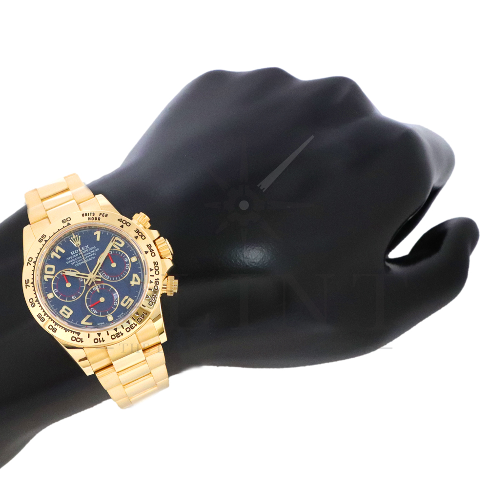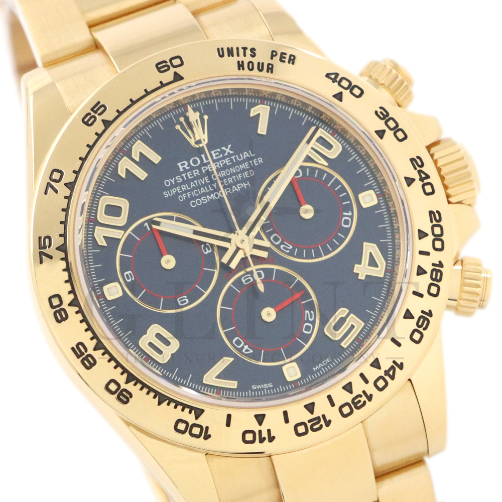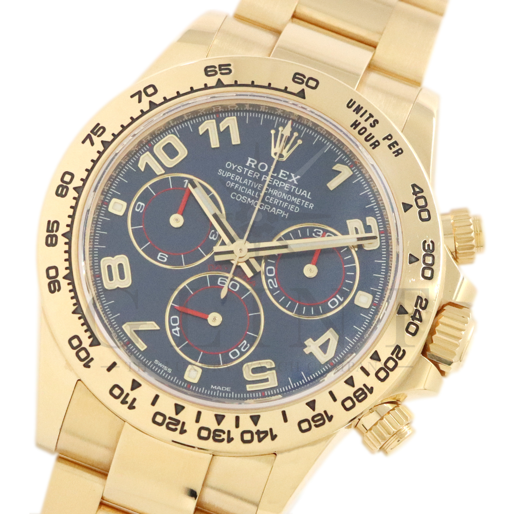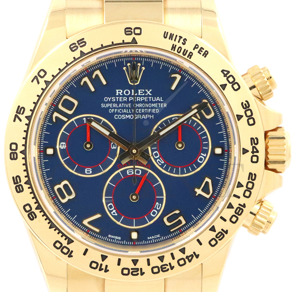 こちらはロレックス デイトナです。18Kイエローゴールドケースに、鮮やかなブルーのアラビアインデックス文字盤を組み合わせた、希少性と個性を兼ね備えたモデル。深みのあるブルーダイヤルは光の加減によって豊かな表情を見せ、スポーティでありながらラグジュアリーな雰囲気を演出してくれるでしょう。視認性に優れたアラビア数字インデックスが、通常のバーインデックスモデルとは一線を画す印象を与えます。クロノグラフ機能を備えた実用性の高さに加え、自社製ムーブメントによる高精度も魅力のひとつです。重厚感のあるイエローゴールドブレスレットは腕元に確かな存在感をもたらし、特別なシーンはもちろん日常使いでもラグジュアリーなスタイルを引き立てます。市場流通数が限られているブルーアラビア文字盤は、他の人と被りにくい一本です。唯一無二の個性とロレックスの技術力が融合した、ワンランク上のデイトナをぜひご堪能ください。