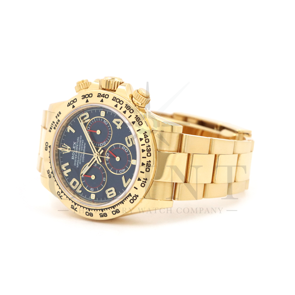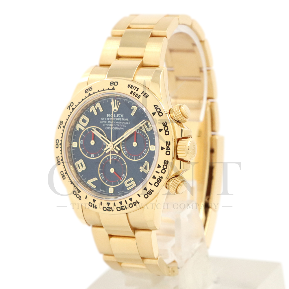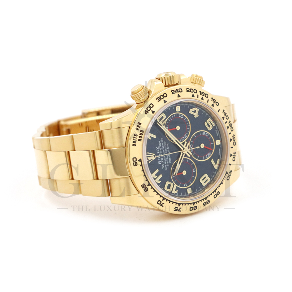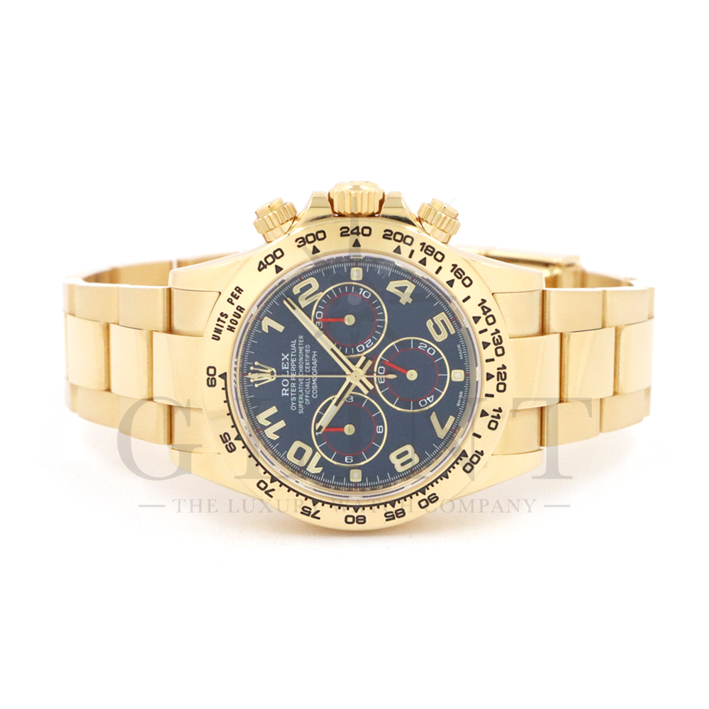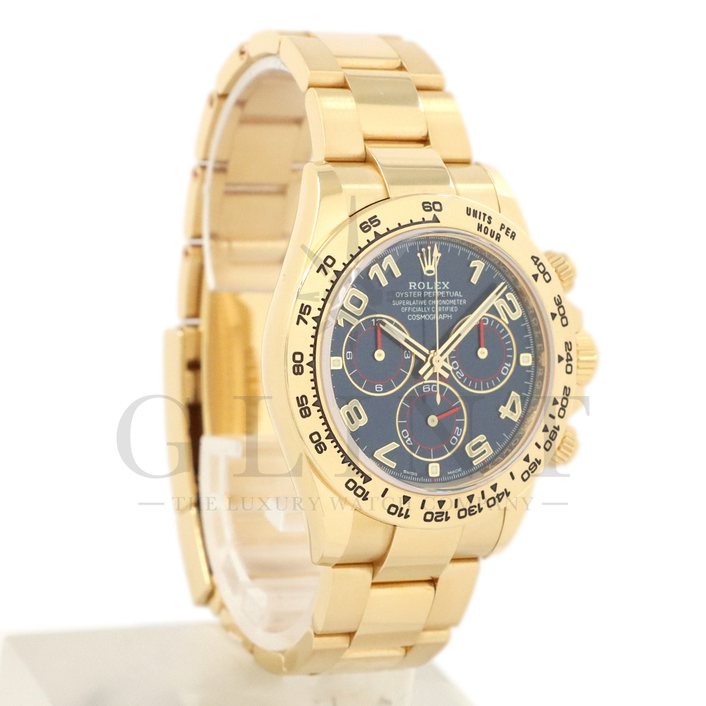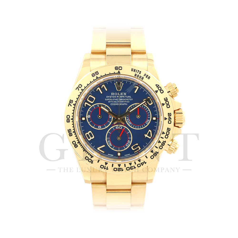 こちらはロレックス デイトナです。18Kイエローゴールドケースに、鮮やかなブルーのアラビアインデックス文字盤を組み合わせた、希少性と個性を兼ね備えたモデル。深みのあるブルーダイヤルは光の加減によって豊かな表情を見せ、スポーティでありながらラグジュアリーな雰囲気を演出してくれるでしょう。視認性に優れたアラビア数字インデックスが、通常のバーインデックスモデルとは一線を画す印象を与えます。クロノグラフ機能を備えた実用性の高さに加え、自社製ムーブメントによる高精度も魅力のひとつです。重厚感のあるイエローゴールドブレスレットは腕元に確かな存在感をもたらし、特別なシーンはもちろん日常使いでもラグジュアリーなスタイルを引き立てます。市場流通数が限られているブルーアラビア文字盤は、他の人と被りにくい一本です。唯一無二の個性とロレックスの技術力が融合した、ワンランク上のデイトナをぜひご堪能ください。
