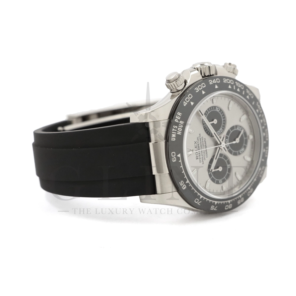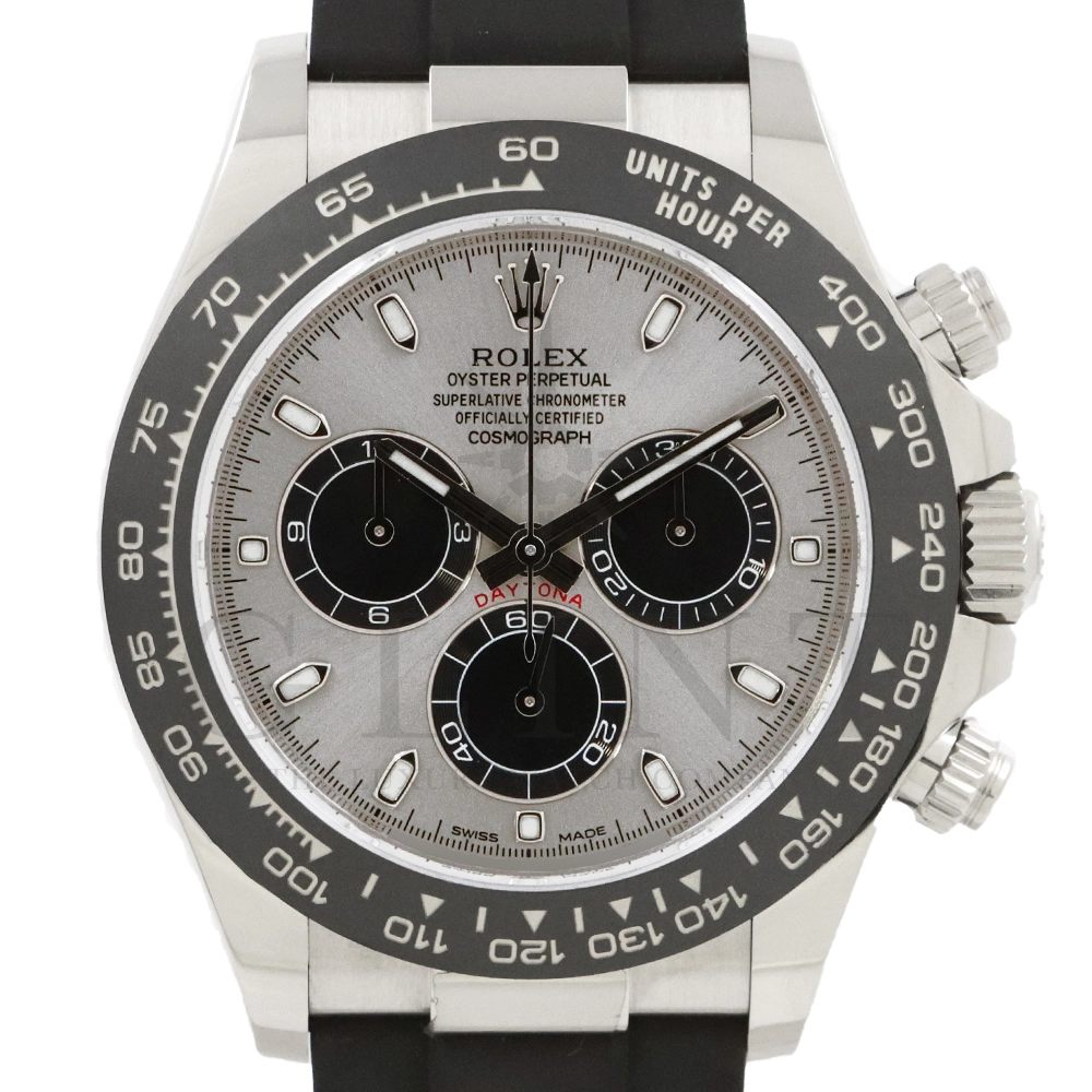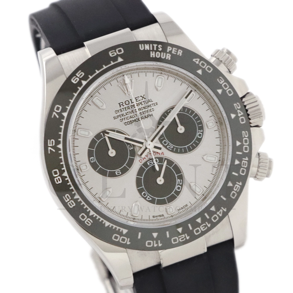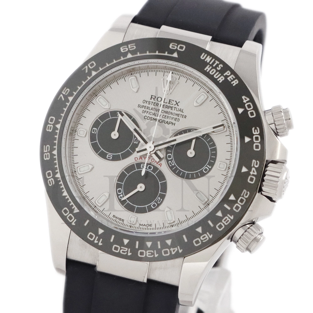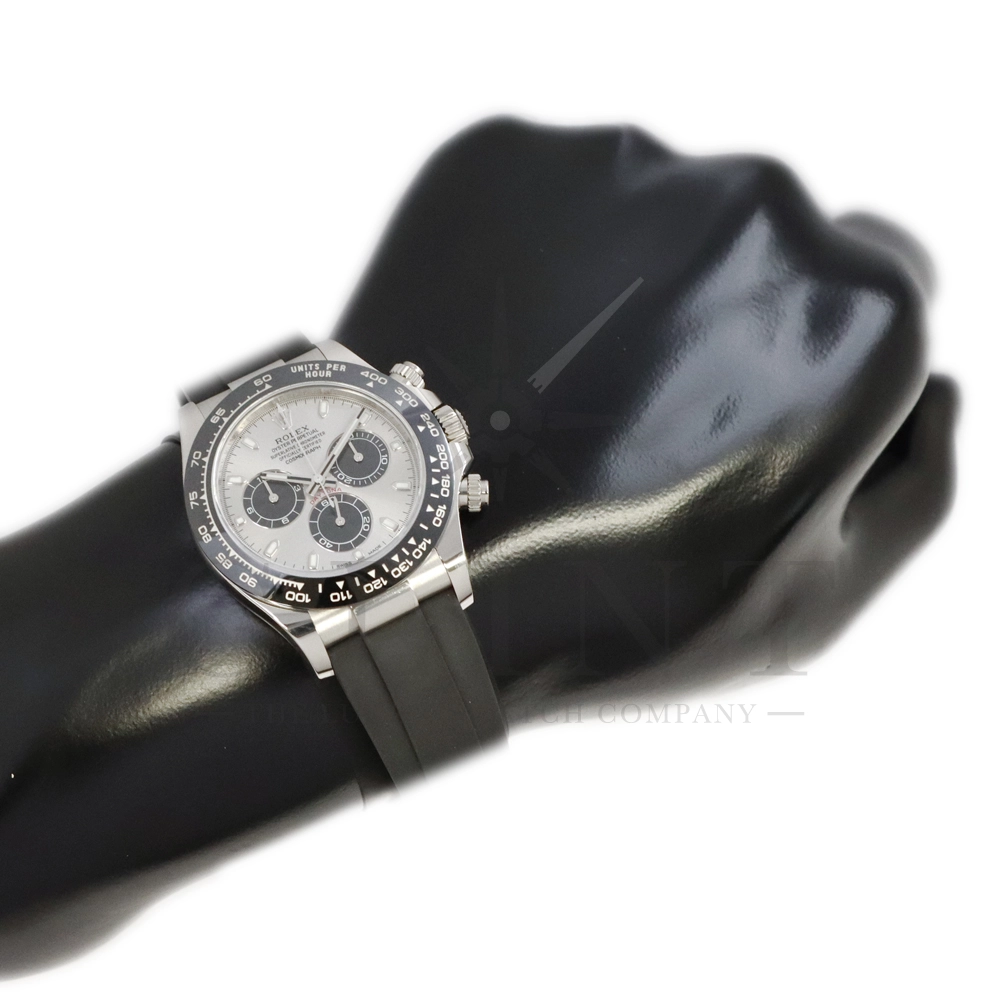 こちらはロレックス デイトナ 116519LNです。ケース素材に18Kホワイトゴールドを使用したモデルです。ベゼルにはホワイトゴールドモデルのデイトナでは初となるセラクロムベゼルを採用。同モデル特有の絶妙なスチール&ブラックのダイアルカラーが洗練された印象を与えてくれます。そして一番の変更点と言えば、これまでのレザーブレスから「オイスターフレックス・ブレスレット」と呼ばれるラバーベルトに変わった点ではないでしょうか。こちらのブレスレットは、軟性のあるチタン・ニッケル合金製ブレードを、しなやかで装着感に優れるエラストマー(人工ラバー)で覆っており、極めて高い耐久性を実現しております。水や雨も気にならず、普段使いとしても快適に楽しんで頂けるでしょう。スポーティながらも高級感を演出する事も忘れないROLEXが誇る上質な一本です。
