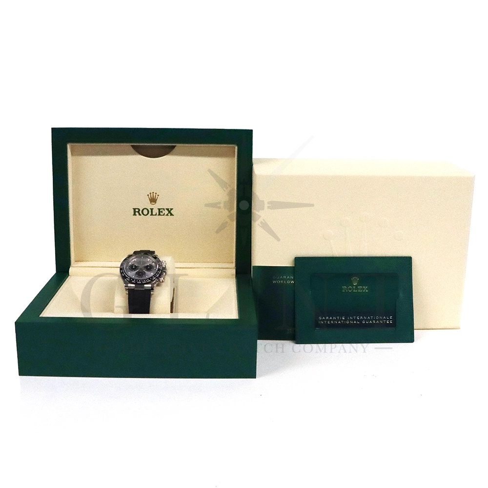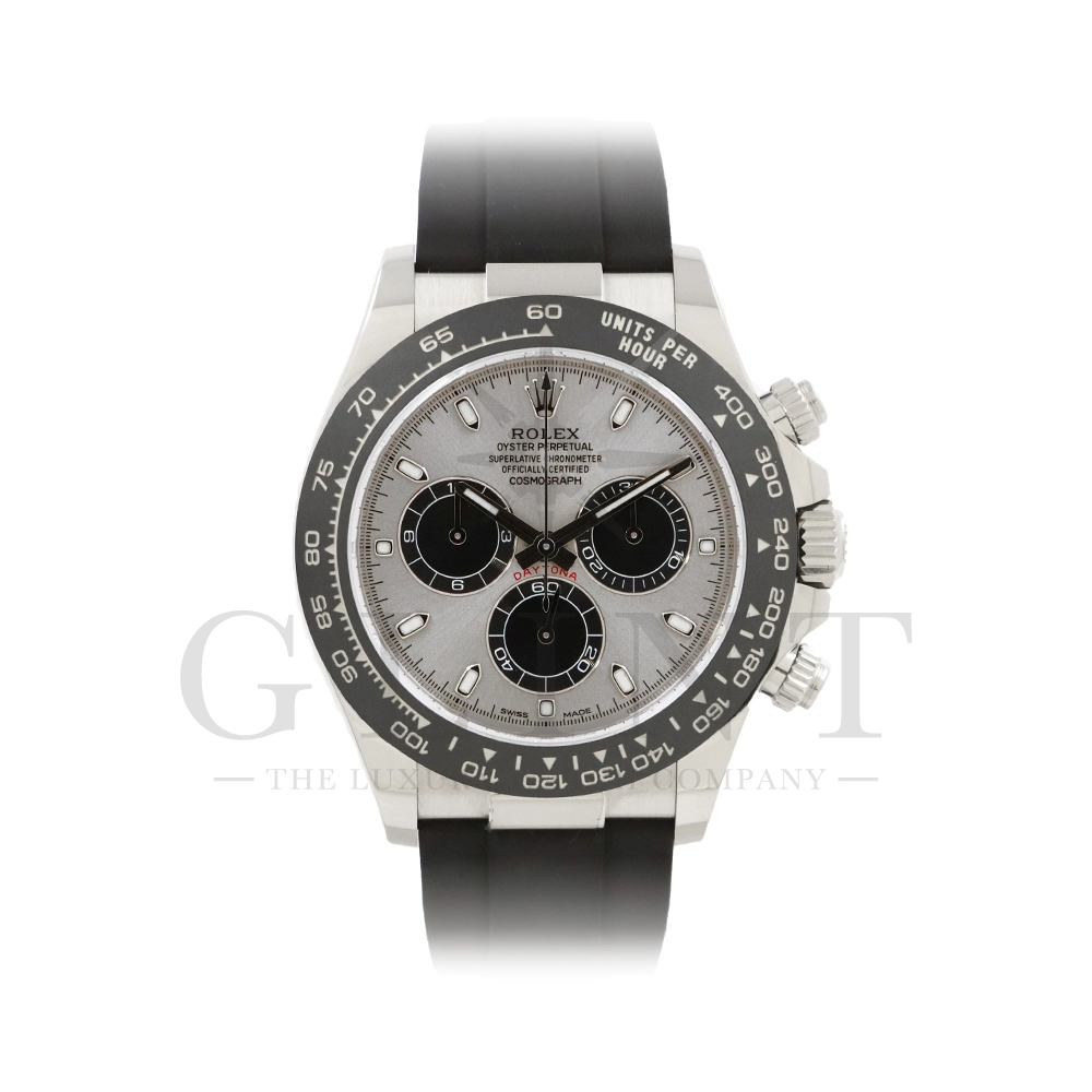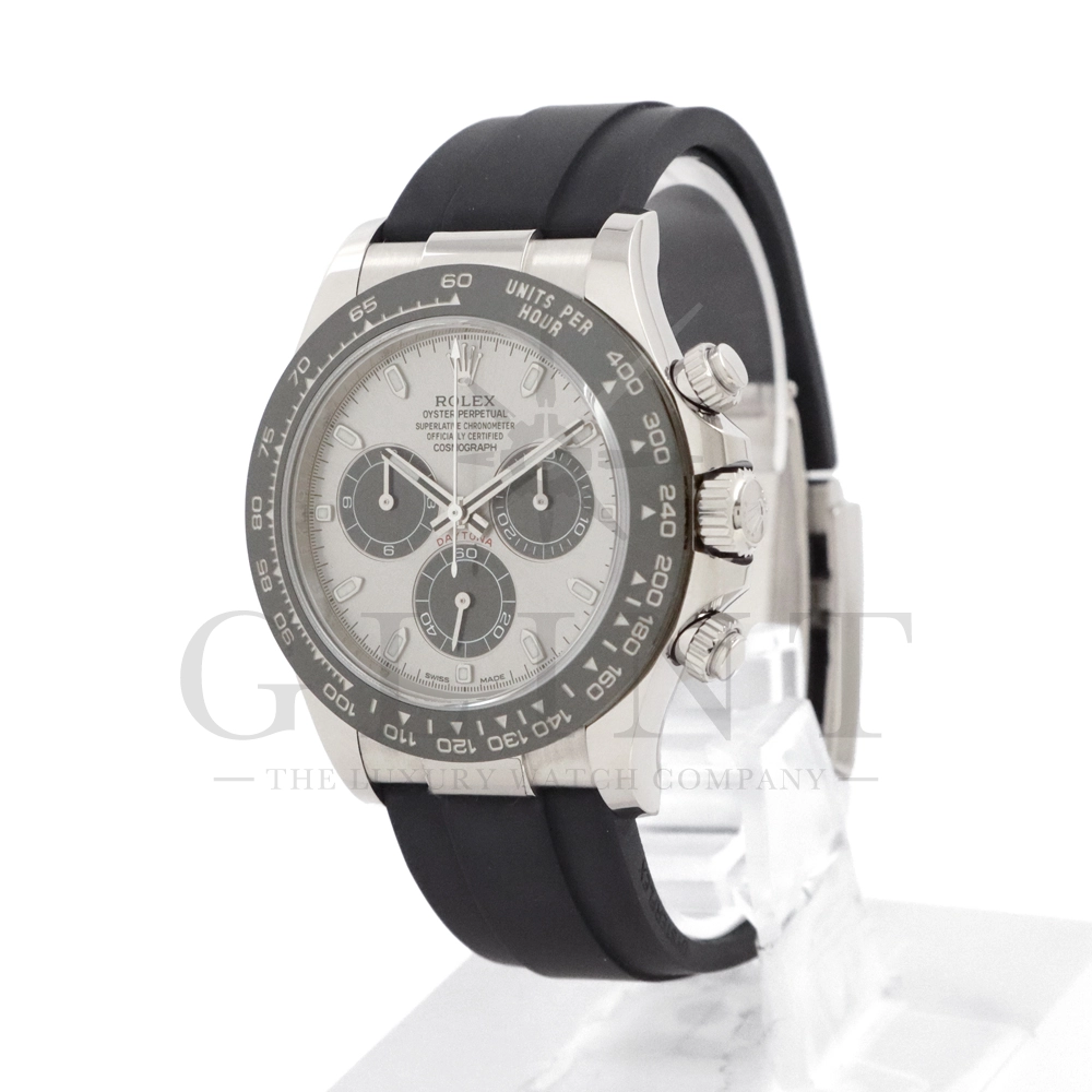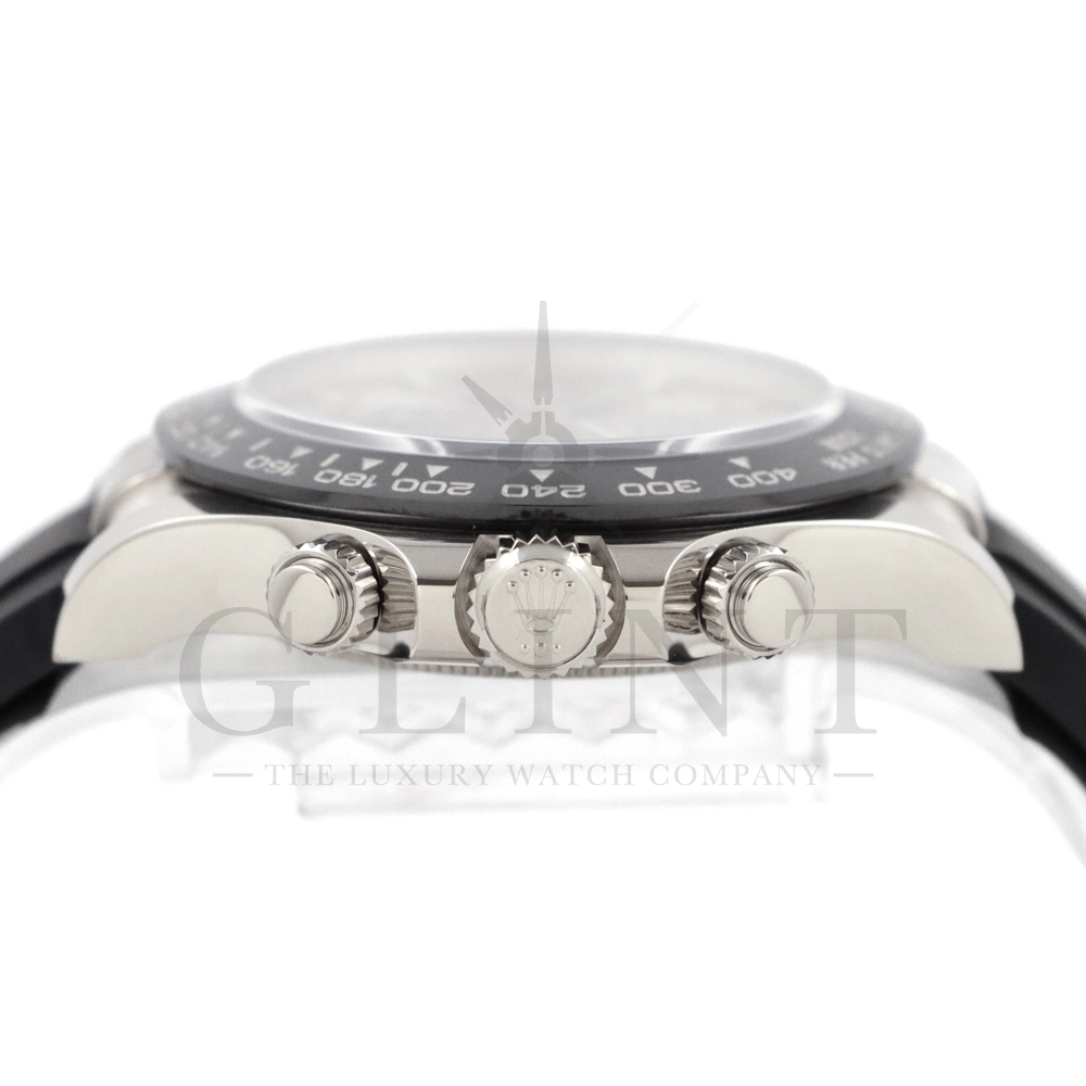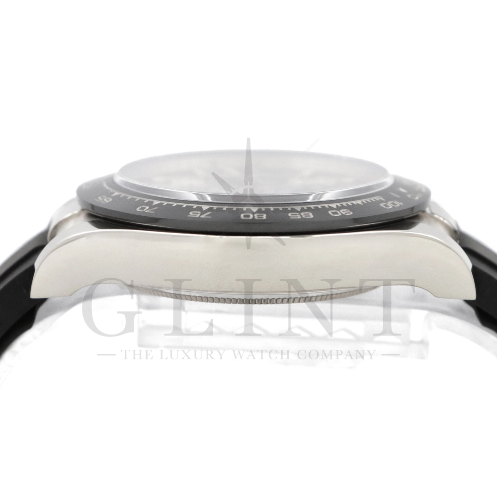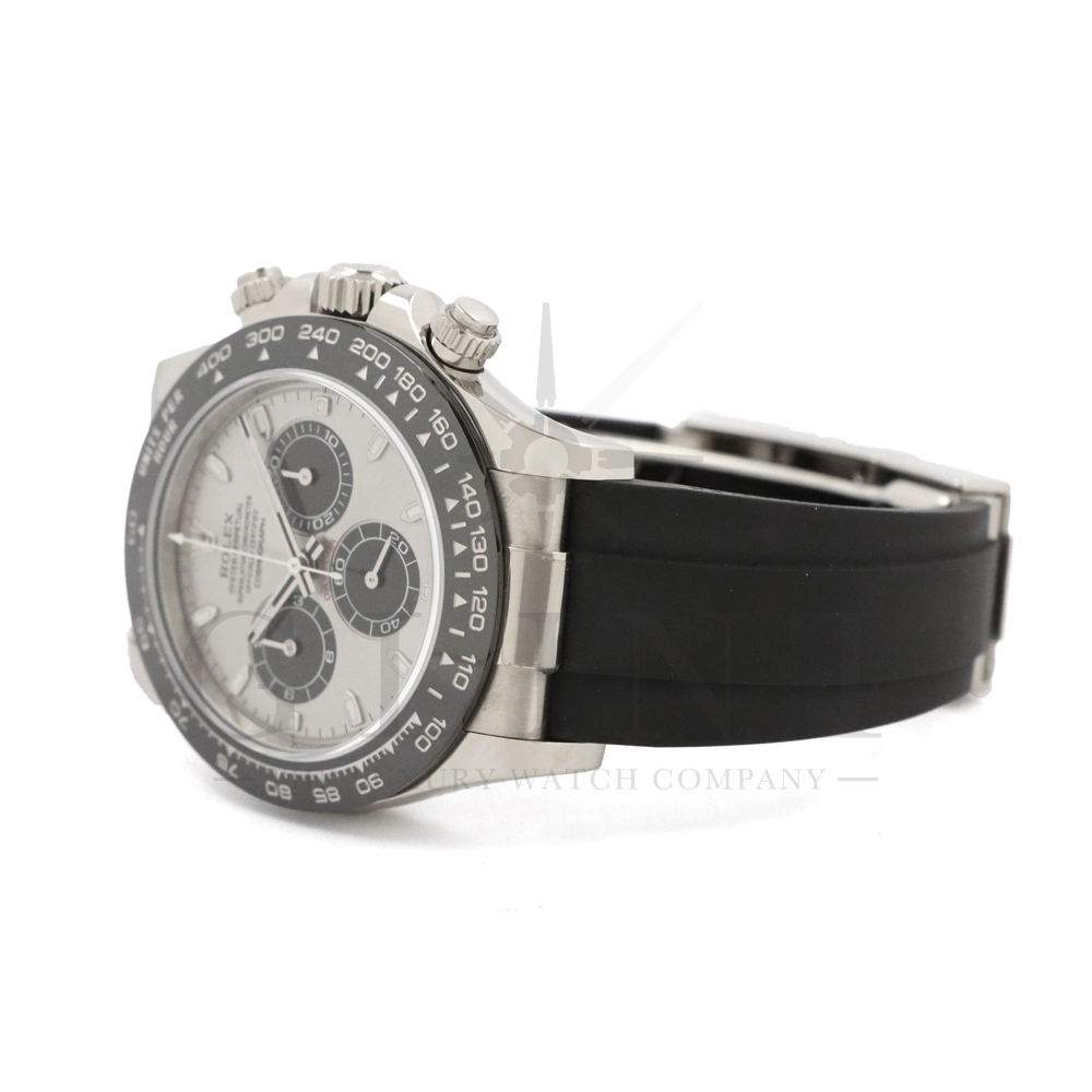 こちらはロレックス デイトナ 116519LNです。ケース素材に18Kホワイトゴールドを使用したモデルです。ベゼルにはホワイトゴールドモデルのデイトナでは初となるセラクロムベゼルを採用。同モデル特有の絶妙なスチール&ブラックのダイアルカラーが洗練された印象を与えてくれます。そして一番の変更点と言えば、これまでのレザーブレスから「オイスターフレックス・ブレスレット」と呼ばれるラバーベルトに変わった点ではないでしょうか。こちらのブレスレットは、軟性のあるチタン・ニッケル合金製ブレードを、しなやかで装着感に優れるエラストマー(人工ラバー)で覆っており、極めて高い耐久性を実現しております。水や雨も気にならず、普段使いとしても快適に楽しんで頂けるでしょう。スポーティながらも高級感を演出する事も忘れないROLEXが誇る上質な一本です。
