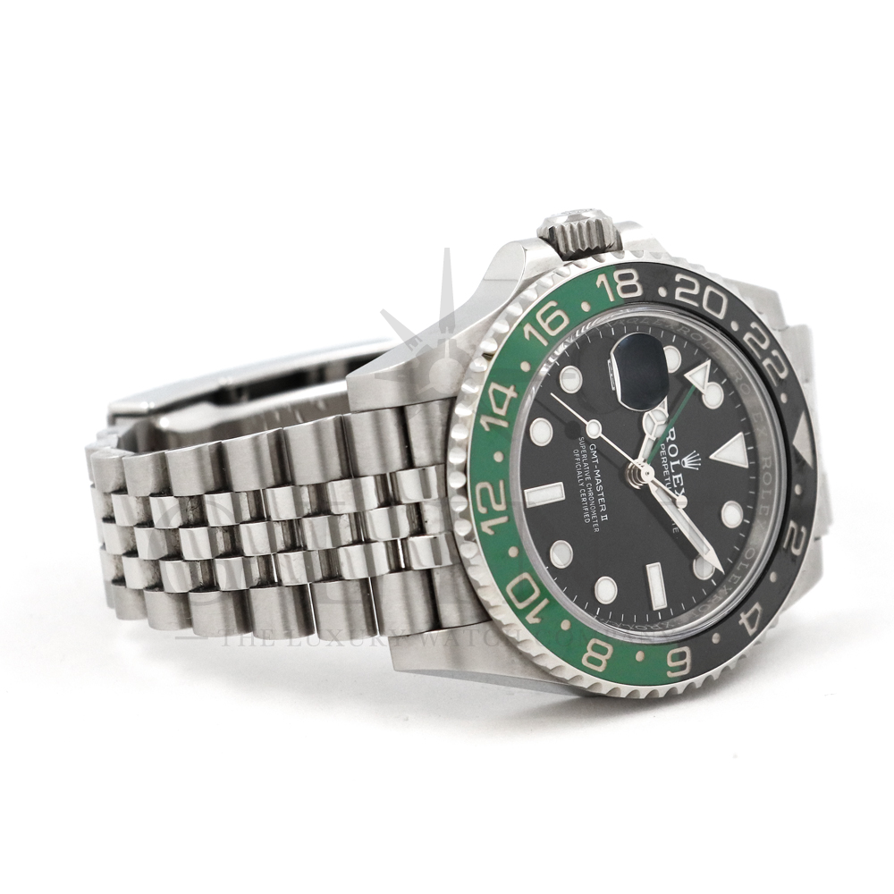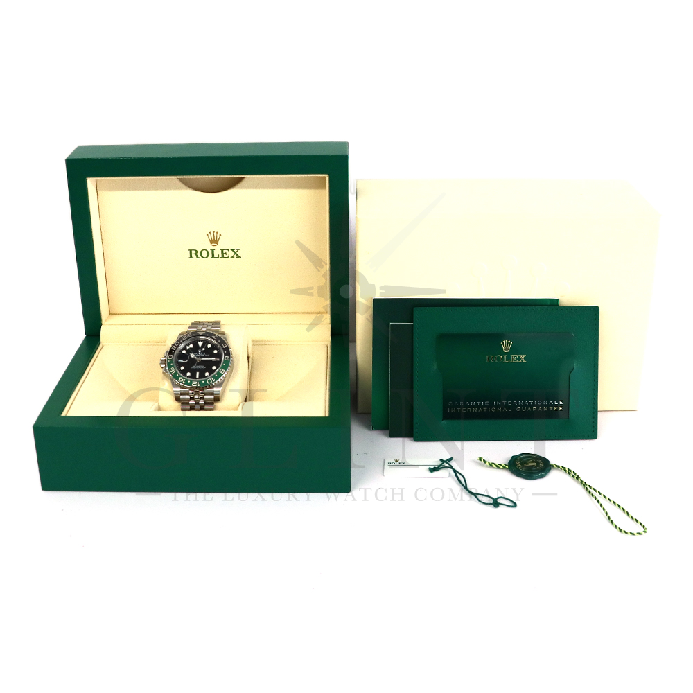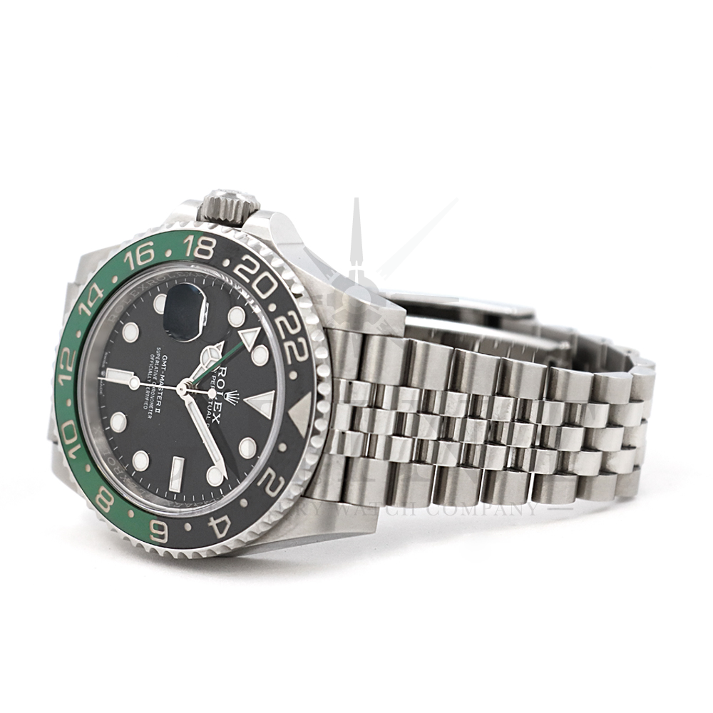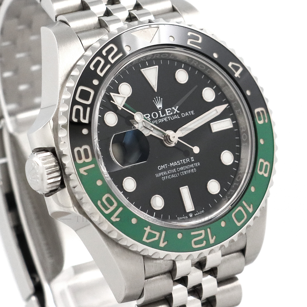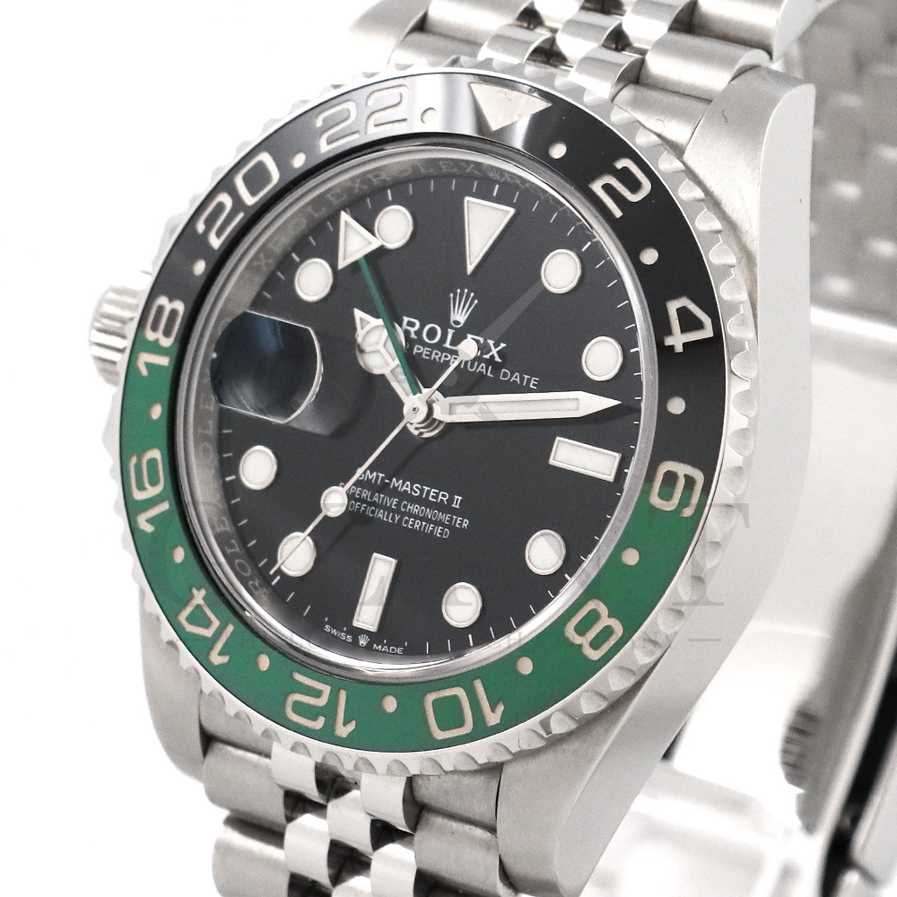 こちらはロレックス GMTマスター2 126720VTNRです。通称“スプライト”と呼ばれるグリーンとブラックのツートンカラーのベゼルにGMTマスターIIの為に専用設計されたジュビリーブレスレットを搭載。文字盤の24時間針にはベゼルと同じくグリーンカラーを採用しております。こちらのGMTマスターIIはレフティモデルとして、リューズを左側に配置した新仕様。この斬新なデザインに魅了される事でしょう。ムーブメントには126710と同じく次世代のGMTマスターIIを担うCal.3285を使用しております。更に進化したロレックスの人気モデルで腕元をオシャレに演出してみてはいかがでしょうか。