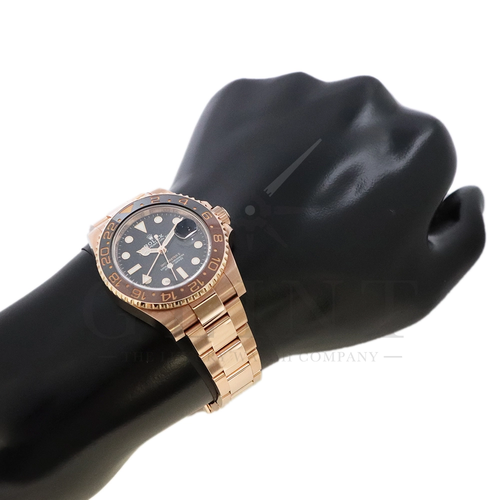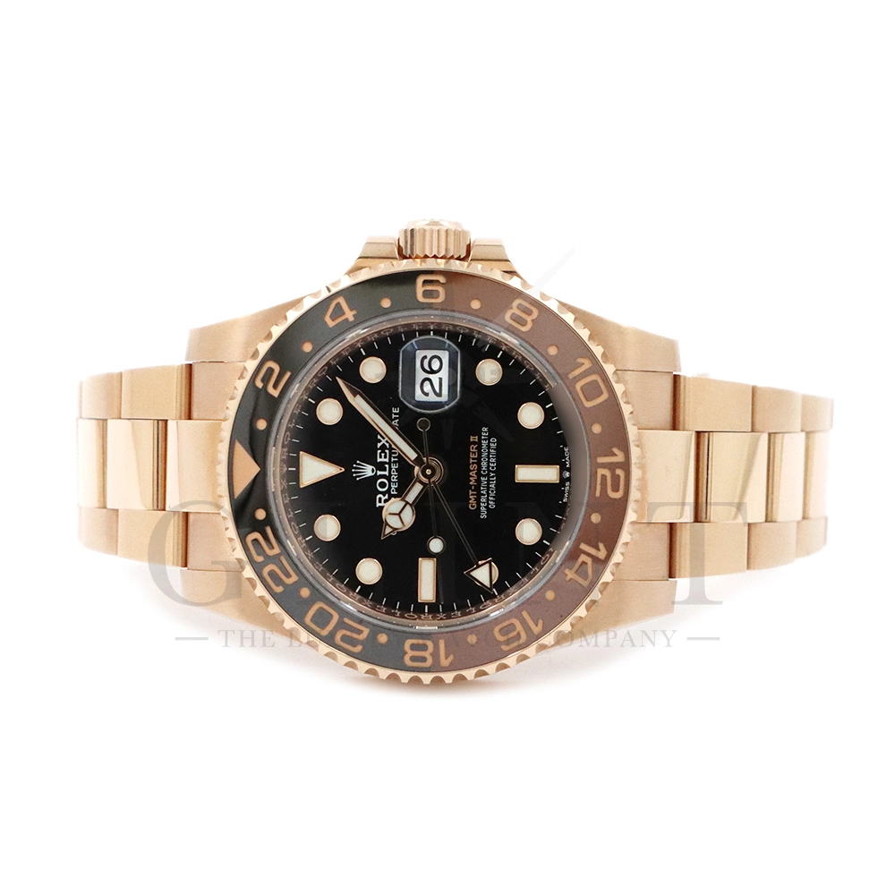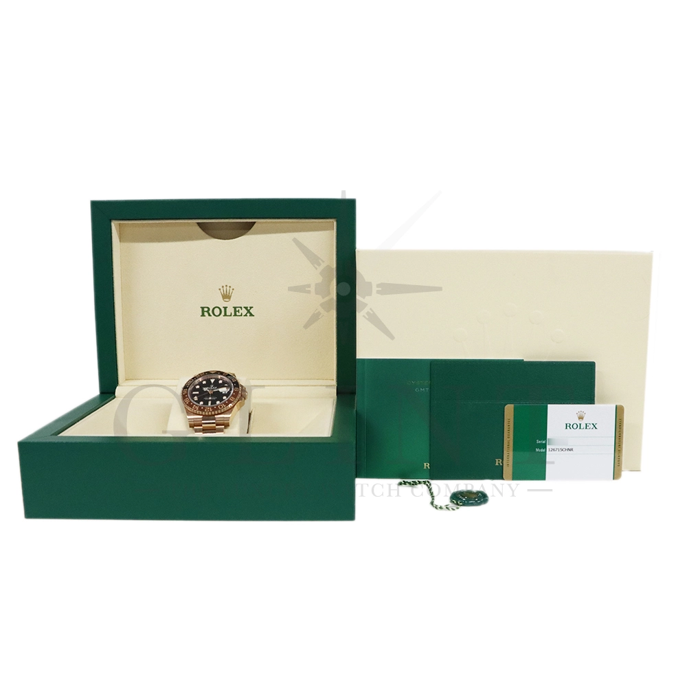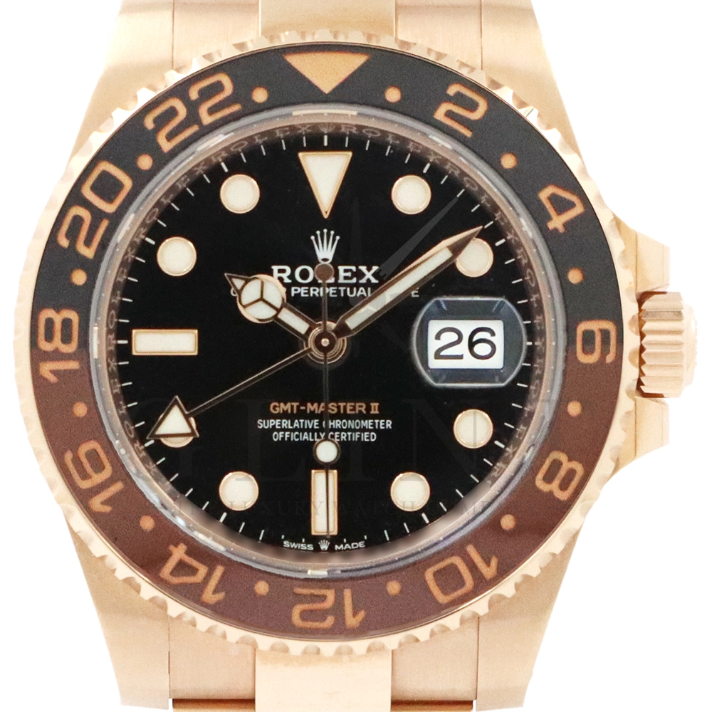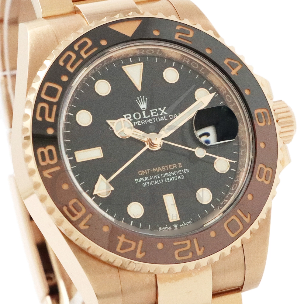 こちらはロレックス GMTマスター2です。スポーツモデルの中でも、ラグジュアリーと実用性を兼ね備えた人気モデルが、Rolex GMT‑Master II 126715CHNR。通称「ルートビア」として知られる本モデルは、エバーローズゴールドケースとブラウン×ブラックのツートーンベゼルが特徴で、落ち着きと高級感を兼ね備えたデザインが魅力です。ケースにはロレックス独自の18Kエバーローズゴールドを採用。経年による色味の変化を抑える独自合金により、美しいピンクゴールドの輝きを長く保ちます。ベゼルには耐傷性・耐紫外線性に優れたセラクロムベゼルインサートを使用し、ブラウンとブラックの24時間表示により昼夜の判別が可能。GMT機能により、ホームタイムと第2時間帯を同時に表示できるため、海外出張や旅行が多い方にも最適な一本です。ムーブメントにはロレックス自社製キャリバー3285を搭載。高精度クロノメーター認定を受けており、約70時間のパワーリザーブを実現しています。さらにパラクロム・ヘアスプリングやクロナジーエスケープメントなど、耐磁性や耐衝撃性にも優れた最先端技術が採用されています。ブレスレットは重厚感のあるエバーローズゴールド製オイスターブレスレットを装備し、優れた装着感と高級感を両立。スポーツモデルでありながらドレスウォッチとしても映える存在感を持ち、ビジネスからカジュアルまで幅広いシーンで活躍します。ラグジュアリー素材とプロフェッショナルウォッチの機能性を融合させた126715CHNRは、資産価値・デザイン性・実用性のすべてを兼ね備えた特別な一本です。時計愛好家はもちろん、長く愛用できるハイエンドスポーツウォッチをお探しの方におすすめのモデルとなっています。