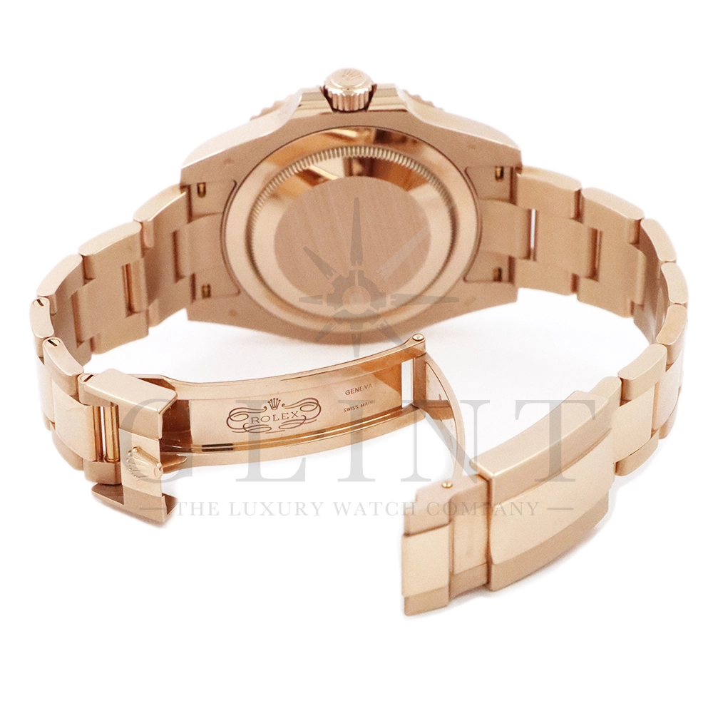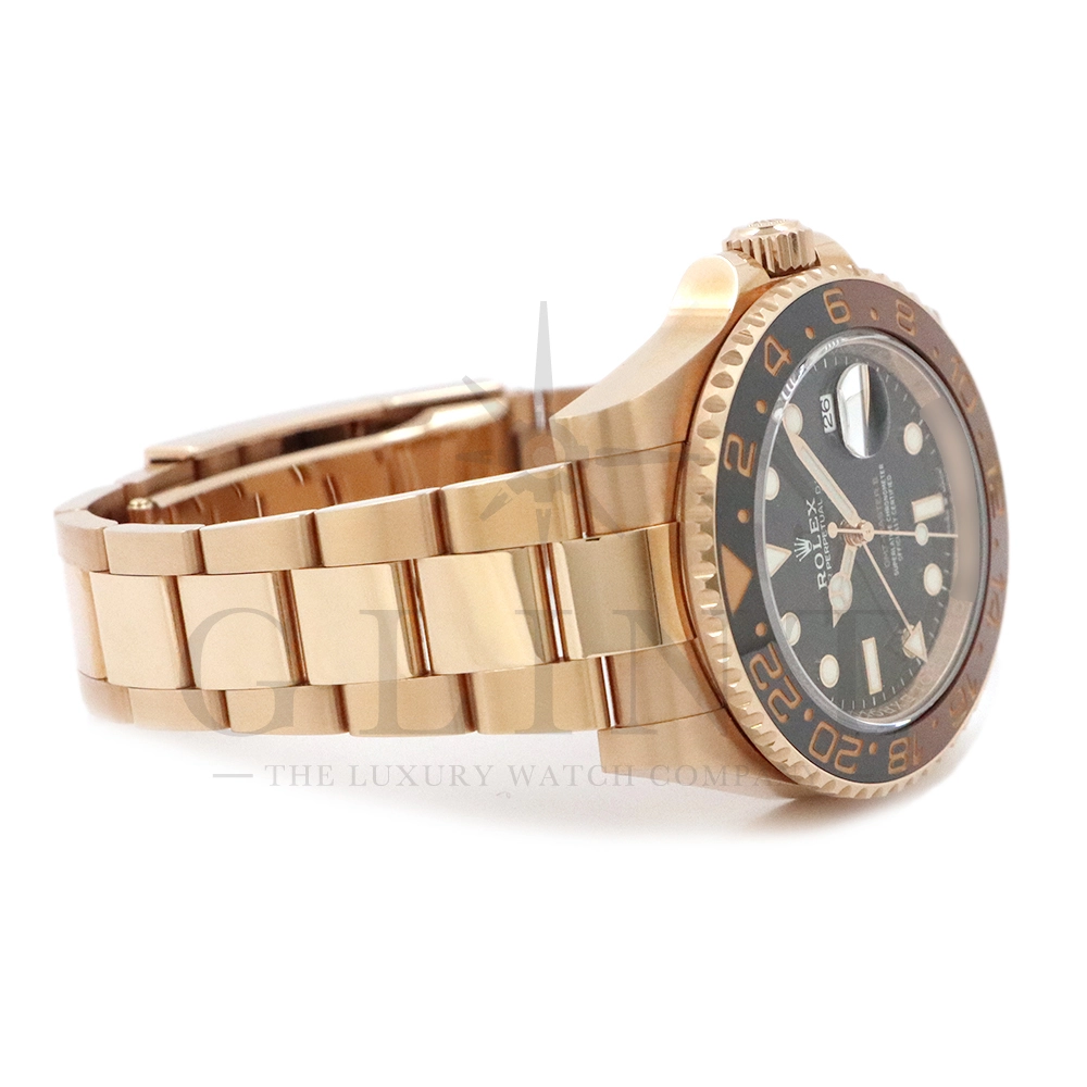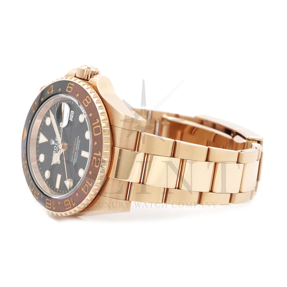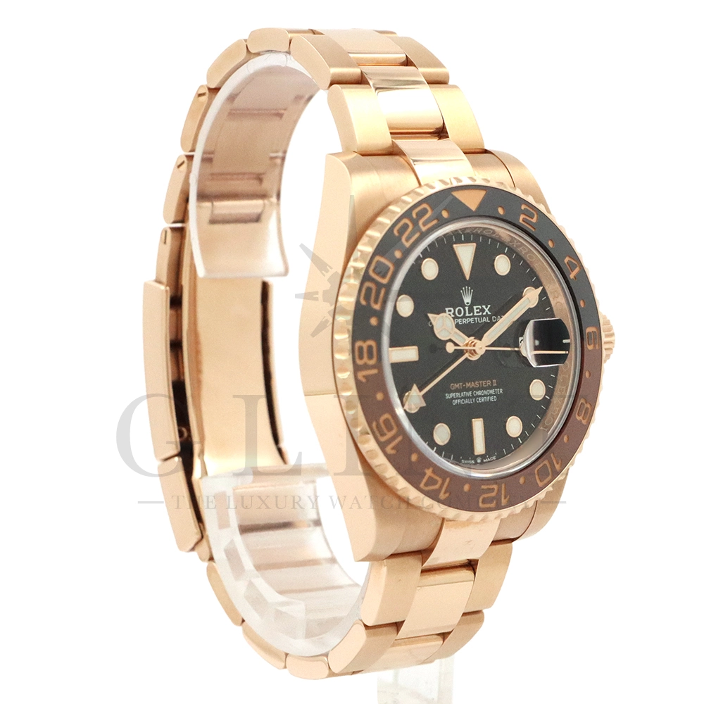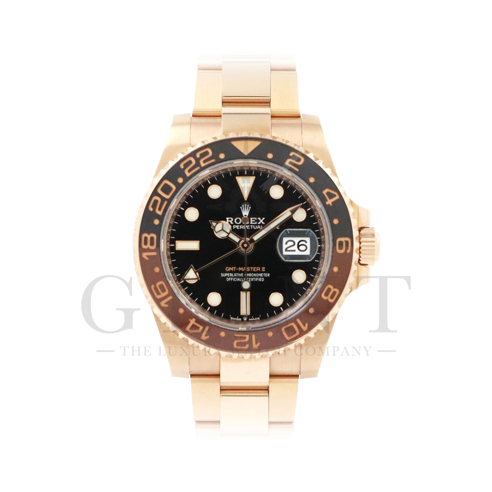 こちらはロレックス GMTマスター2です。スポーツモデルの中でも、ラグジュアリーと実用性を兼ね備えた人気モデルが、Rolex GMT‑Master II 126715CHNR。通称「ルートビア」として知られる本モデルは、エバーローズゴールドケースとブラウン×ブラックのツートーンベゼルが特徴で、落ち着きと高級感を兼ね備えたデザインが魅力です。ケースにはロレックス独自の18Kエバーローズゴールドを採用。経年による色味の変化を抑える独自合金により、美しいピンクゴールドの輝きを長く保ちます。ベゼルには耐傷性・耐紫外線性に優れたセラクロムベゼルインサートを使用し、ブラウンとブラックの24時間表示により昼夜の判別が可能。GMT機能により、ホームタイムと第2時間帯を同時に表示できるため、海外出張や旅行が多い方にも最適な一本です。ムーブメントにはロレックス自社製キャリバー3285を搭載。高精度クロノメーター認定を受けており、約70時間のパワーリザーブを実現しています。さらにパラクロム・ヘアスプリングやクロナジーエスケープメントなど、耐磁性や耐衝撃性にも優れた最先端技術が採用されています。ブレスレットは重厚感のあるエバーローズゴールド製オイスターブレスレットを装備し、優れた装着感と高級感を両立。スポーツモデルでありながらドレスウォッチとしても映える存在感を持ち、ビジネスからカジュアルまで幅広いシーンで活躍します。ラグジュアリー素材とプロフェッショナルウォッチの機能性を融合させた126715CHNRは、資産価値・デザイン性・実用性のすべてを兼ね備えた特別な一本です。時計愛好家はもちろん、長く愛用できるハイエンドスポーツウォッチをお探しの方におすすめのモデルとなっています。