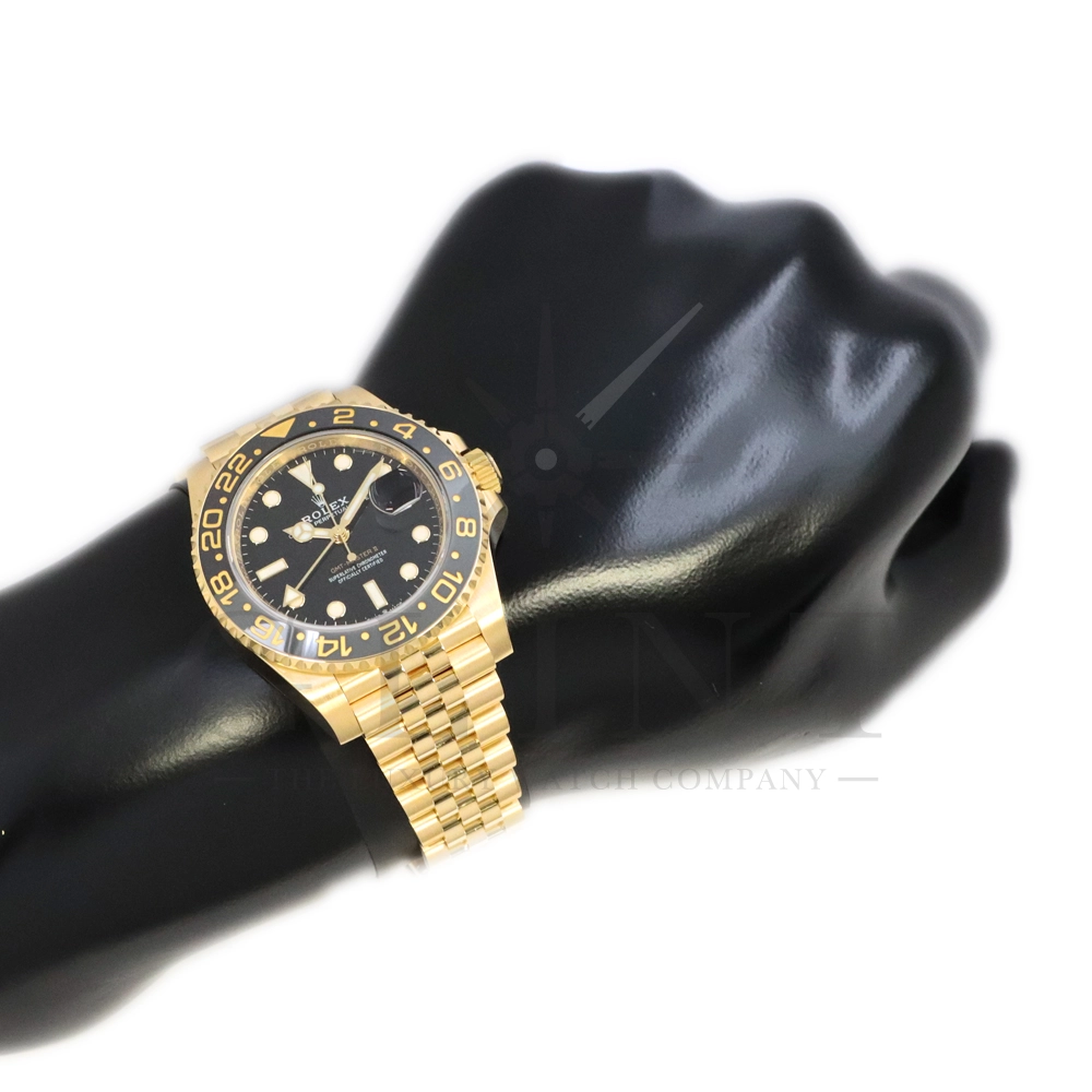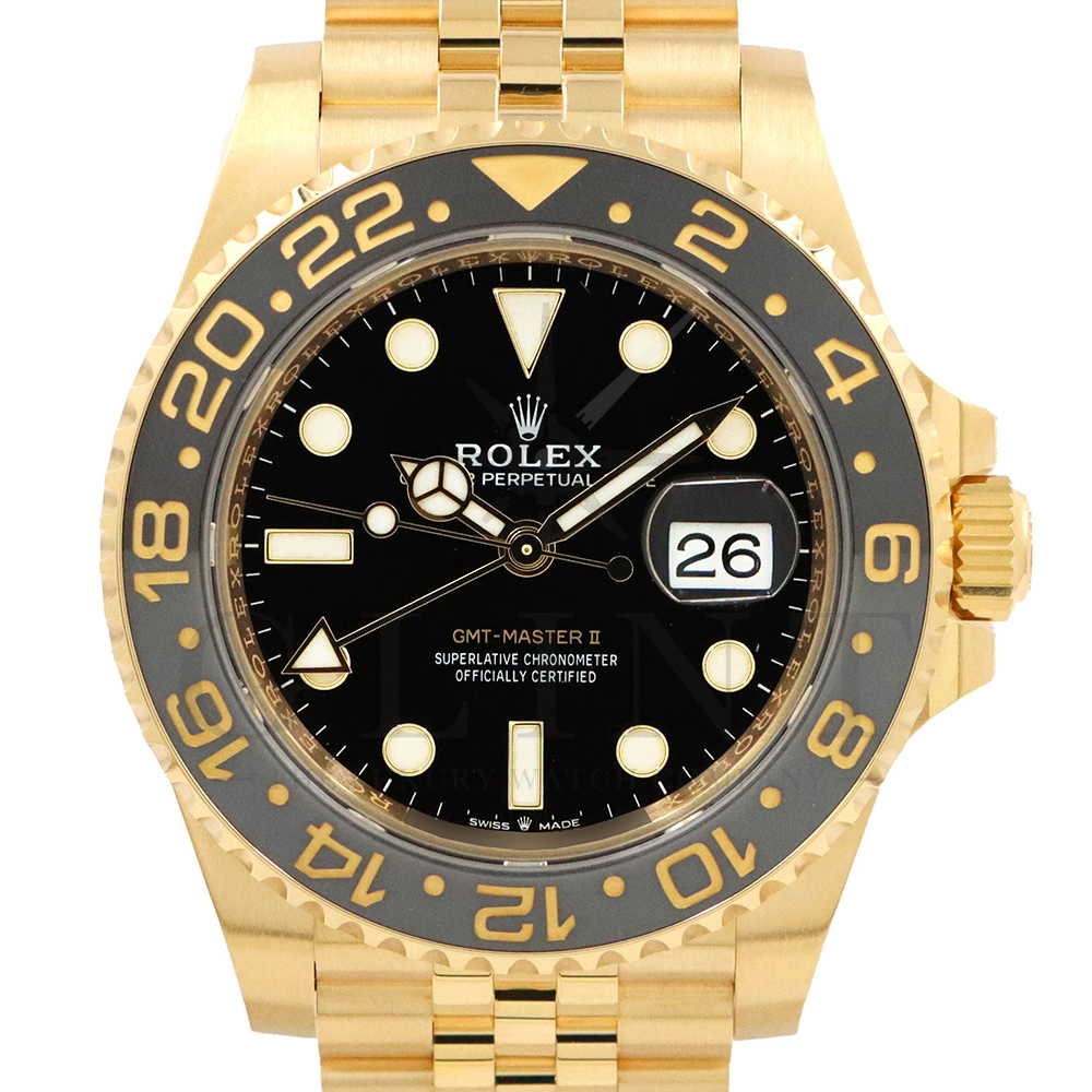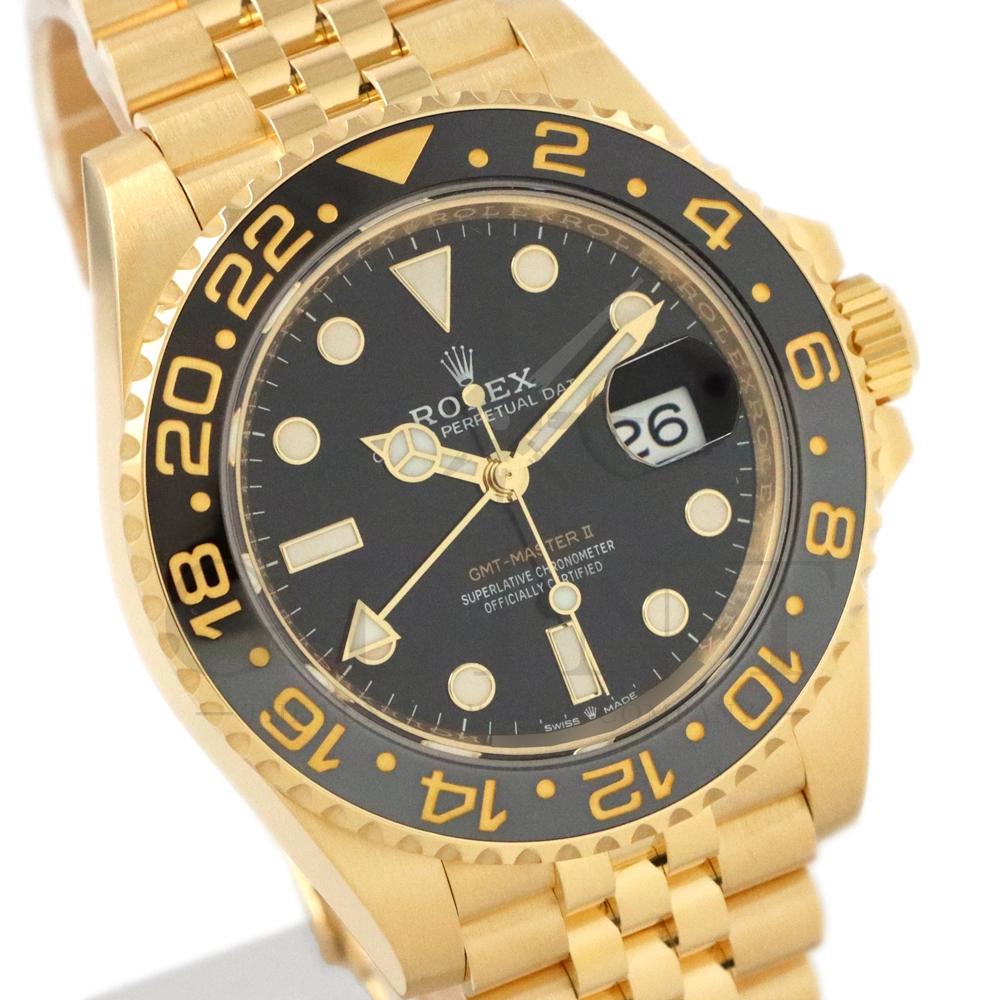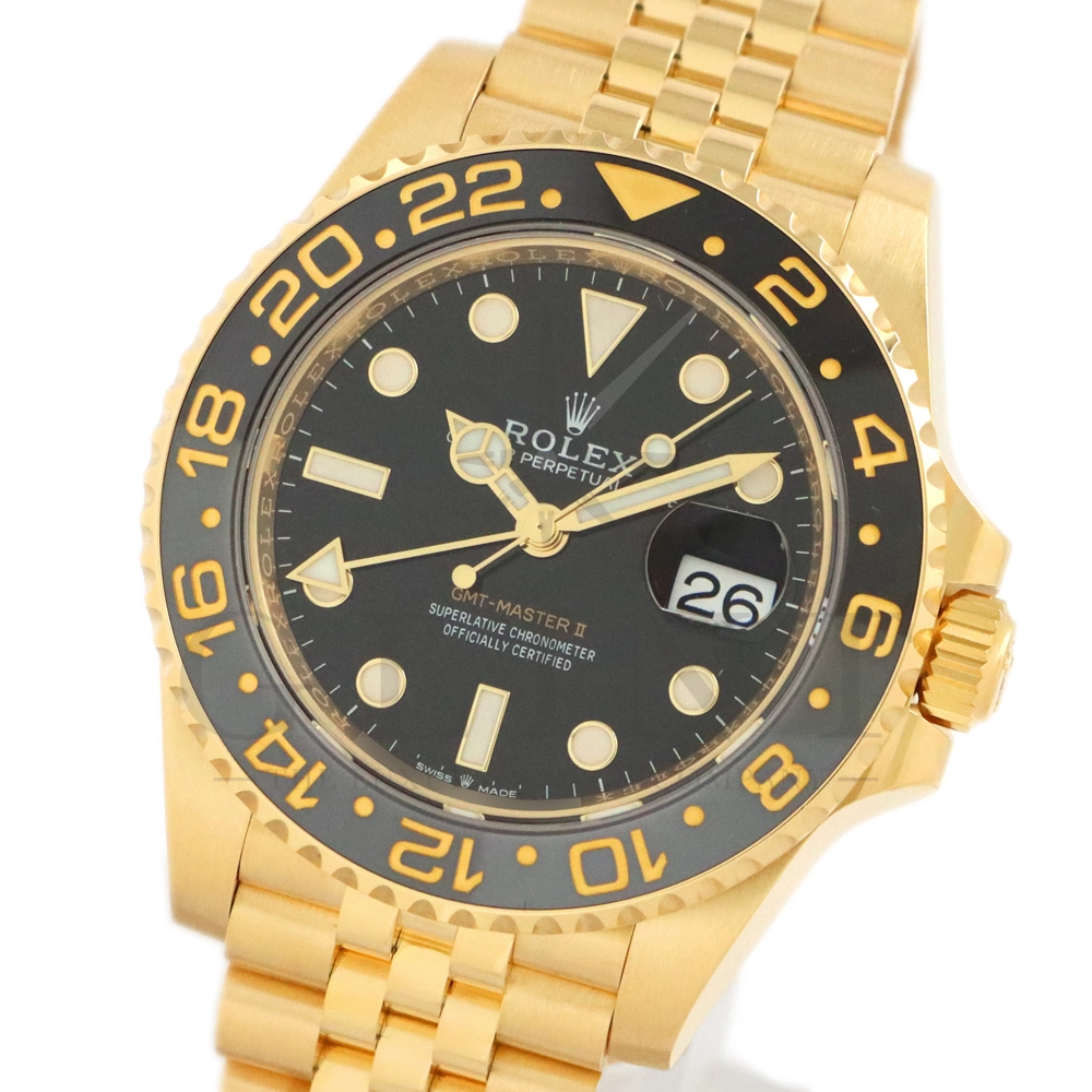 こちらは2023年の新作として発表されたロレックス GMTマスター2 126718GRNRです。ベゼルはグレーとブラックのツートンカラー、文字盤の24時間針には18ctイエローゴールドを採用。ケース素材と見事な相性で魅了します。ブレスレットには1945年にオイスターパーペチュアルデイトジャストの発売に合わせて特別にデザインされた5列リンクのジュビリーブレスレットを搭載し、しなやかで快適な装着感と特有の高級感を与えてくれます。搭載されているロレックスが独自に開発・製造したキャリバー3285はロレックスが特許を取得したクロナジーエスケープメントを採用し、高いエネルギー効率により70時間ものパワーリザーブを誇ります。ワンランク上のGMTマスターIIをお楽しみになりたい方にオススメの一本です。