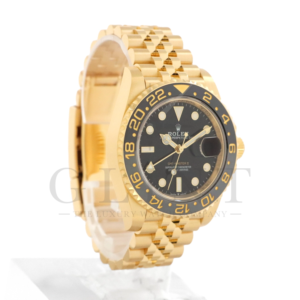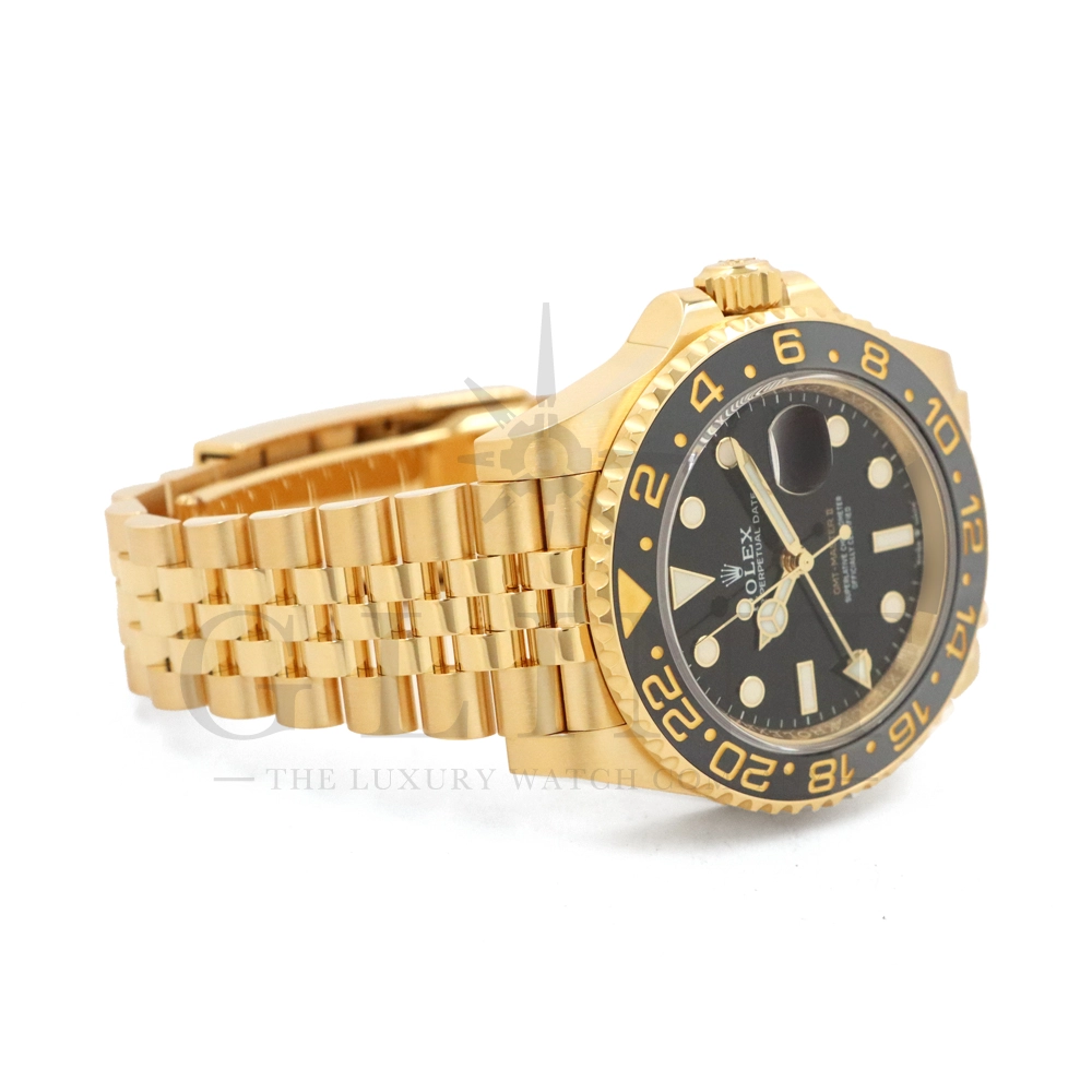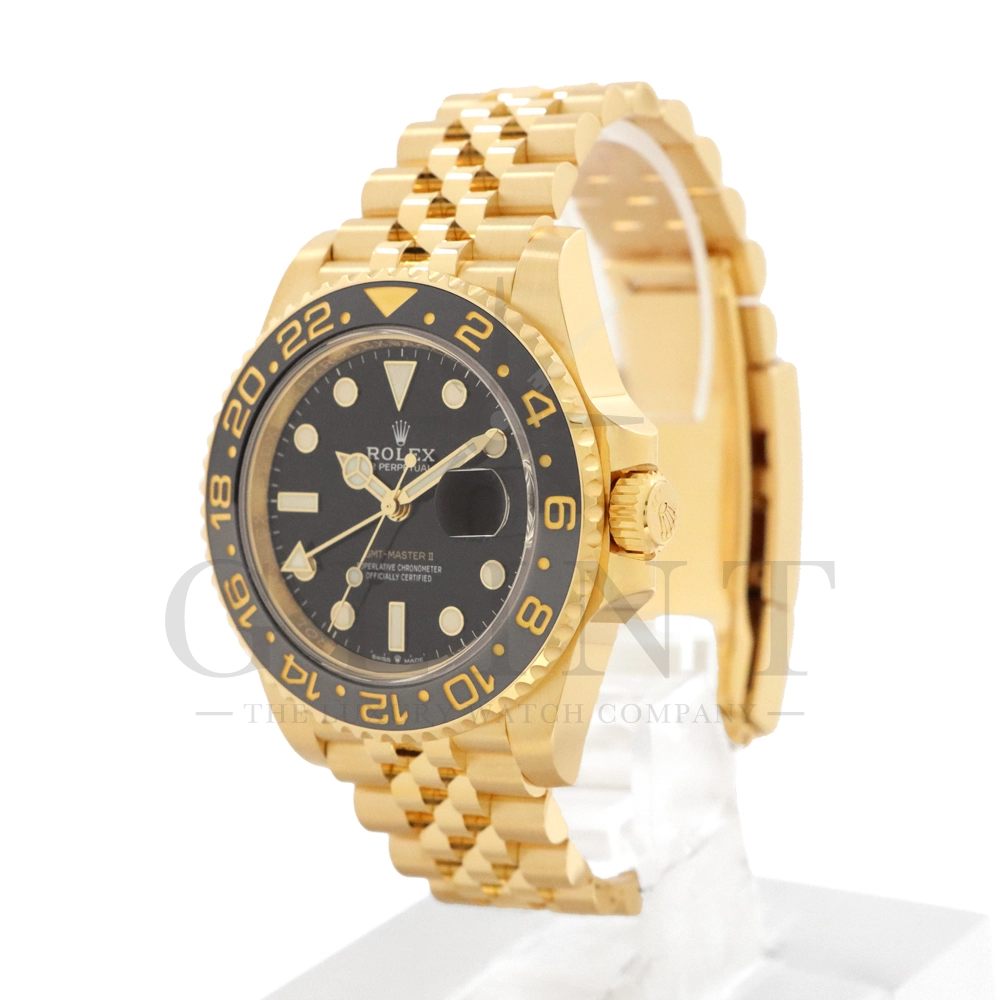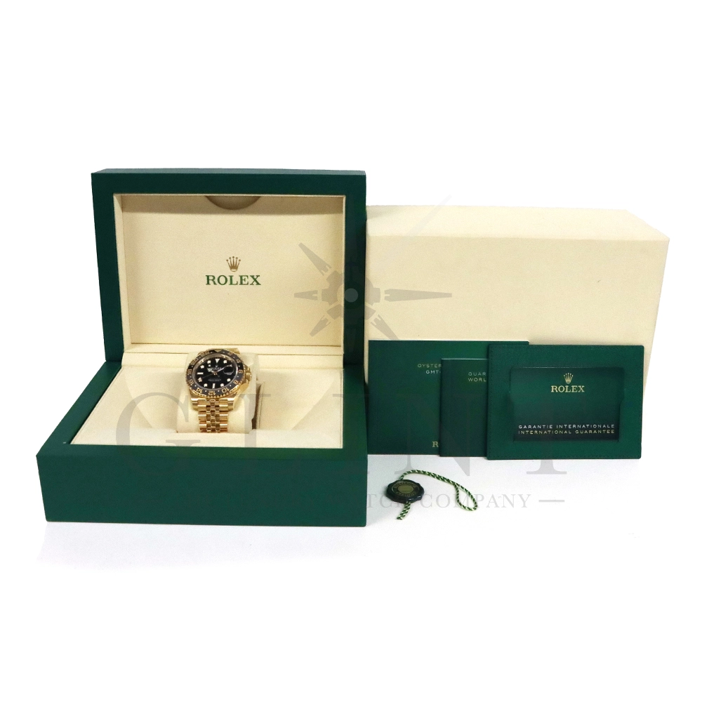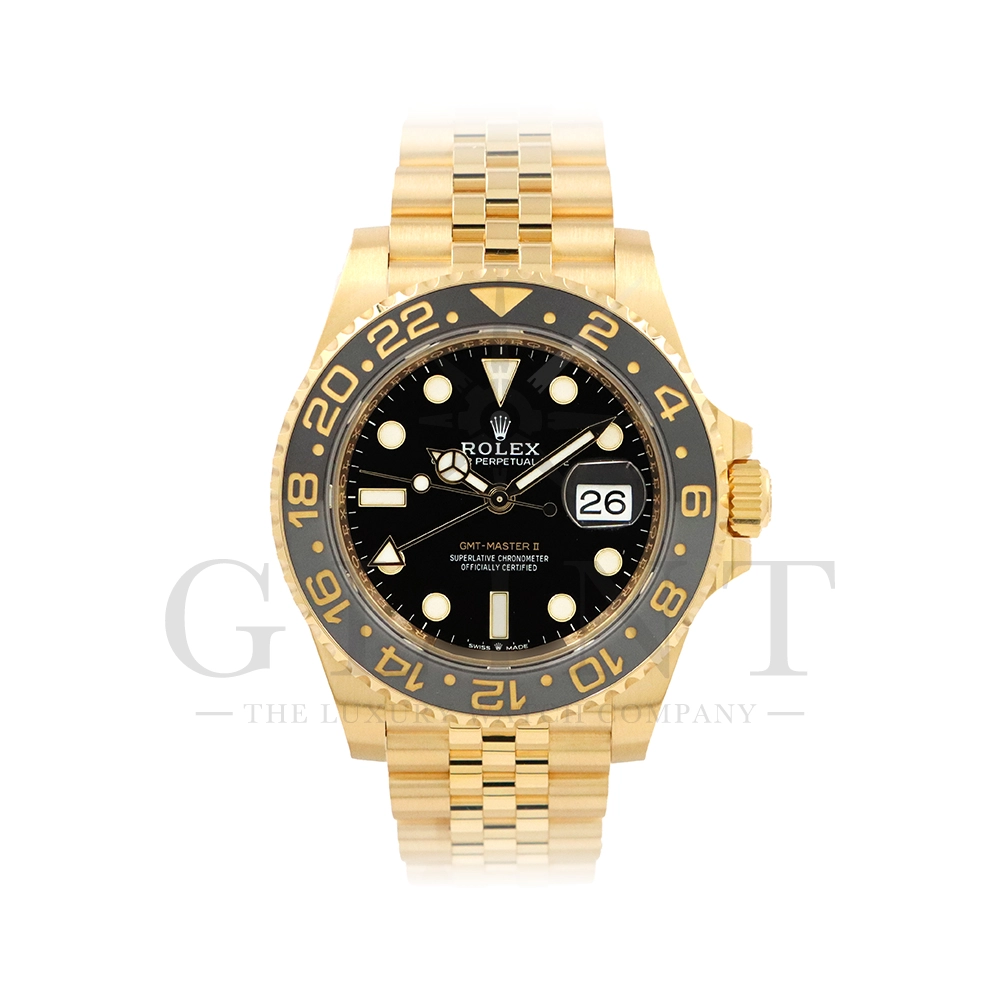 こちらは2023年の新作として発表されたロレックス GMTマスター2 126718GRNRです。ベゼルはグレーとブラックのツートンカラー、文字盤の24時間針には18ctイエローゴールドを採用。ケース素材と見事な相性で魅了します。ブレスレットには1945年にオイスターパーペチュアルデイトジャストの発売に合わせて特別にデザインされた5列リンクのジュビリーブレスレットを搭載し、しなやかで快適な装着感と特有の高級感を与えてくれます。搭載されているロレックスが独自に開発・製造したキャリバー3285はロレックスが特許を取得したクロナジーエスケープメントを採用し、高いエネルギー効率により70時間ものパワーリザーブを誇ります。ワンランク上のGMTマスターIIをお楽しみになりたい方にオススメの一本です。