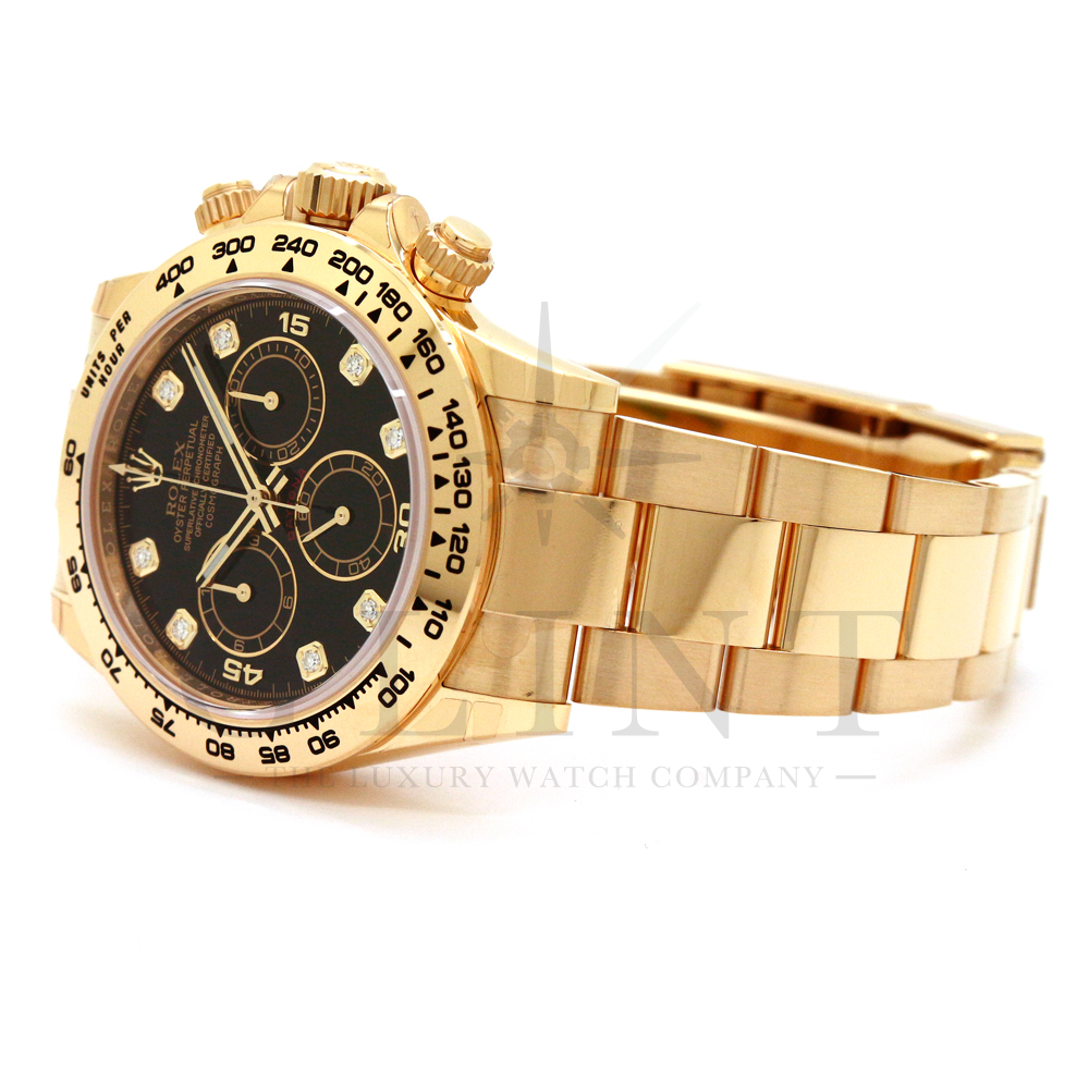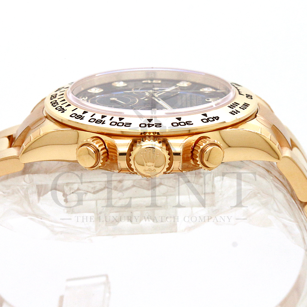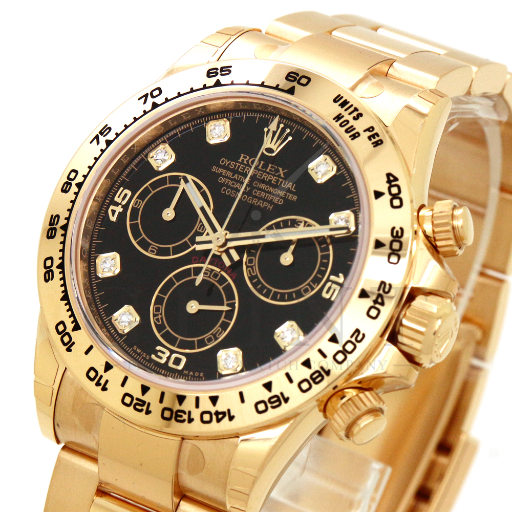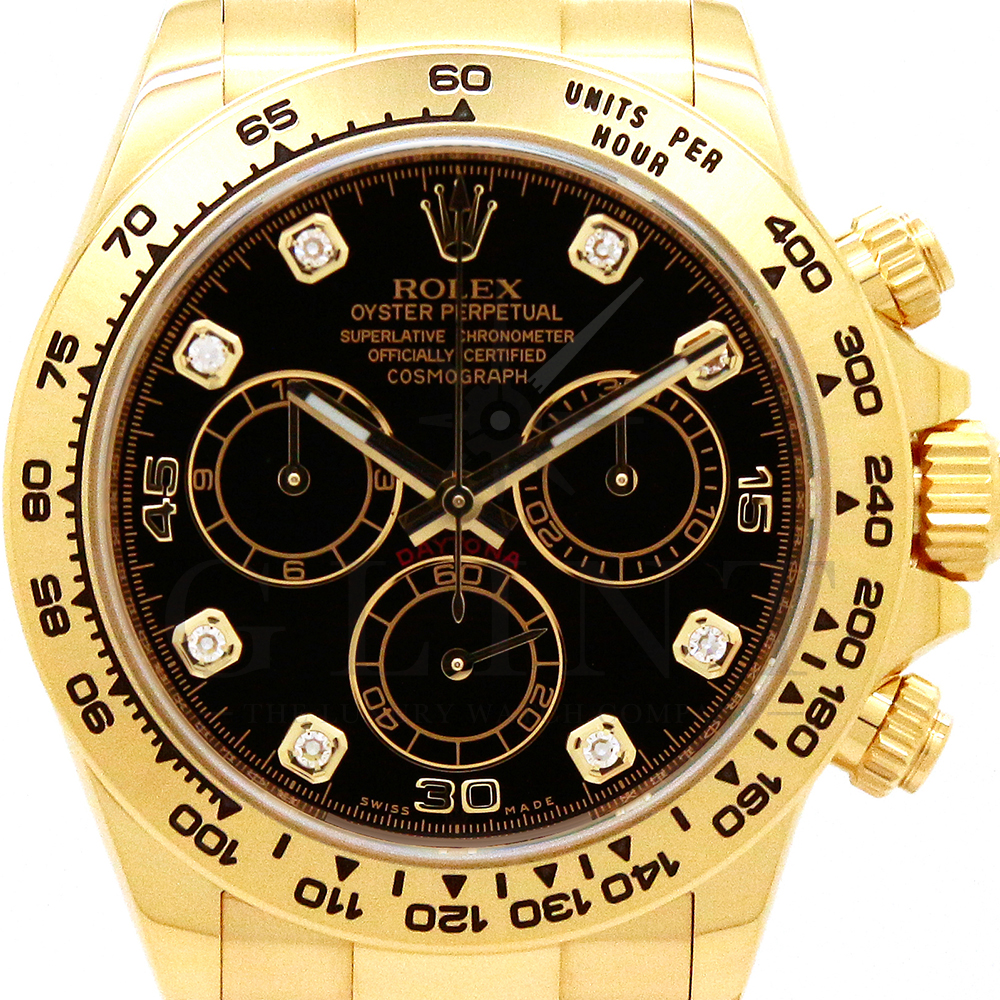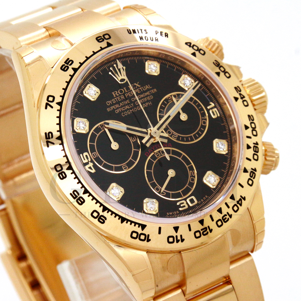 こちらはROLE デイトナ 18Kイエローゴールドモデルです。2016年にRef.116528からマイナーチェンジしたRef.116508。タキメーターベゼルの表記が一新され、視認性が向上いたしました。ブラック文字盤に配されたダイヤモンドがイエローゴールドと見事にマッチしており、華やかな高級感を味わえる雰囲気となっております。金無垢ならでの重量感とステータス性を感じさせてくれるデイトナで他の人と差をつけてみてはいかがでしょうか。