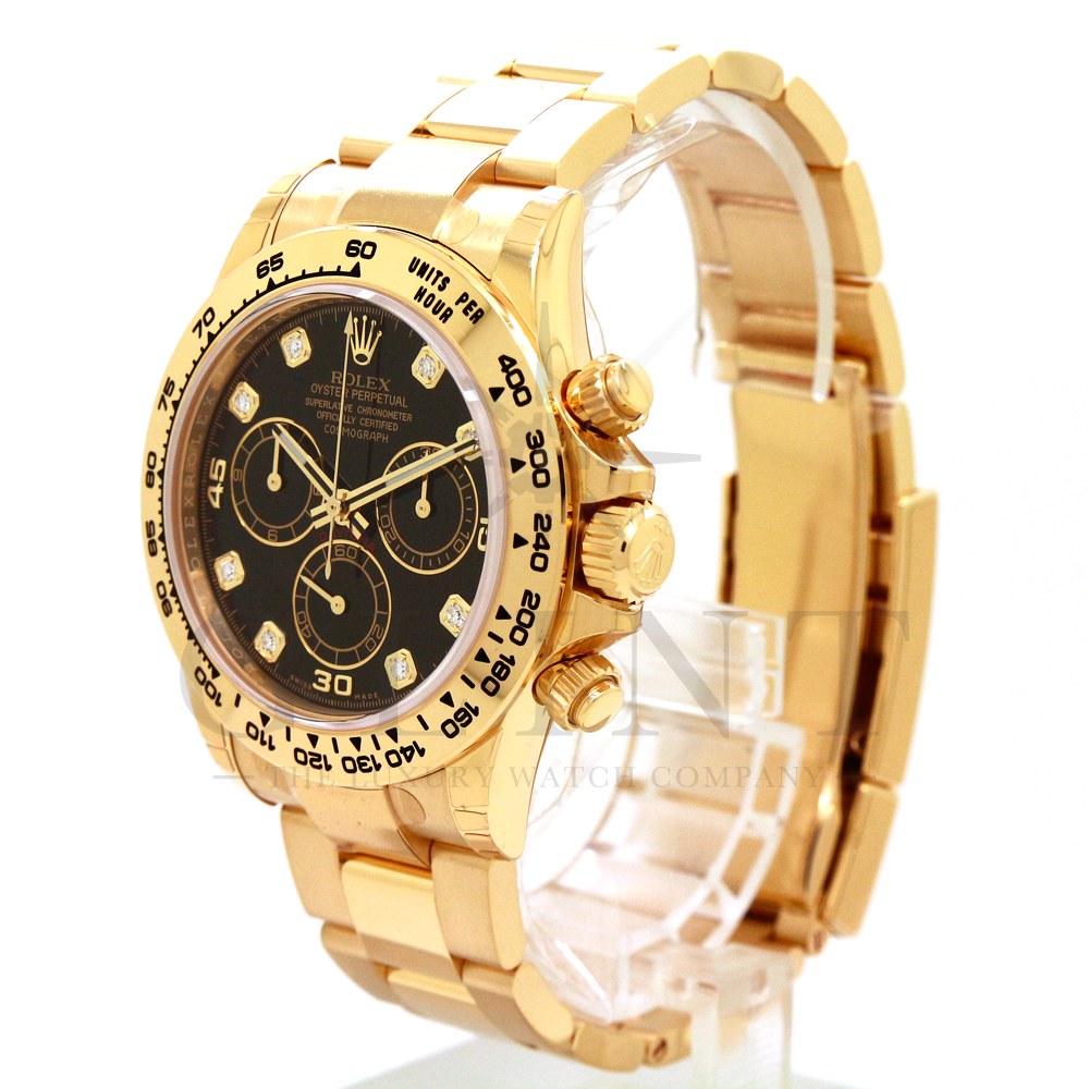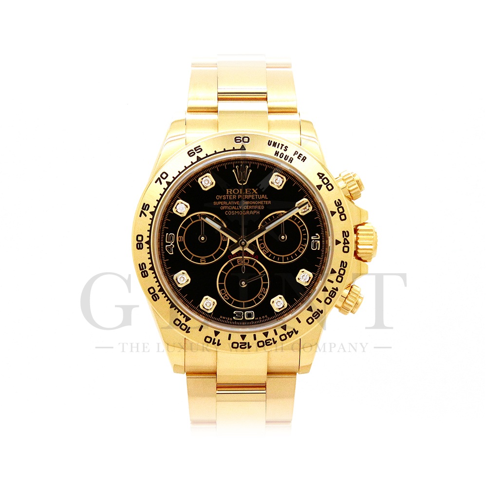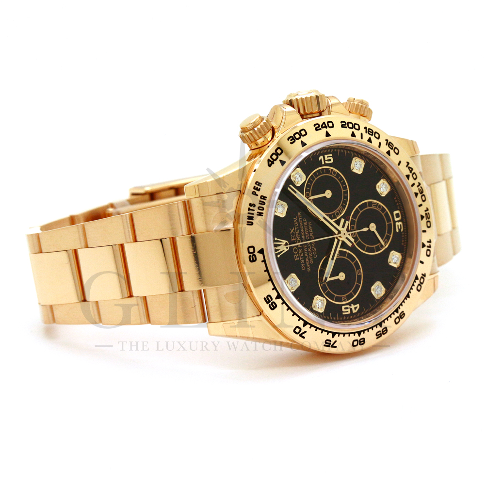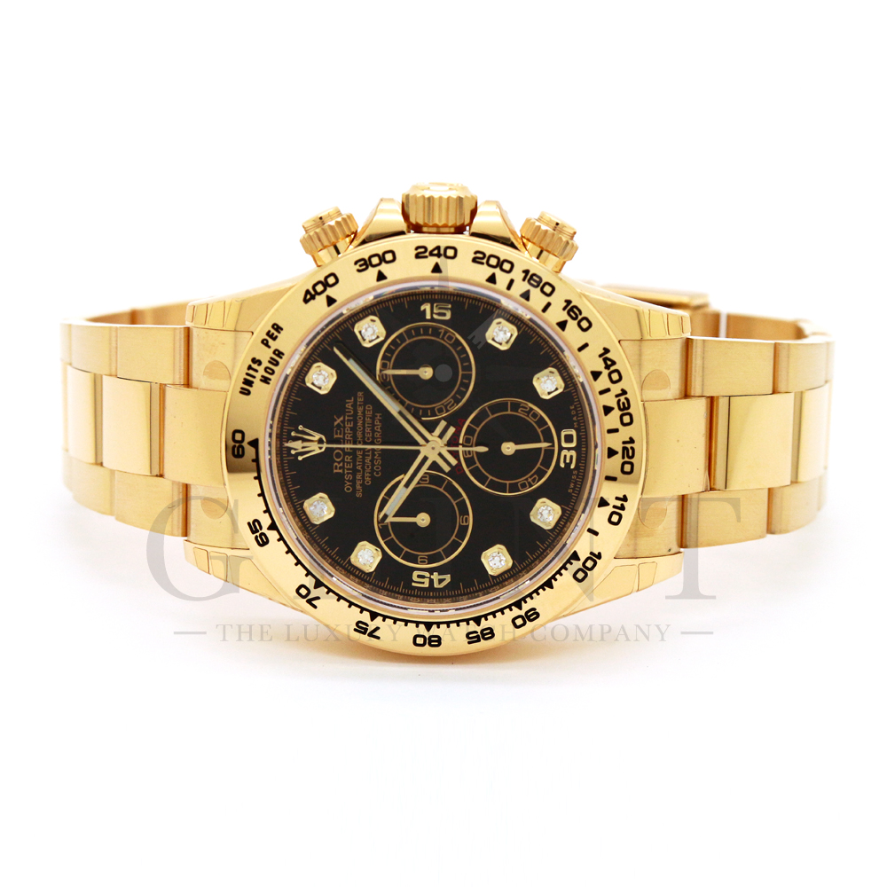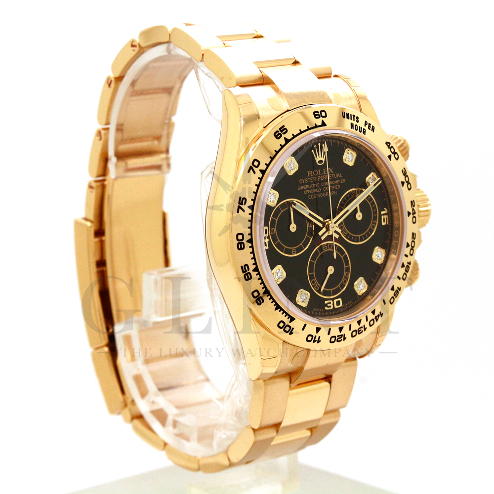 こちらはROLE デイトナ 18Kイエローゴールドモデルです。2016年にRef.116528からマイナーチェンジしたRef.116508。タキメーターベゼルの表記が一新され、視認性が向上いたしました。ブラック文字盤に配されたダイヤモンドがイエローゴールドと見事にマッチしており、華やかな高級感を味わえる雰囲気となっております。金無垢ならでの重量感とステータス性を感じさせてくれるデイトナで他の人と差をつけてみてはいかがでしょうか。