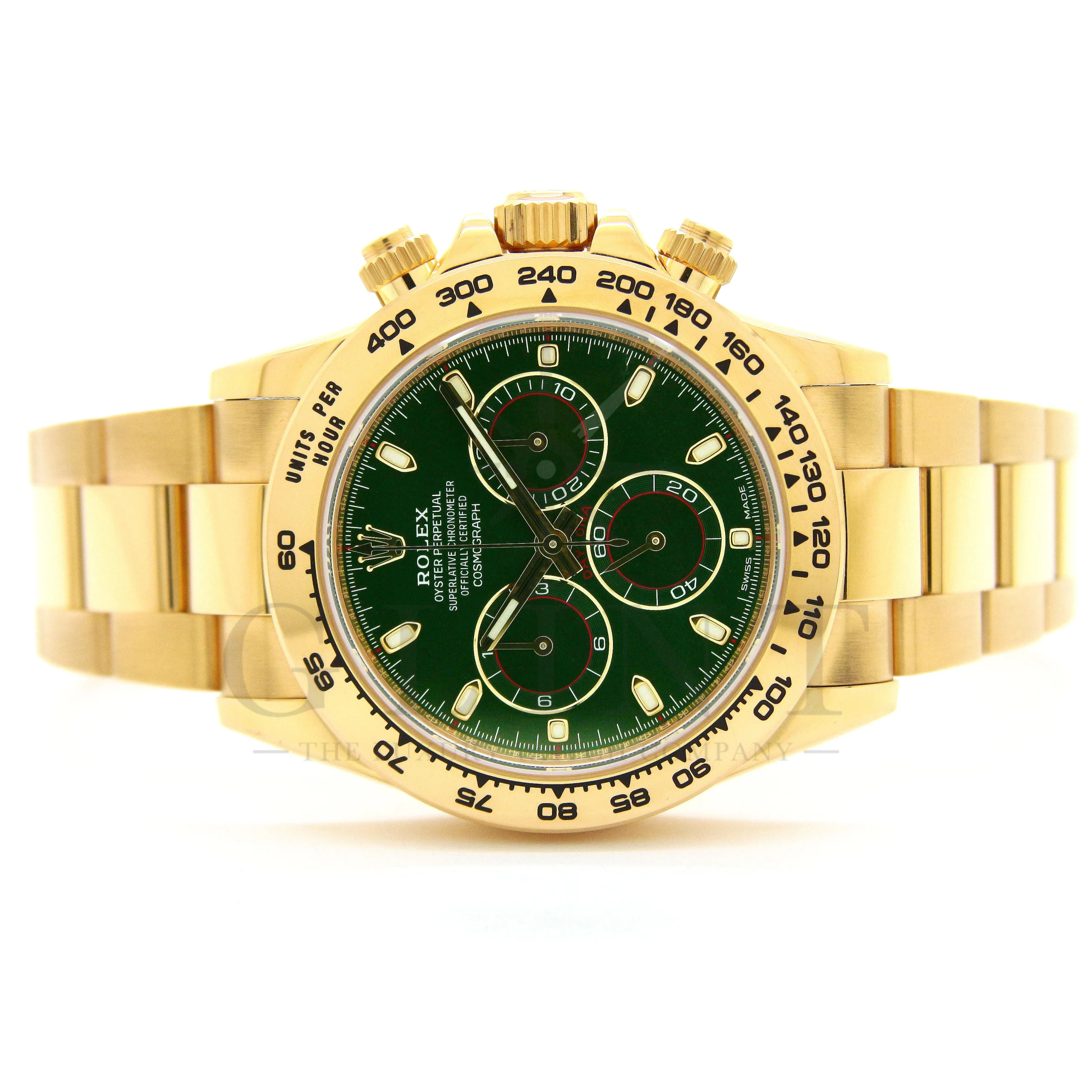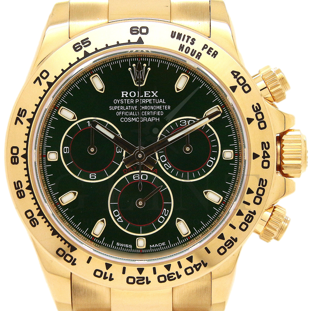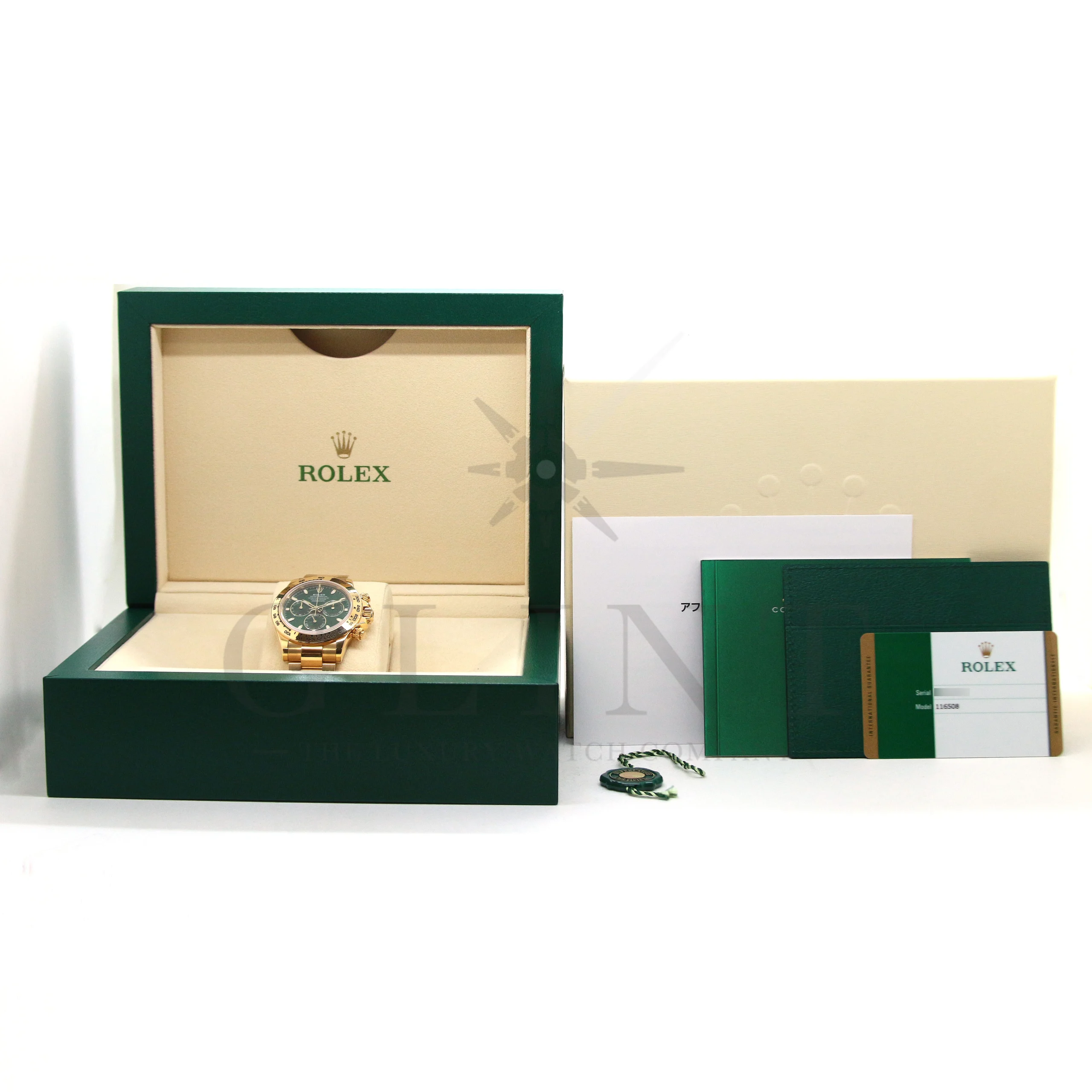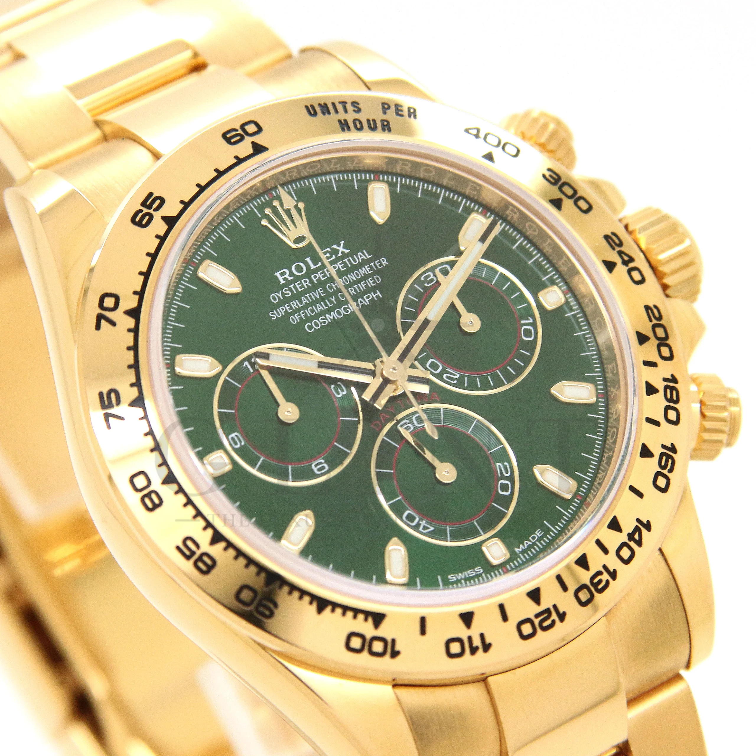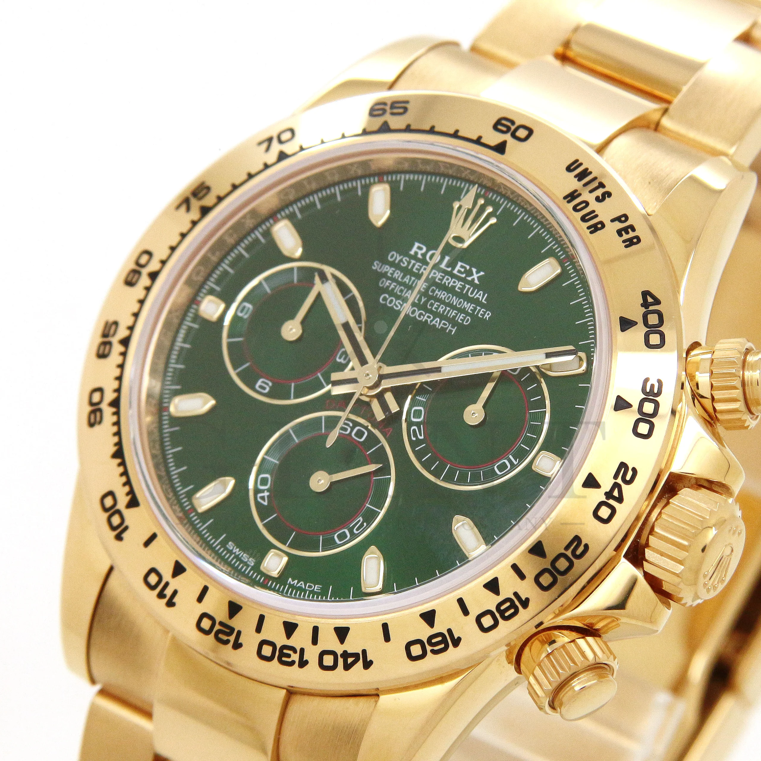 こちらはROLE デイトナ 18Kイエローゴールドモデルです。2016年にRef.116528からマイナーチェンジしたRef.116508。タキメーターベゼルの表記が一新され、視認性が向上いたしました。文字盤にはサンレイ仕上げの色鮮やかなグリーンカラー。イエローゴールドと見事にマッチしており、独特の高級感を味わえる雰囲気となっております。希少なダイアルカラーのデイトナで独自の魅力を演出してみてはいかがでしょうか。