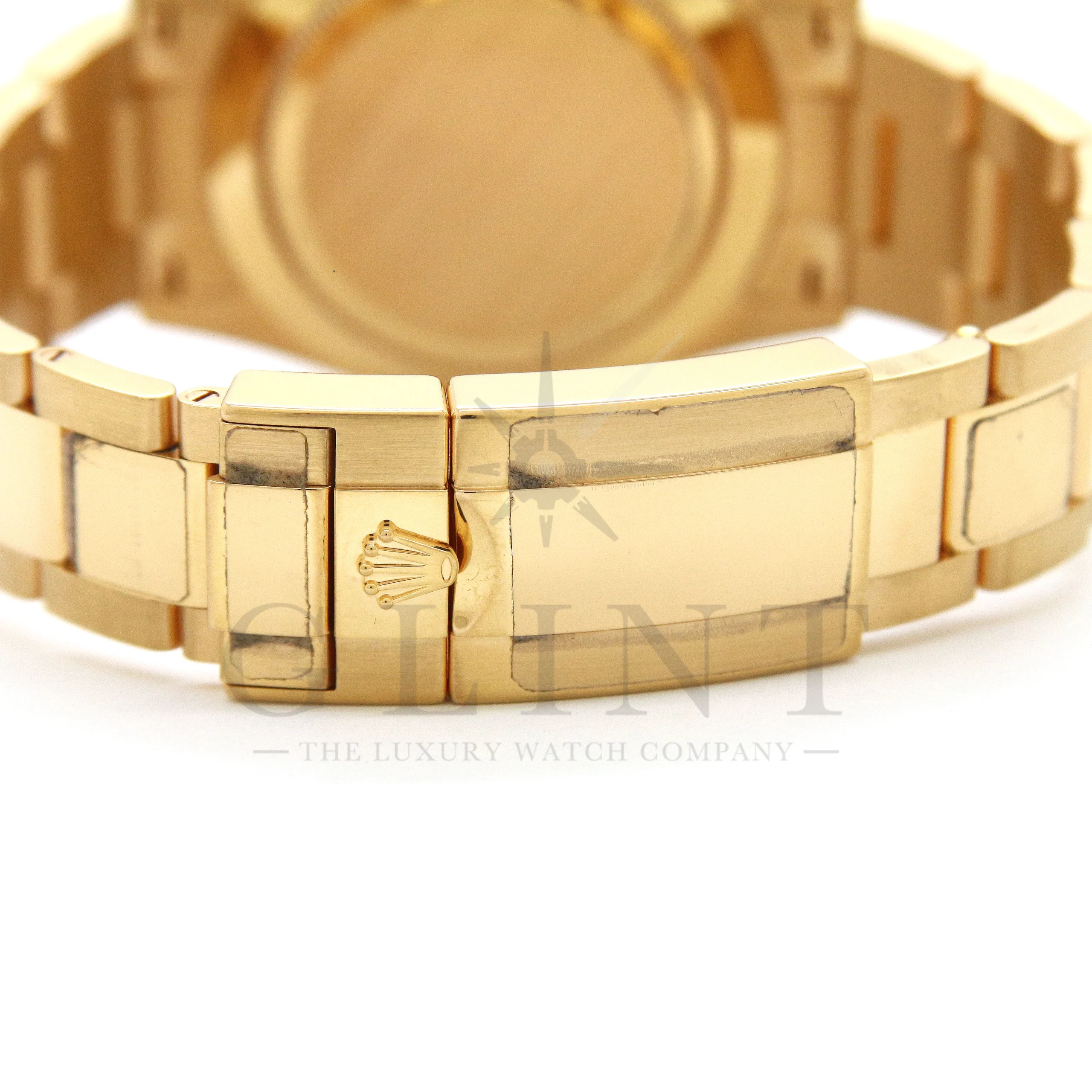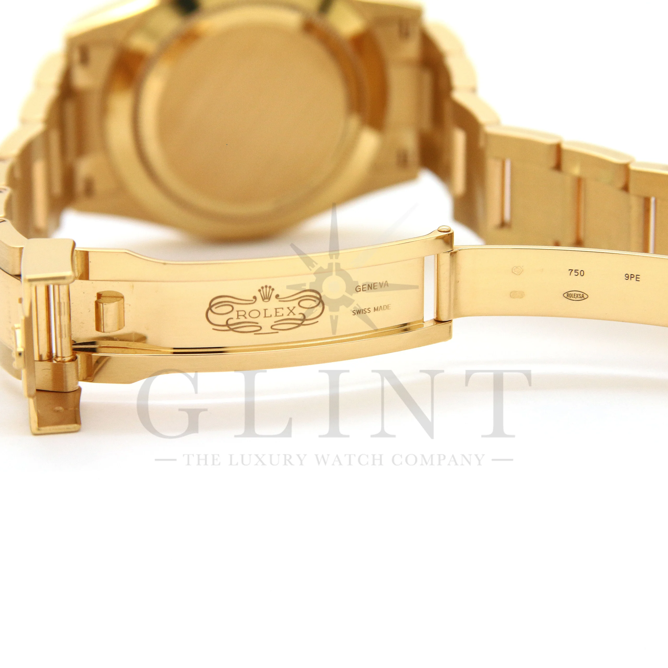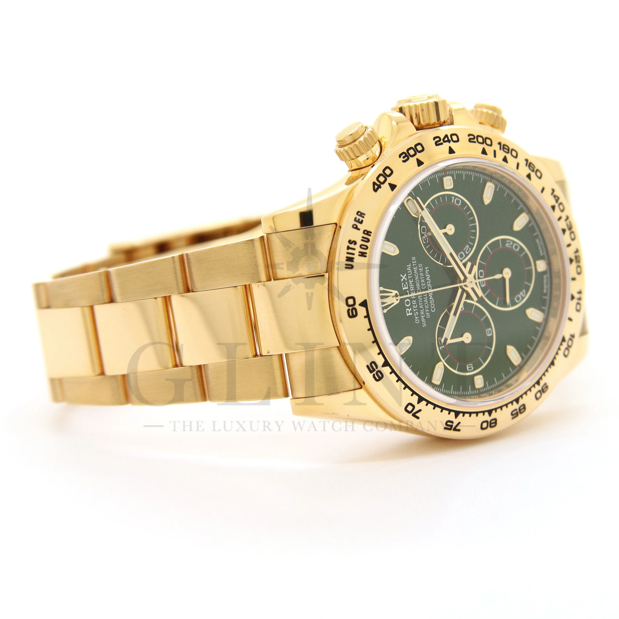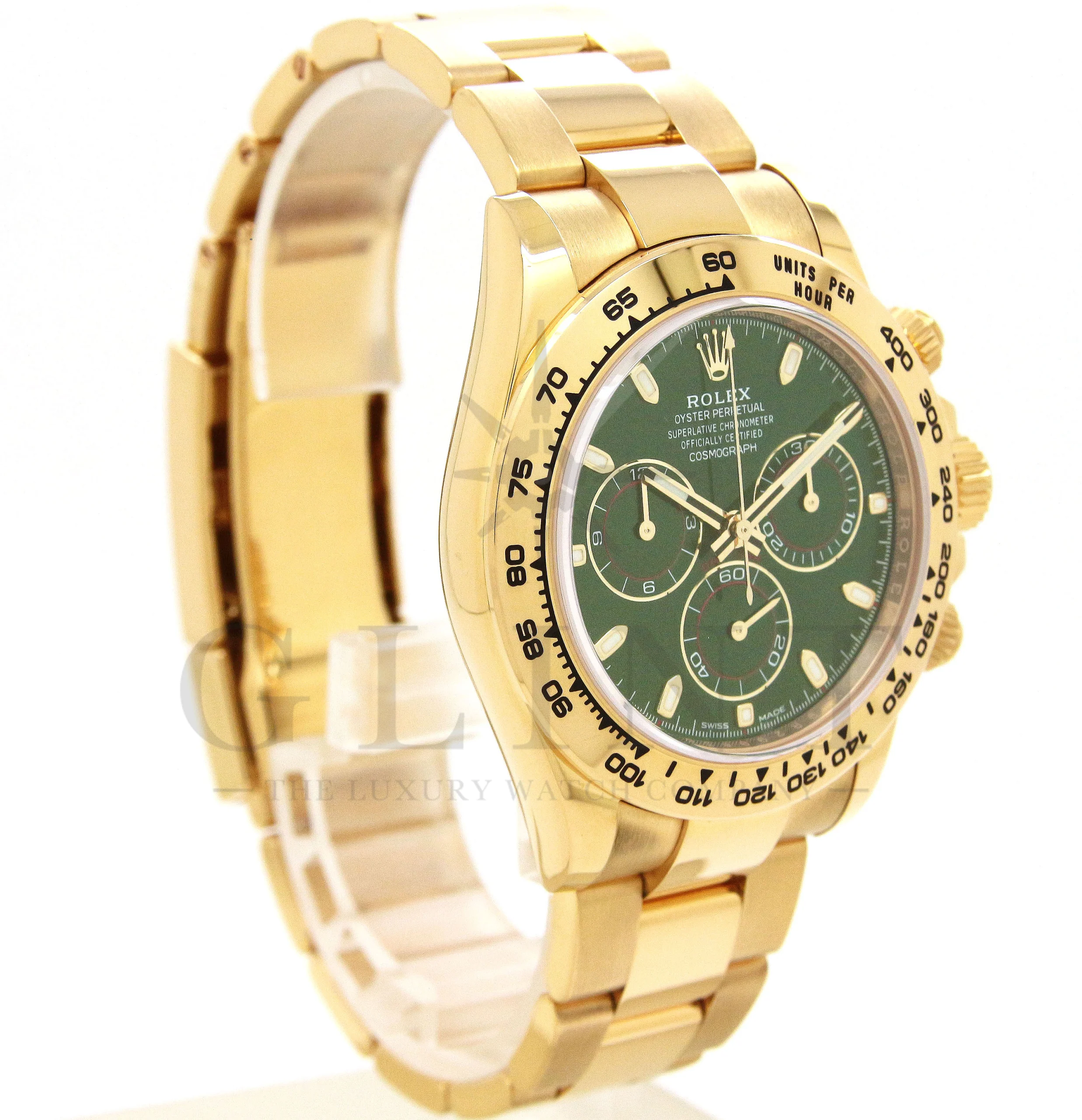 こちらはROLE デイトナ 18Kイエローゴールドモデルです。2016年にRef.116528からマイナーチェンジしたRef.116508。タキメーターベゼルの表記が一新され、視認性が向上いたしました。文字盤にはサンレイ仕上げの色鮮やかなグリーンカラー。イエローゴールドと見事にマッチしており、独特の高級感を味わえる雰囲気となっております。希少なダイアルカラーのデイトナで独自の魅力を演出してみてはいかがでしょうか。