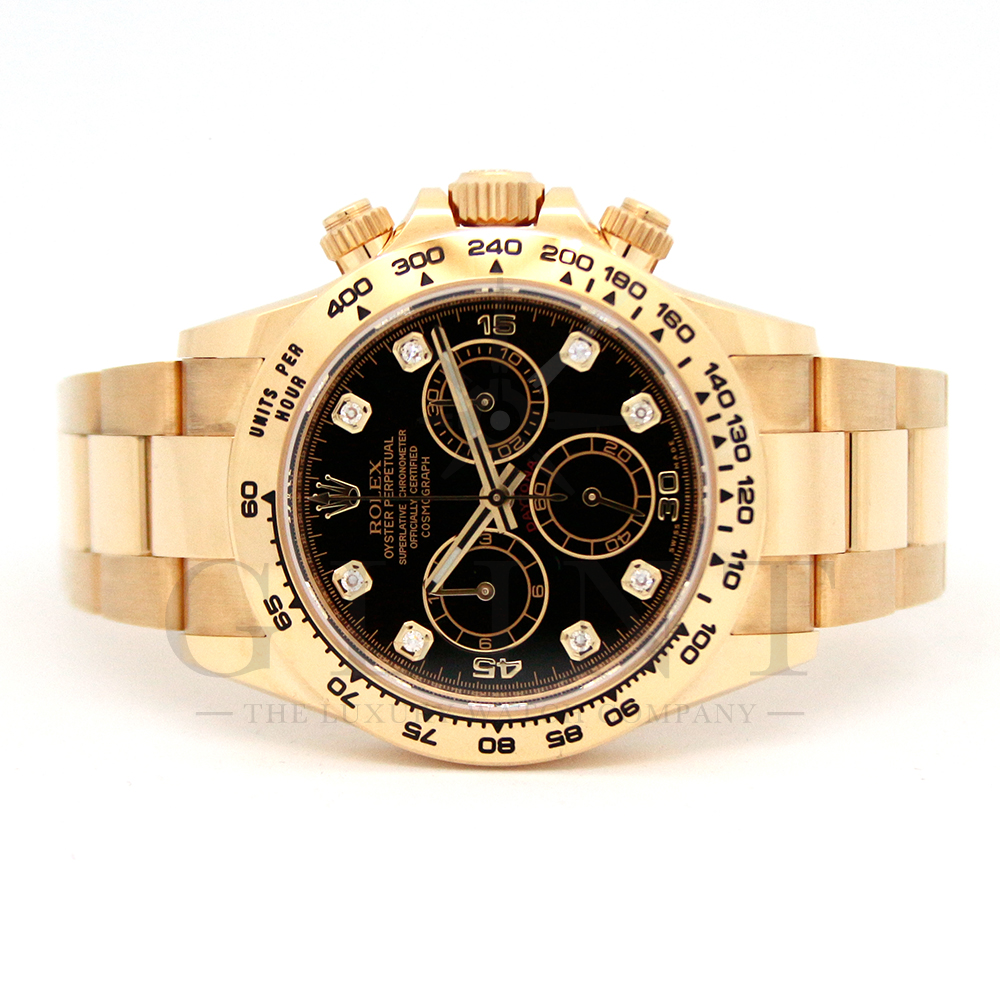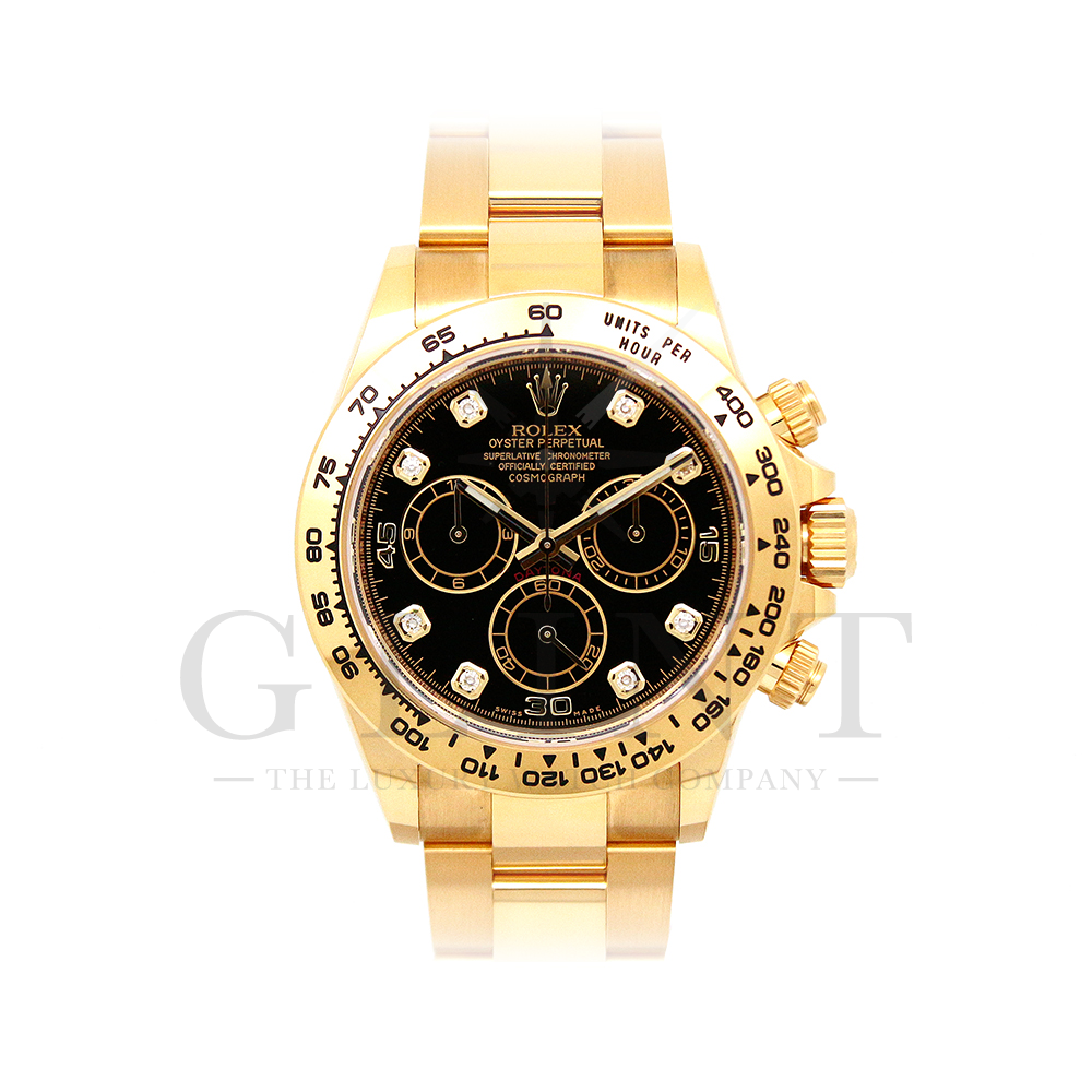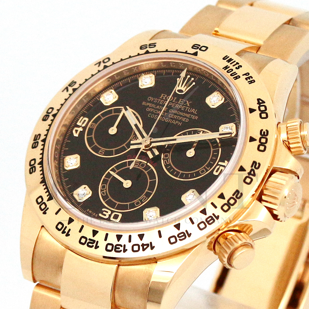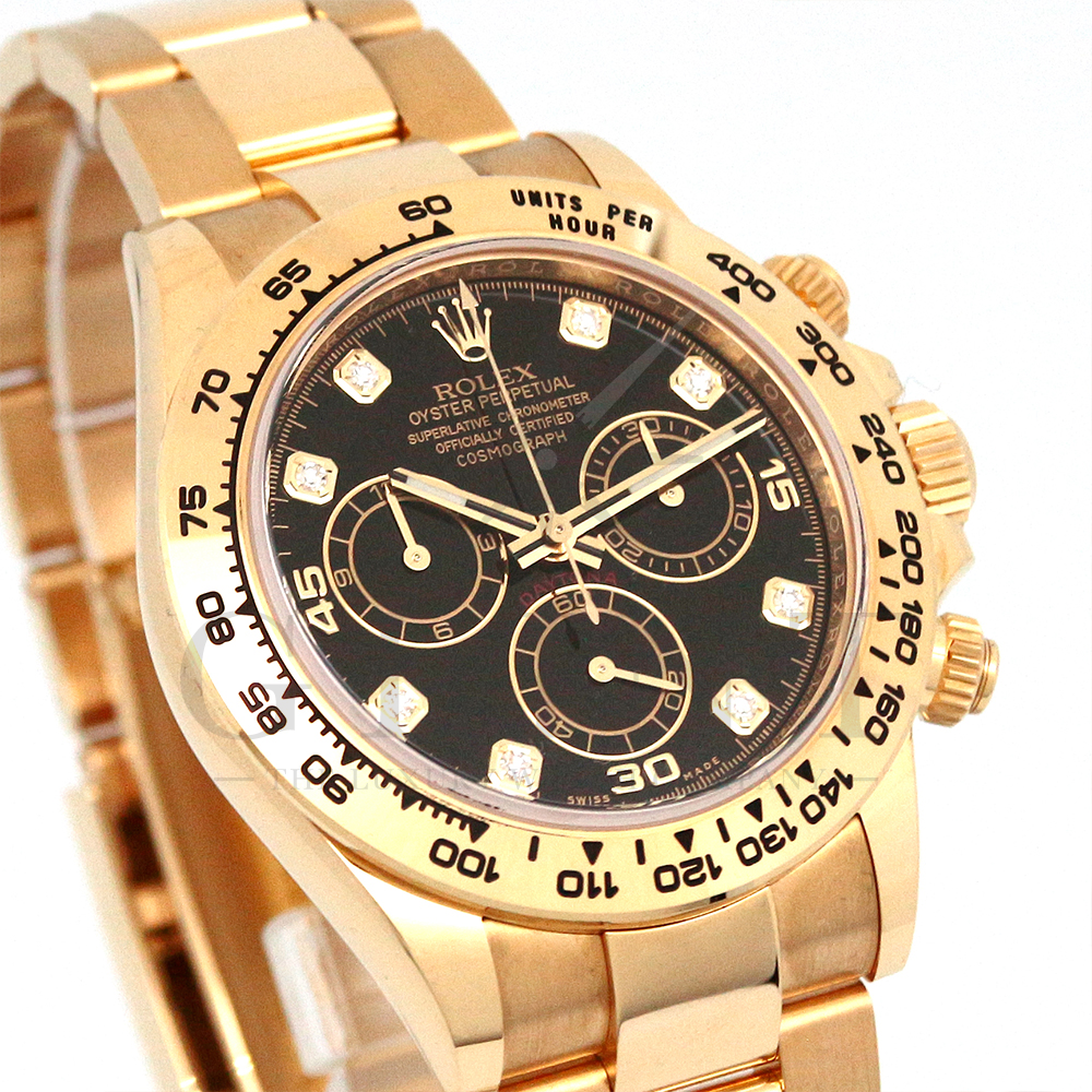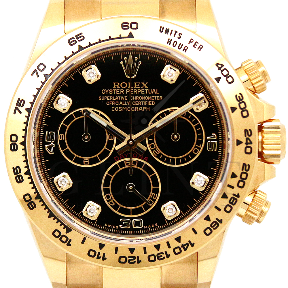 こちらはロレックス デイトナ 18Kイエローゴールドモデルです。2016年にRef.116528からマイナーチェンジしたRef.116508。タキメーターベゼルの表記が一新され、視認性が向上いたしました。ブラック文字盤に配されたダイヤモンドがイエローゴールドと見事にマッチしており、華やかな高級感を味わえる雰囲気となっております。金無垢ならでの重量感とステータス性を感じさせてくれるデイトナで他の人と差をつけてみてはいかがでしょうか。