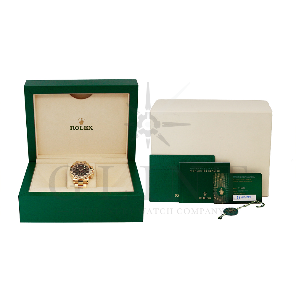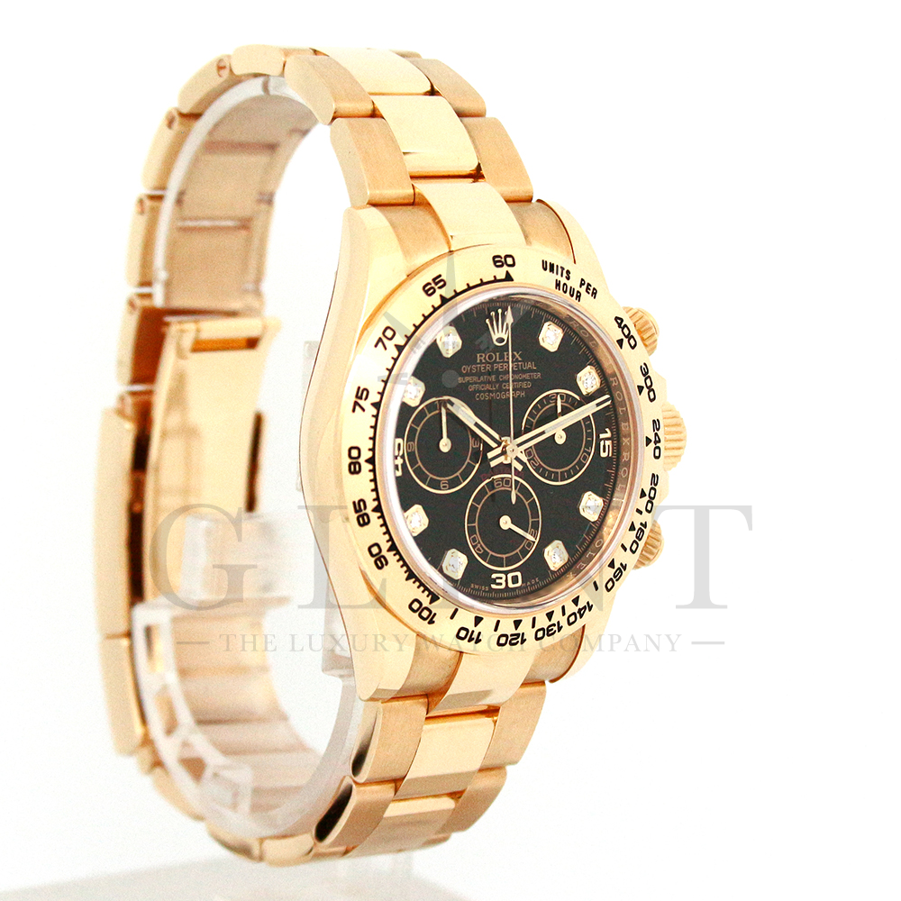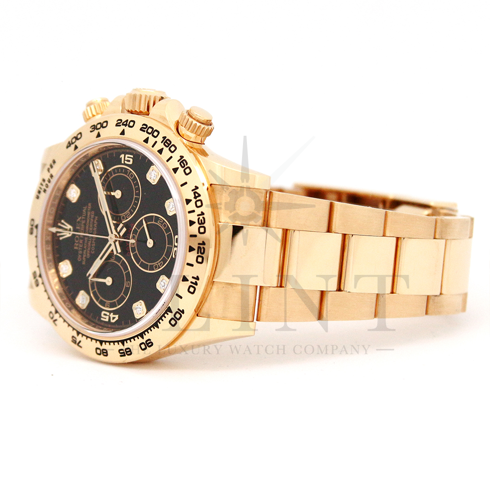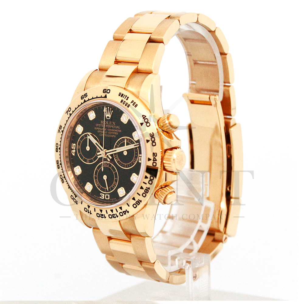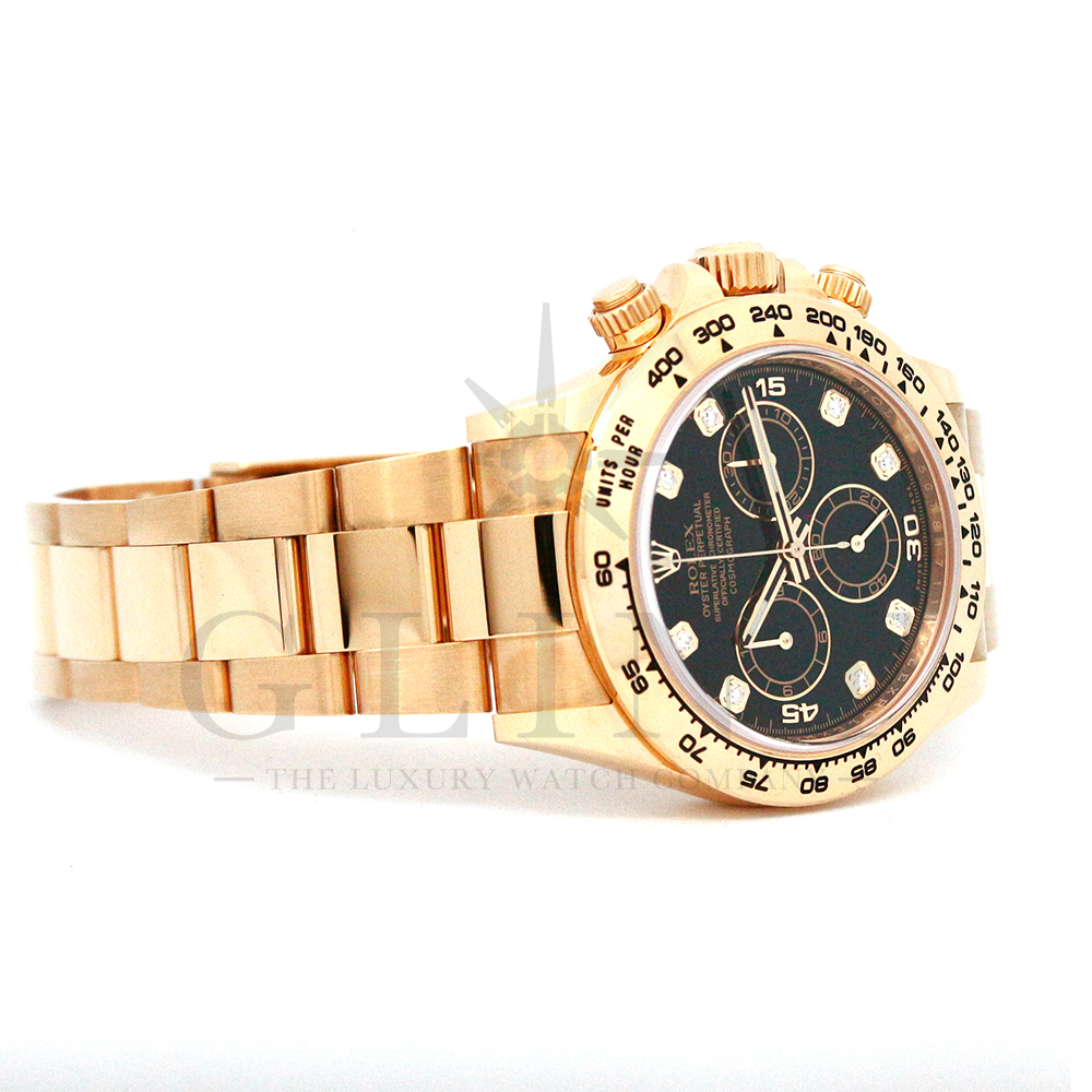 こちらはロレックス デイトナ 18Kイエローゴールドモデルです。2016年にRef.116528からマイナーチェンジしたRef.116508。タキメーターベゼルの表記が一新され、視認性が向上いたしました。ブラック文字盤に配されたダイヤモンドがイエローゴールドと見事にマッチしており、華やかな高級感を味わえる雰囲気となっております。金無垢ならでの重量感とステータス性を感じさせてくれるデイトナで他の人と差をつけてみてはいかがでしょうか。