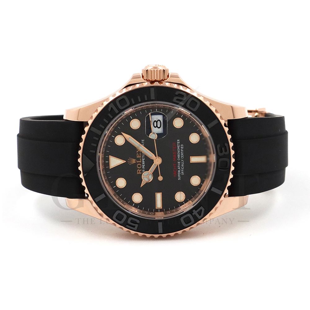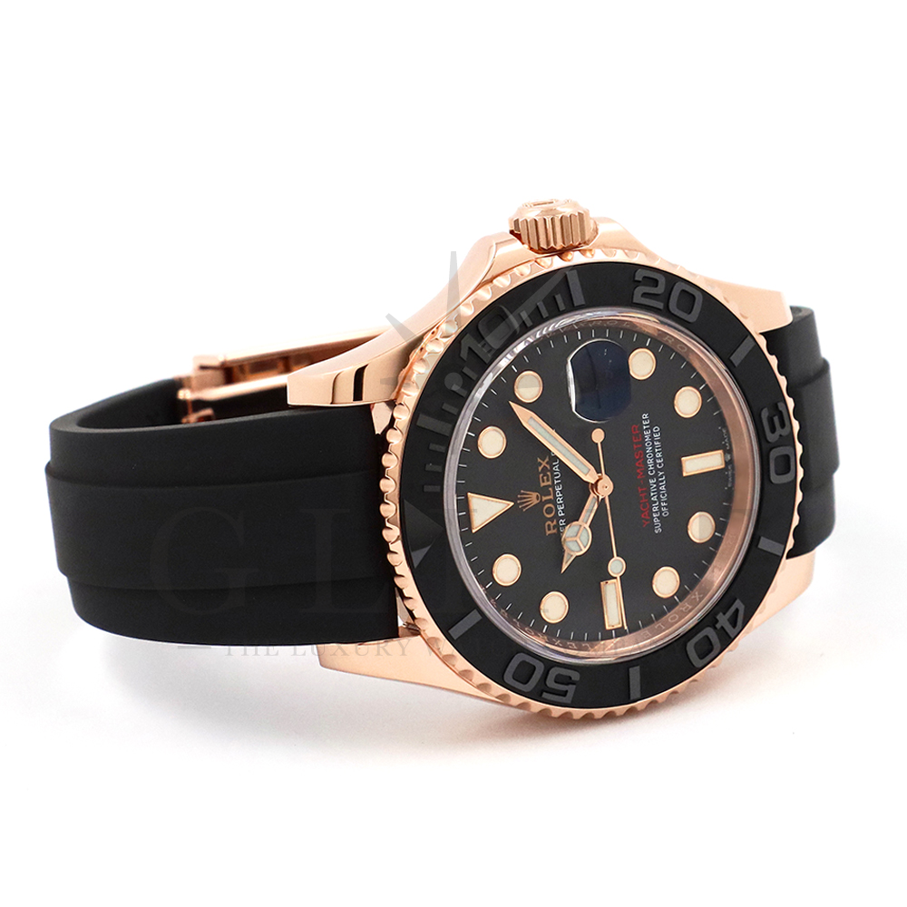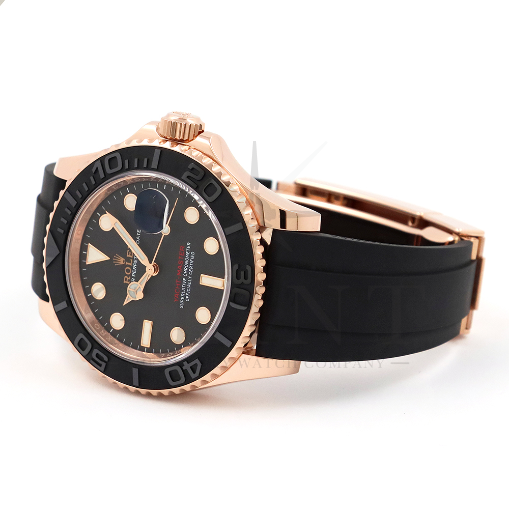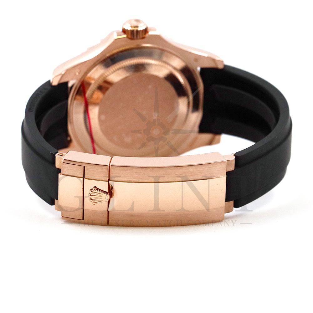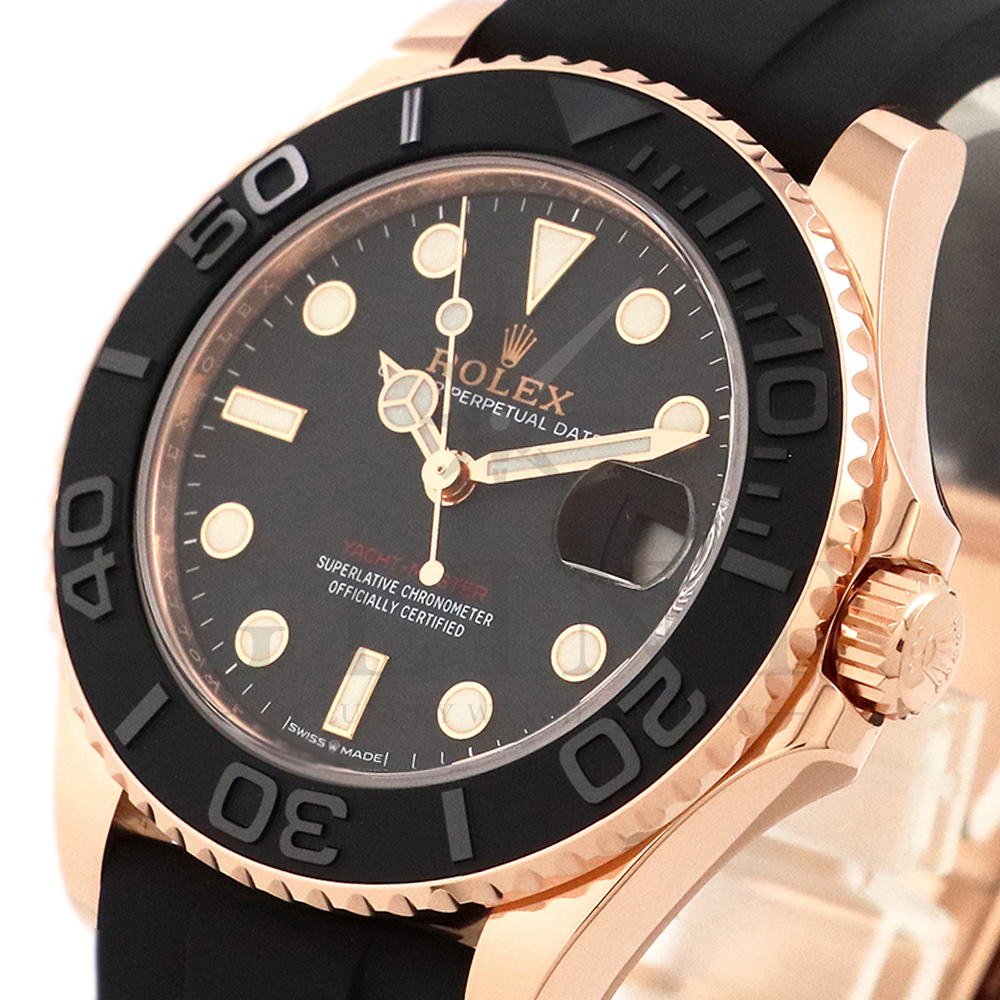 こちらはヨットマスター40 126655です。2019年に発表されたエバーローズゴールドモデルのヨットマスター。以前のモデルからは6時位置に王冠マークが足され、キャリバーがCal.3135からCal.3235に変更。また、バックルにはサブマリーナーなどで採用されているグライドロックシステムが搭載され、ブレスレットの調整が容易になりました。ブレスレットにはオイスターフレックスを採用し、軟性のあるチタン・ニッケル合金製ブレードを、しなやかで装着感に優れるエラストマー(人工ラバー)で覆っており、極めて高い耐久性と装着感を実現しております。従来のヨットマスターとは一線を画した高級感を味わえる一本です。