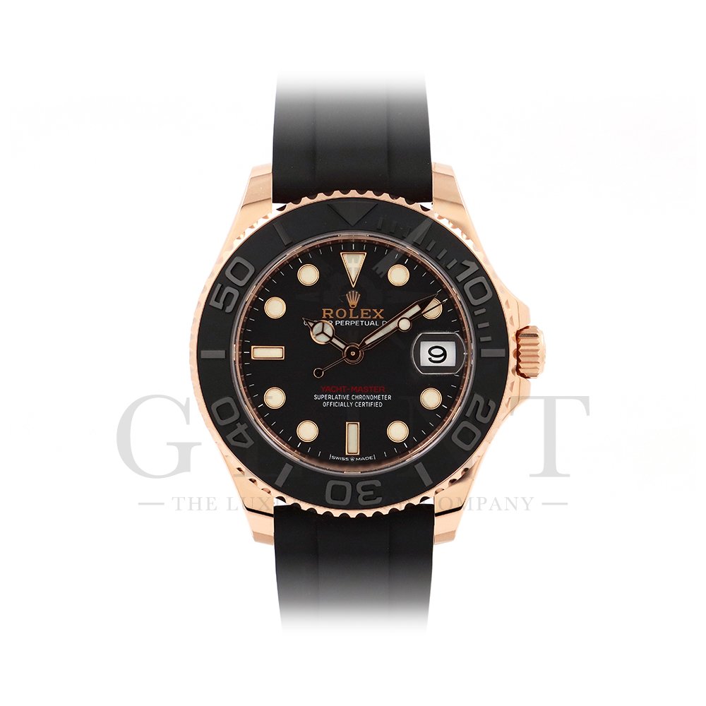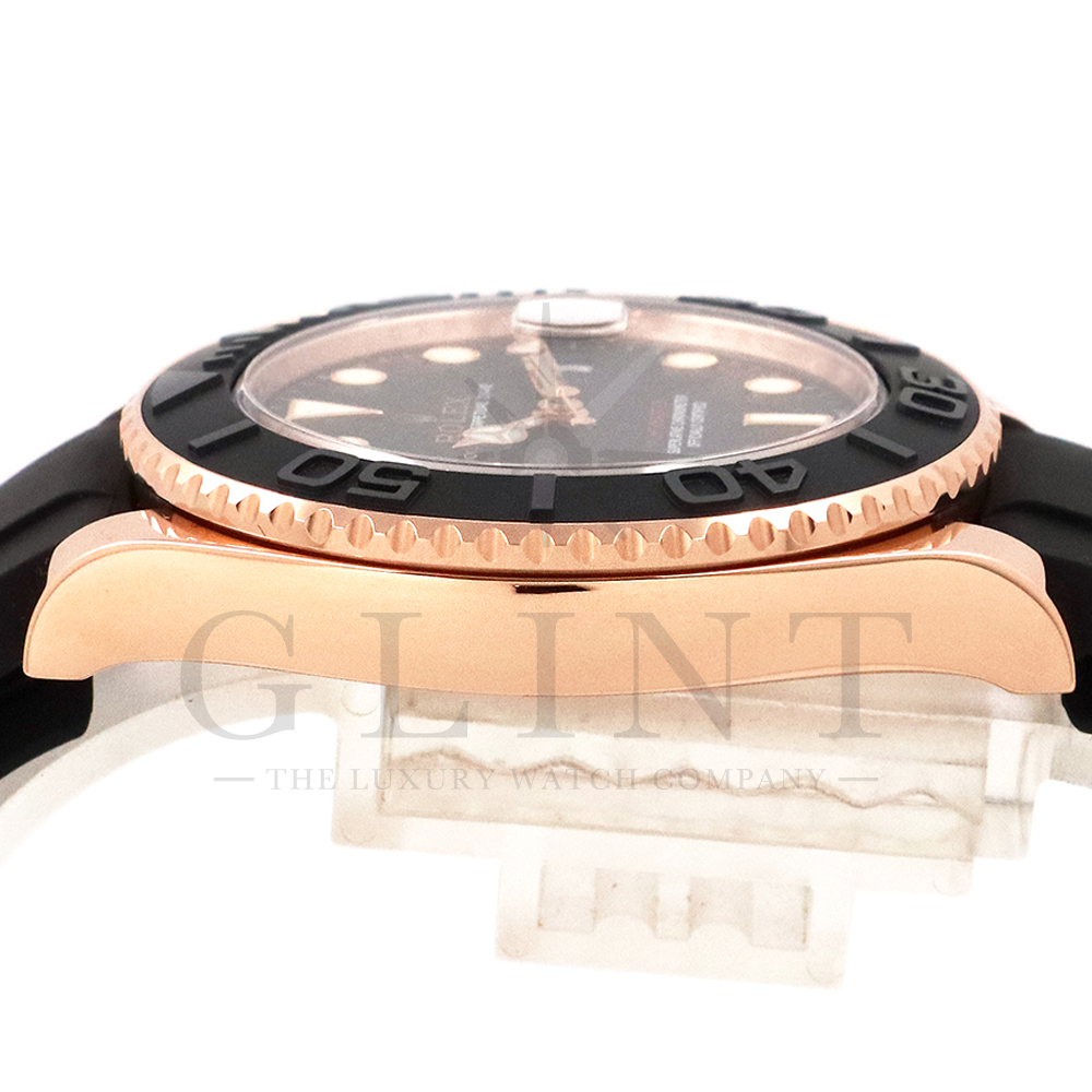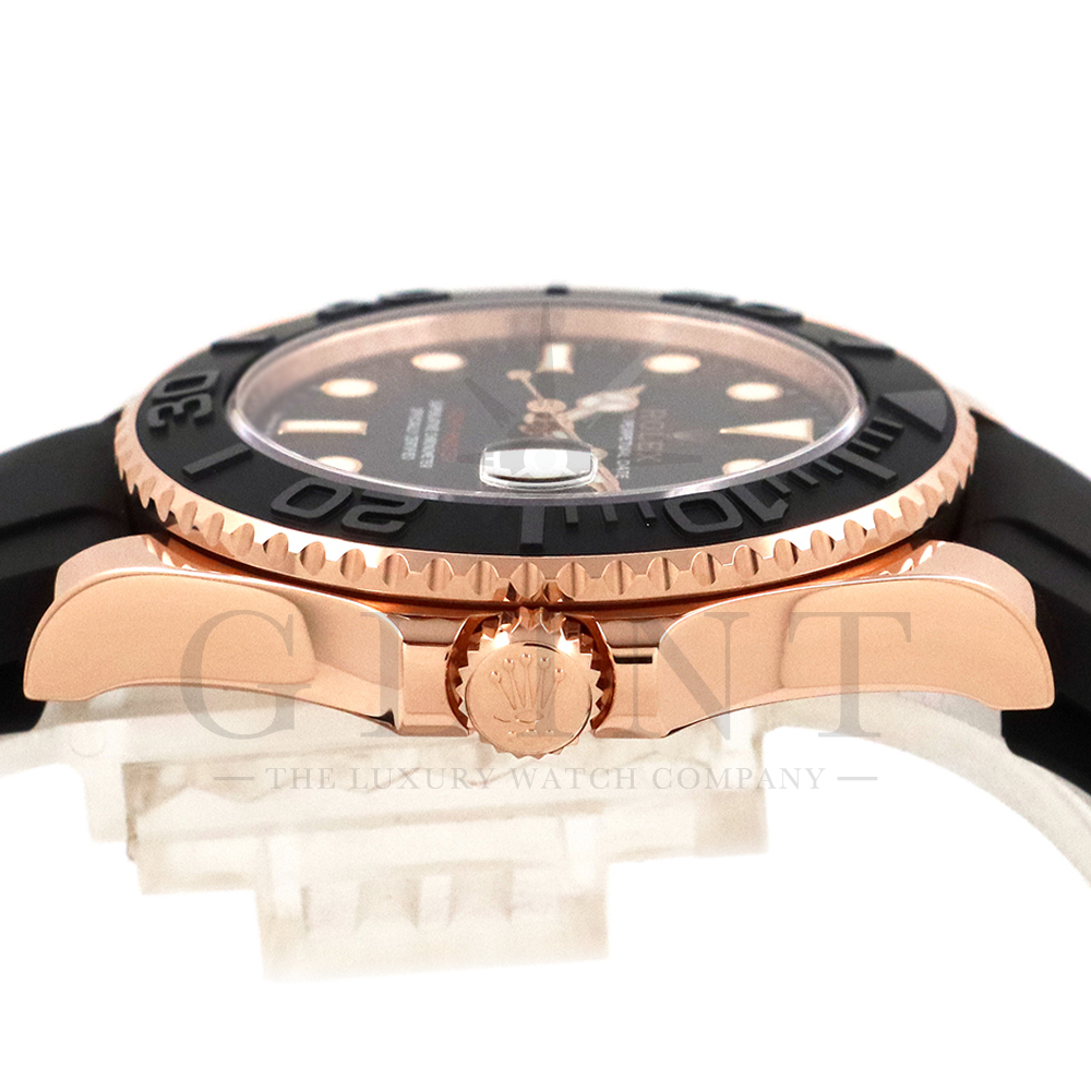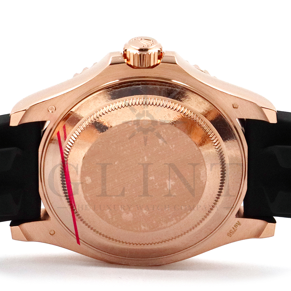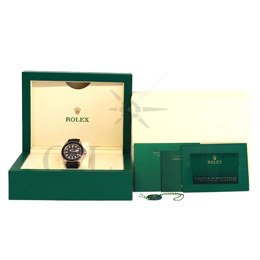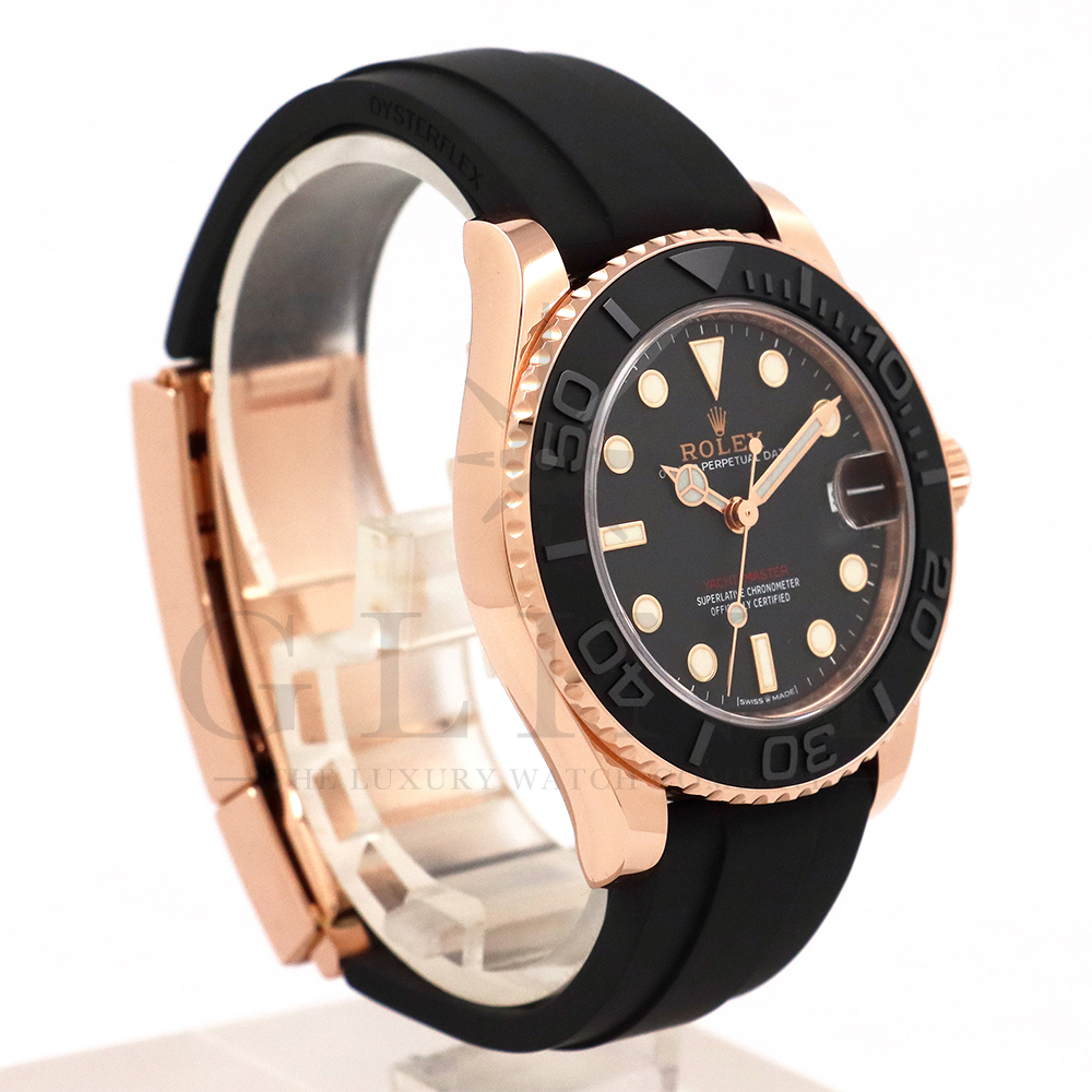 こちらはヨットマスター40 126655です。2019年に発表されたエバーローズゴールドモデルのヨットマスター。以前のモデルからは6時位置に王冠マークが足され、キャリバーがCal.3135からCal.3235に変更。また、バックルにはサブマリーナーなどで採用されているグライドロックシステムが搭載され、ブレスレットの調整が容易になりました。ブレスレットにはオイスターフレックスを採用し、軟性のあるチタン・ニッケル合金製ブレードを、しなやかで装着感に優れるエラストマー(人工ラバー)で覆っており、極めて高い耐久性と装着感を実現しております。従来のヨットマスターとは一線を画した高級感を味わえる一本です。