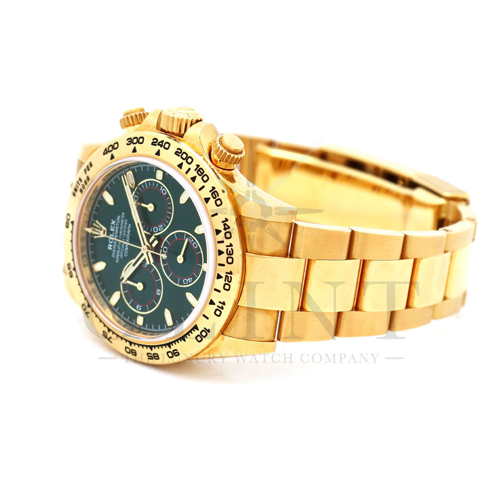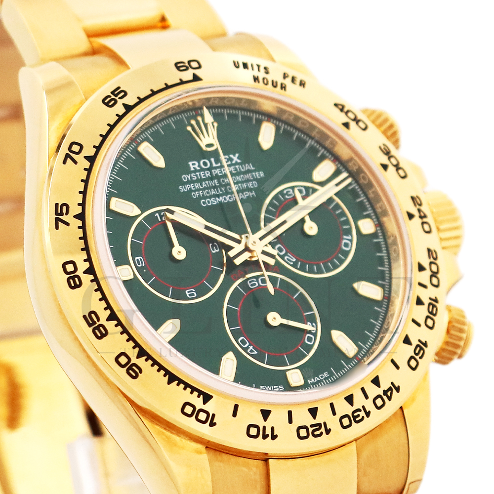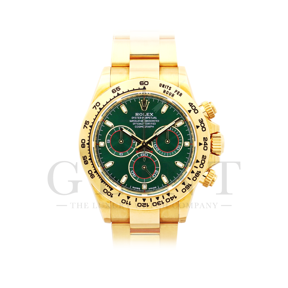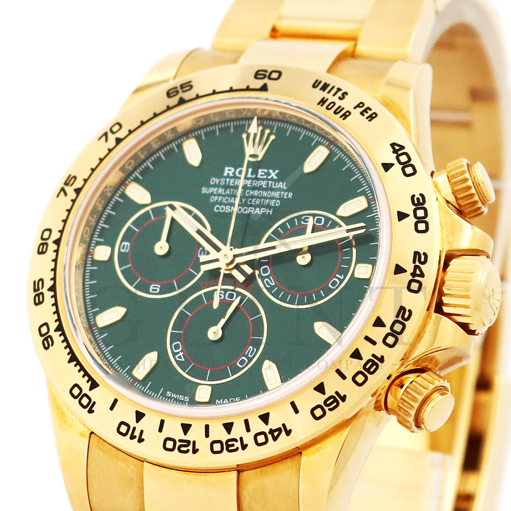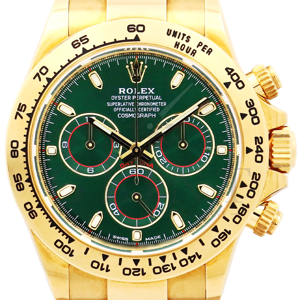 こちらはROLEX デイトナ 18Kイエローゴールドモデルです。2016年にRef.116528からマイナーチェンジしたRef.116508。タキメーターベゼルの表記が一新され、視認性が向上いたしました。文字盤にはグリーン。イエローゴールドと見事にマッチしており、独特の高級感を味わえる雰囲気となっております。金無垢ならでの重量感とステータス性を感じさせてくれるデイトナで他の人と差をつけてみてはいかがでしょうか。
