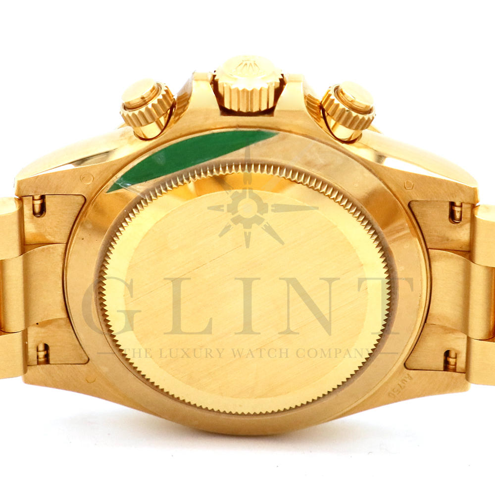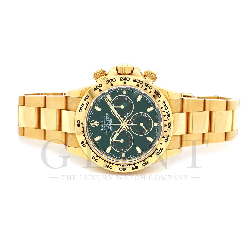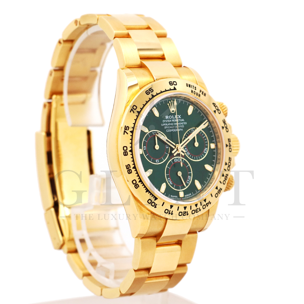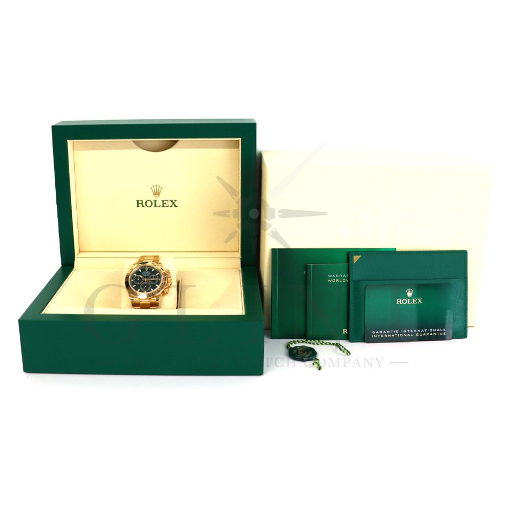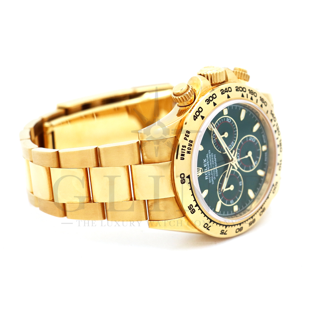 こちらはROLEX デイトナ 18Kイエローゴールドモデルです。2016年にRef.116528からマイナーチェンジしたRef.116508。タキメーターベゼルの表記が一新され、視認性が向上いたしました。文字盤にはグリーン。イエローゴールドと見事にマッチしており、独特の高級感を味わえる雰囲気となっております。金無垢ならでの重量感とステータス性を感じさせてくれるデイトナで他の人と差をつけてみてはいかがでしょうか。