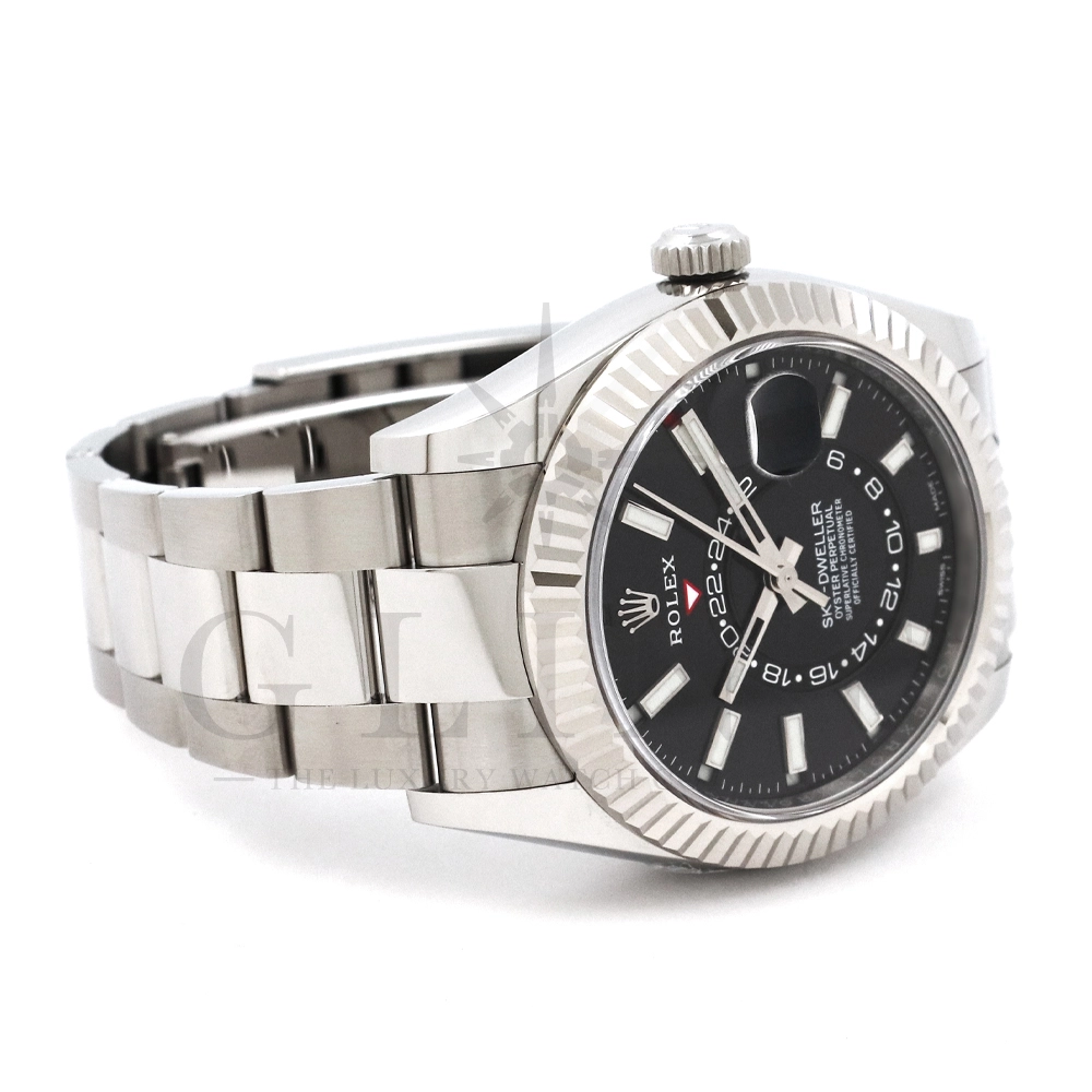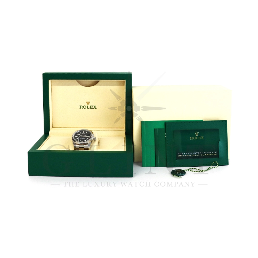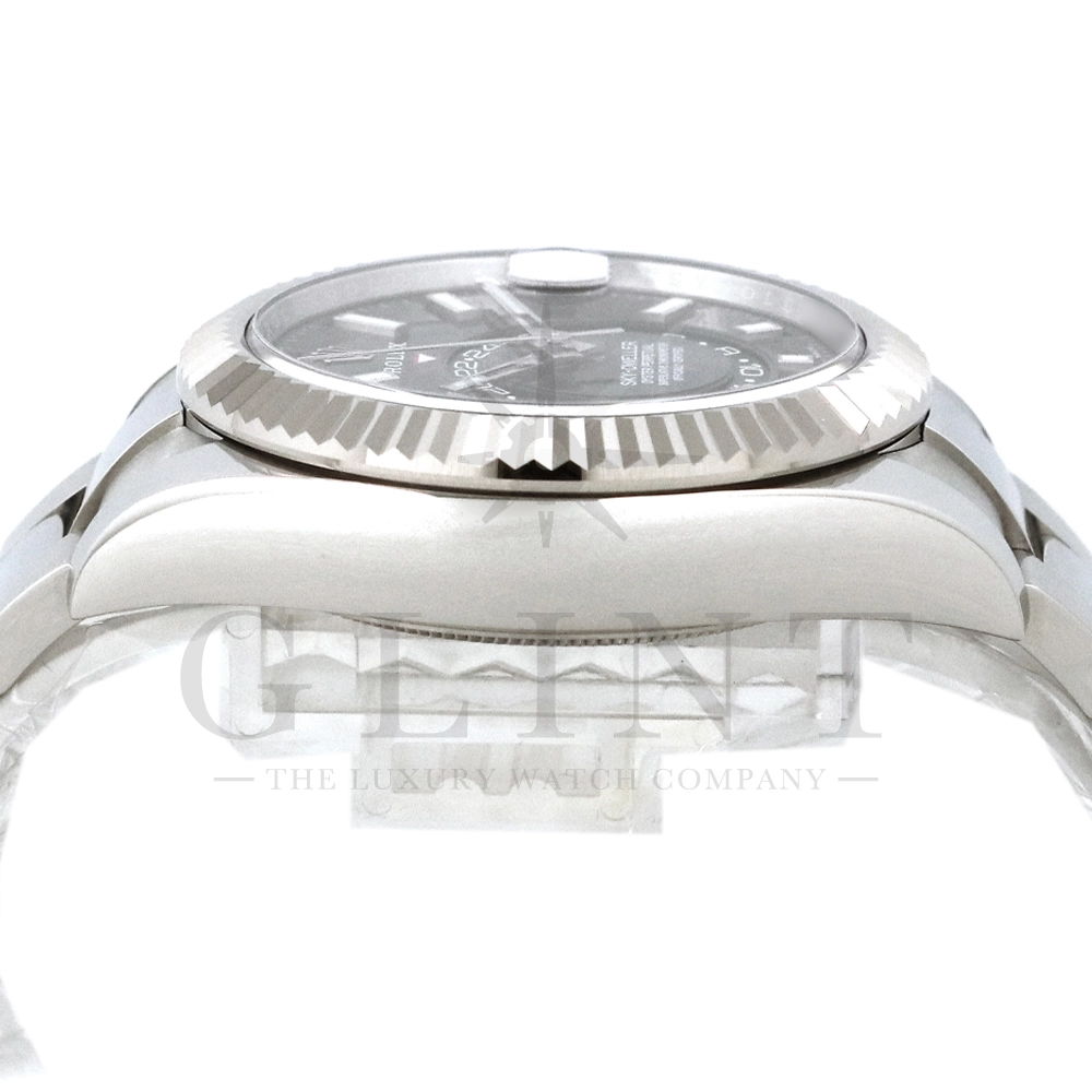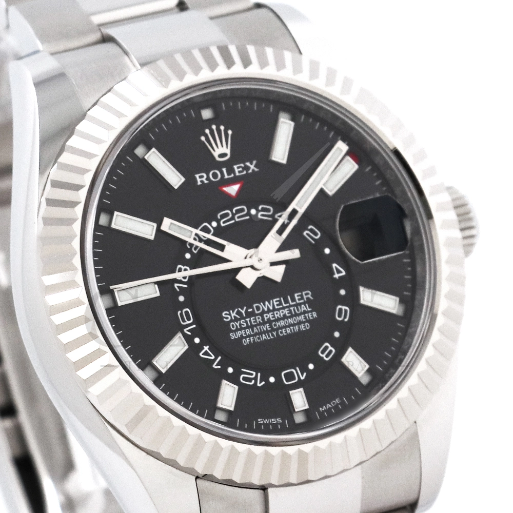 こちらはロレックス スカイドゥエラー 326934です。デイデイトと同様に金無垢素材のみを使用していた同モデルから遂に2017年よりステンレス×ホワイトゴールドのロレゾールモデルが誕生。中でも、ブライトブラックダイアルは精悍な印象で高級感を感じさせてくれます。ムーブメントにはロレックスが完全自社開発し、初のセミコンプリケーションキャリバーとなるCal.9001を搭載しており、3月1日のみに手動調整するだけで1年間実用可能なアニュアルカレンダーとデュアルタイム表示を搭載。高級感と実用性を見事に融合させたロレックス最高峰のモデルと言えるでしょう。
