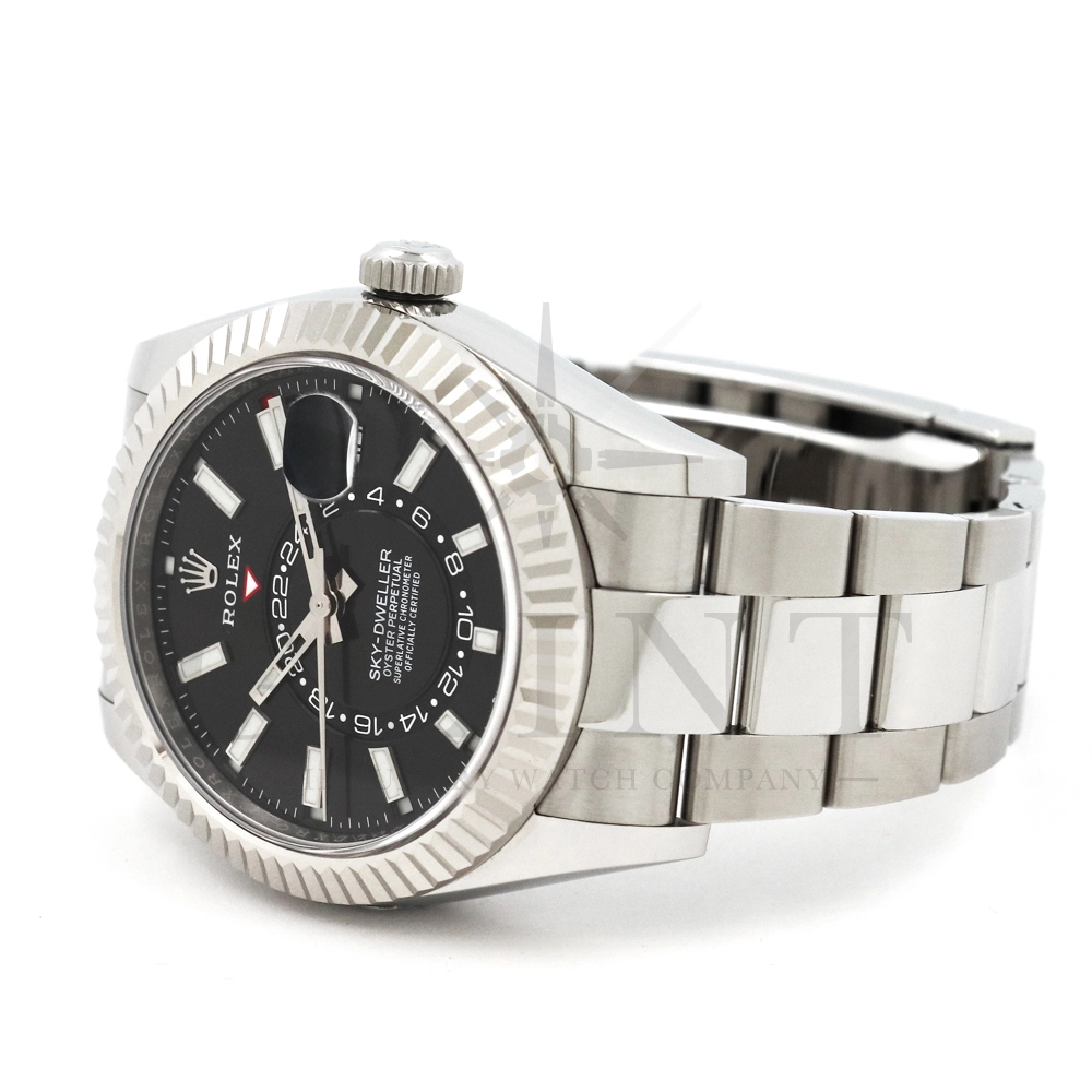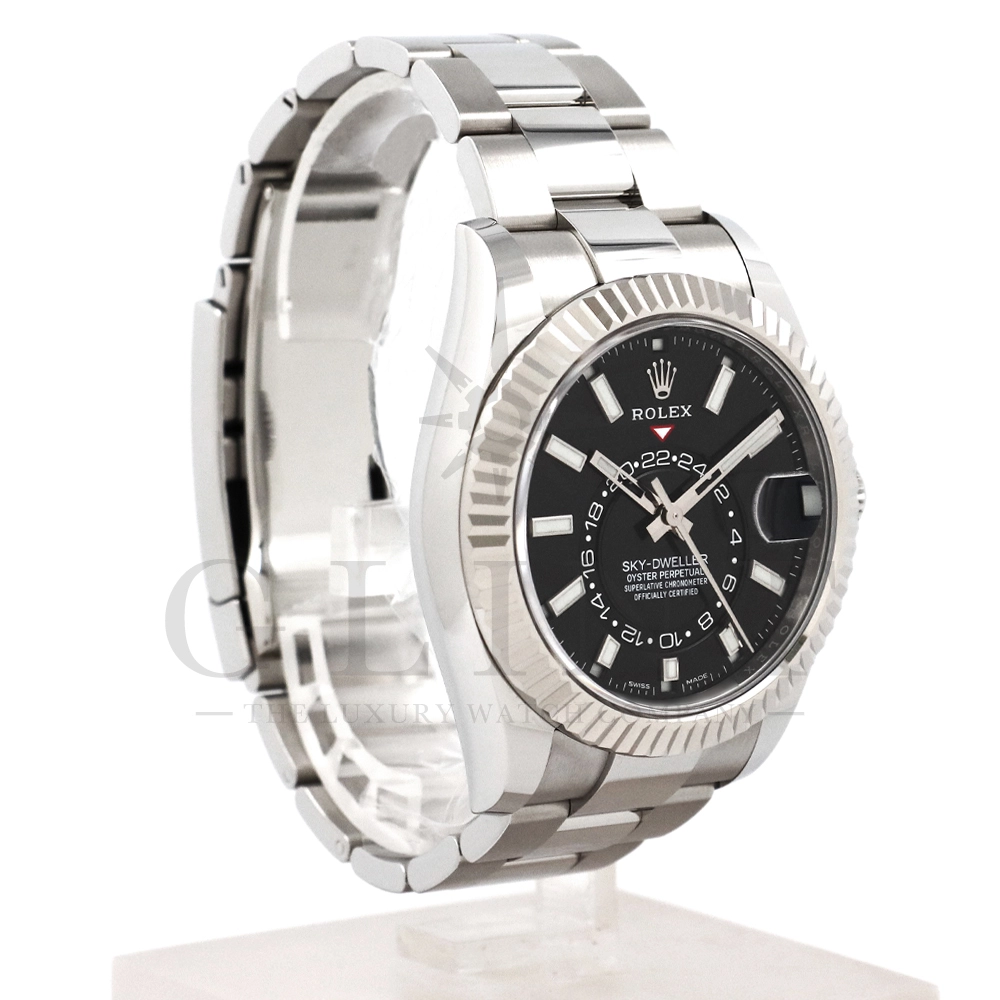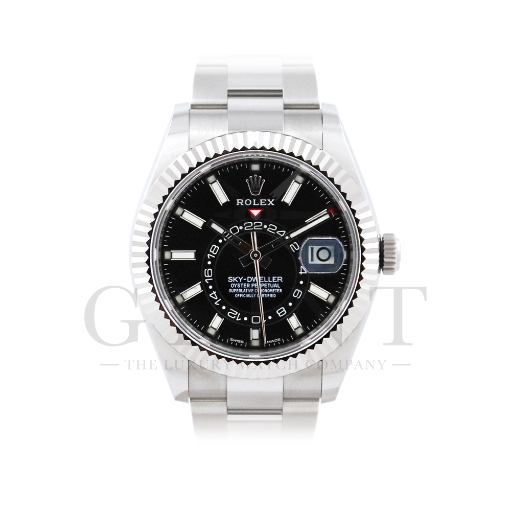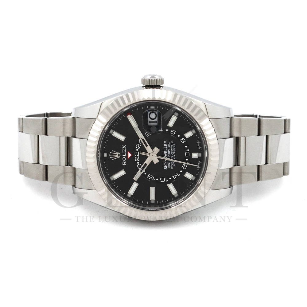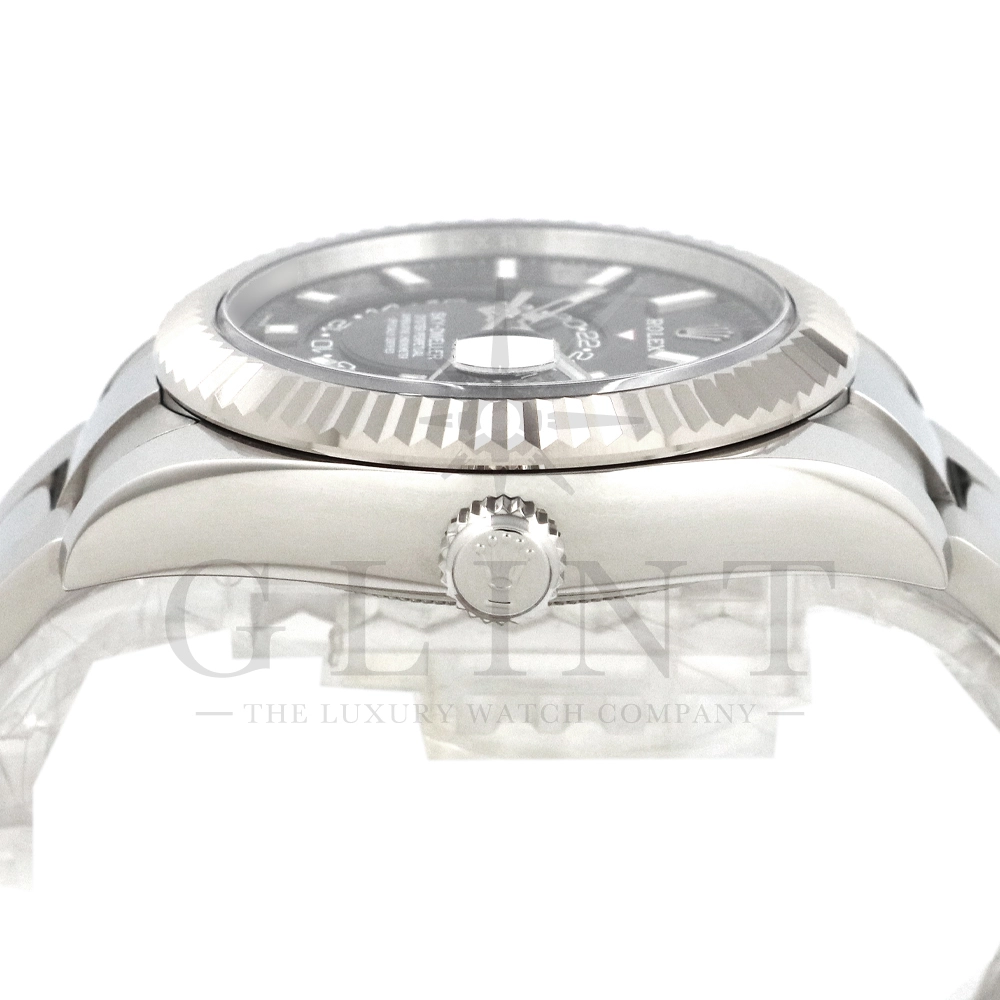 こちらはロレックス スカイドゥエラー 326934です。デイデイトと同様に金無垢素材のみを使用していた同モデルから遂に2017年よりステンレス×ホワイトゴールドのロレゾールモデルが誕生。中でも、ブライトブラックダイアルは精悍な印象で高級感を感じさせてくれます。ムーブメントにはロレックスが完全自社開発し、初のセミコンプリケーションキャリバーとなるCal.9001を搭載しており、3月1日のみに手動調整するだけで1年間実用可能なアニュアルカレンダーとデュアルタイム表示を搭載。高級感と実用性を見事に融合させたロレックス最高峰のモデルと言えるでしょう。