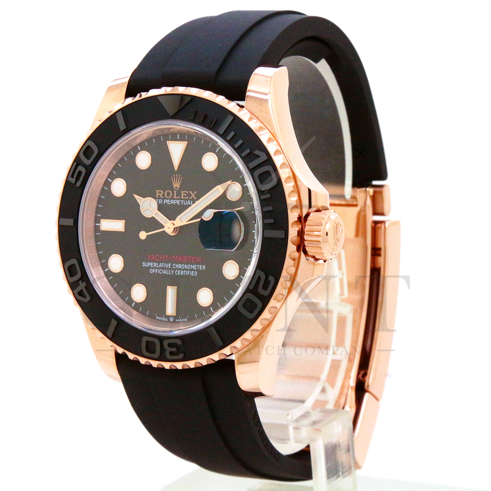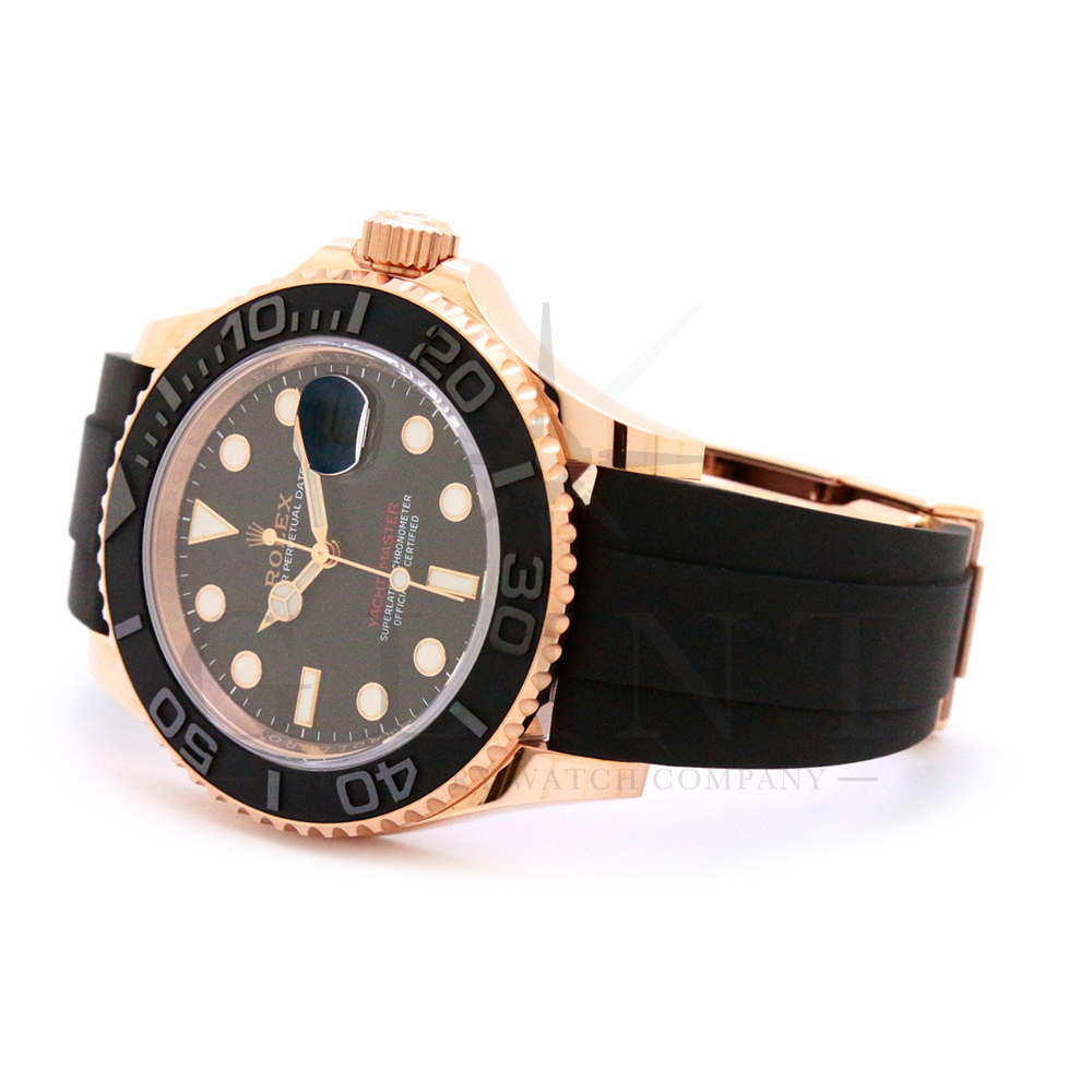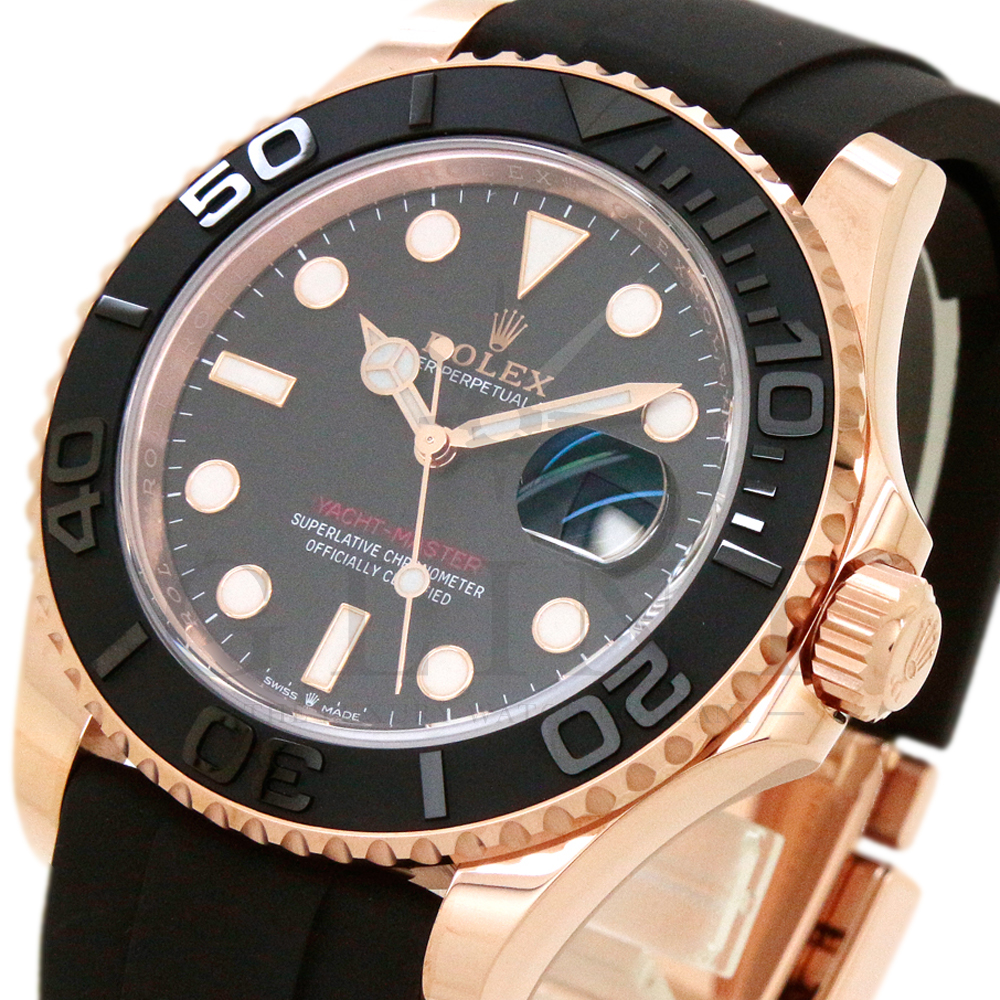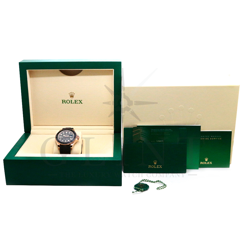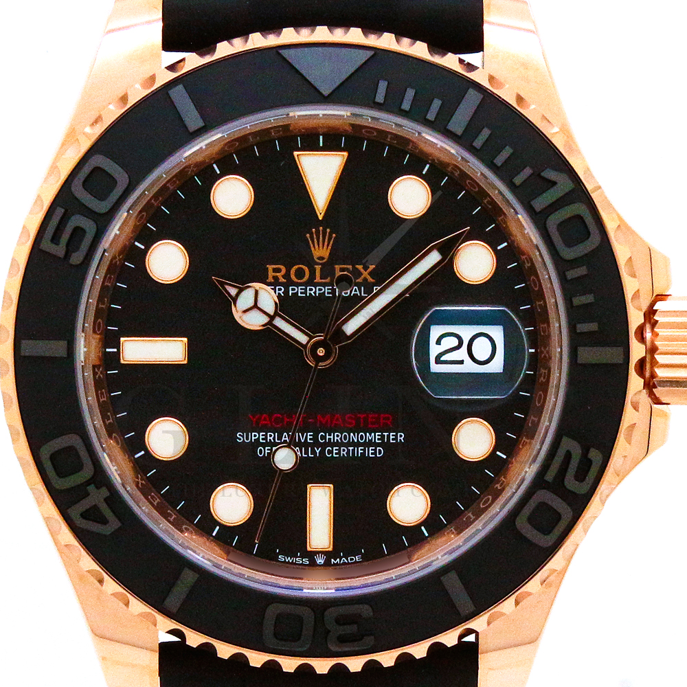 こちらはヨットマスター40 126655です。2019年に発表されたエバーローズゴールドモデルのヨットマスター。以前のモデルからは6時位置に王冠マークが足され、キャリバーがCal.3135からCal.3235に変更。また、バックルにはサブマリーナーなどで採用されているグライドロックシステムが搭載され、ブレスレットの調整が容易になりました。ブレスレットにはオイスターフレックスを採用し、軟性のあるチタン・ニッケル合金製ブレードを、しなやかで装着感に優れるエラストマー(人工ラバー)で覆っており、極めて高い耐久性と装着感を実現しております。従来のヨットマスターとは一線を画した高級感を味わえる一本です。