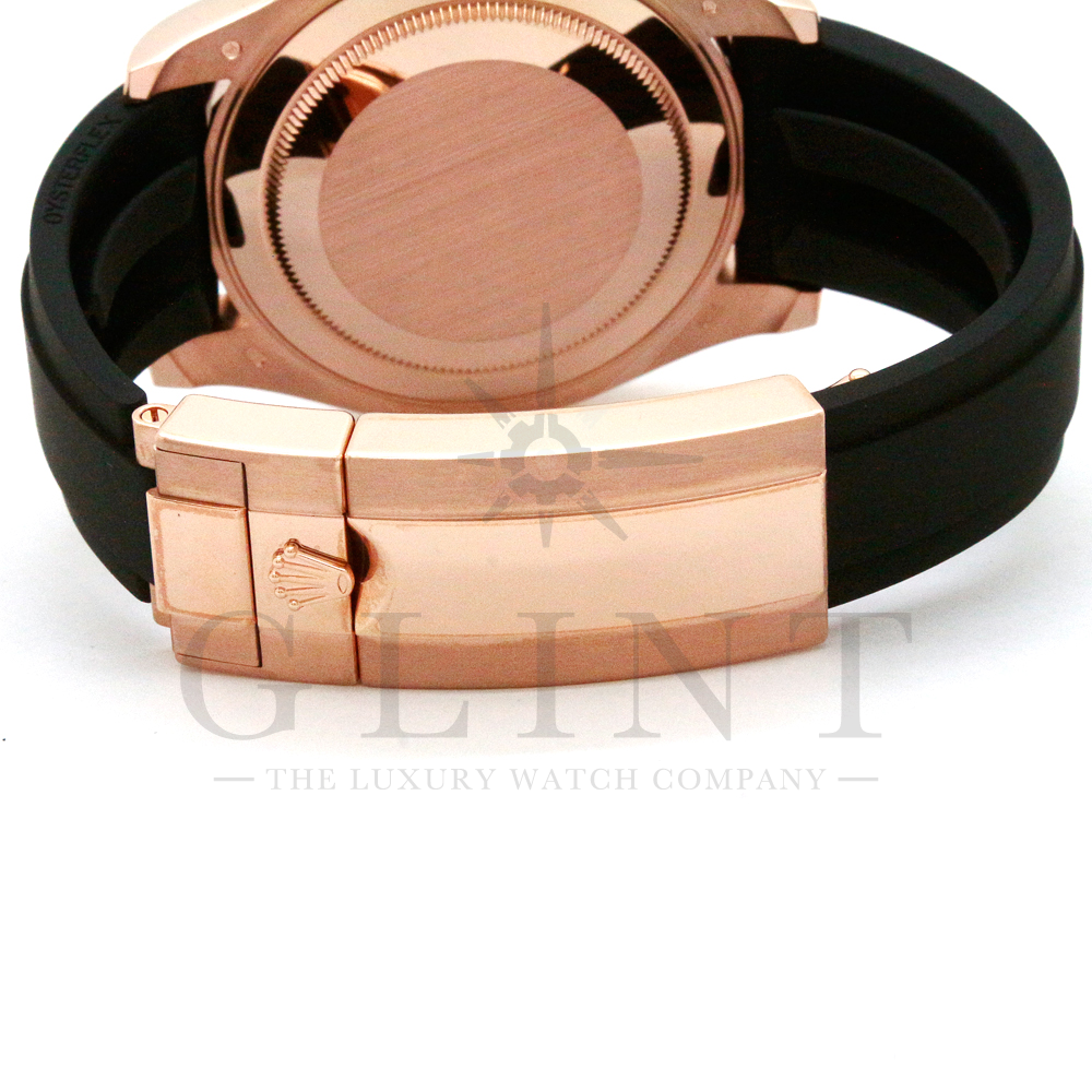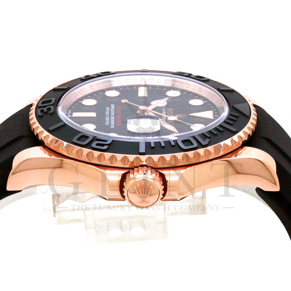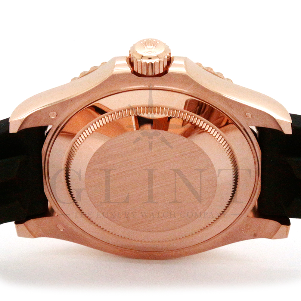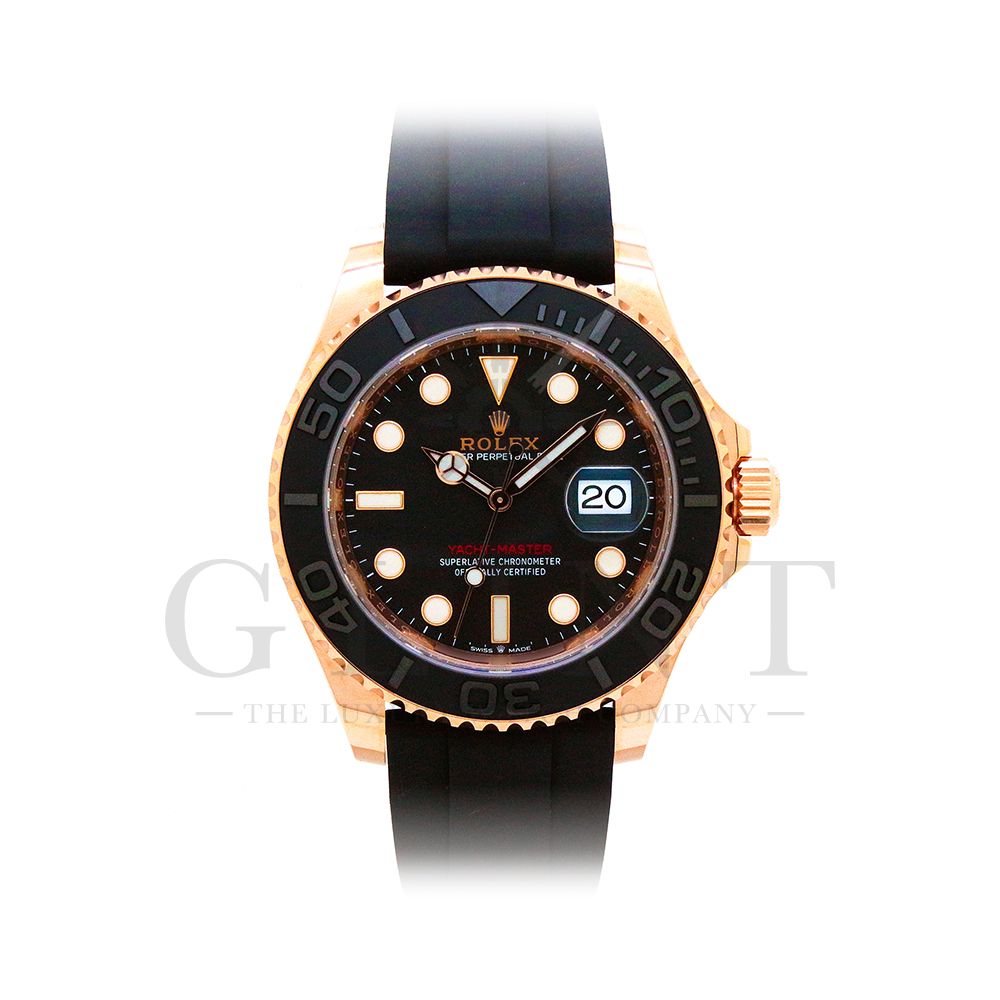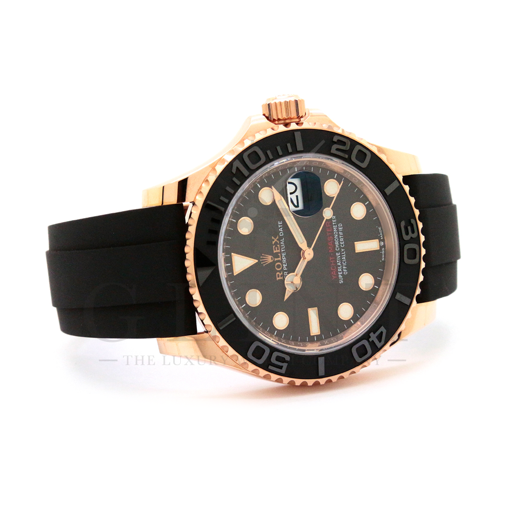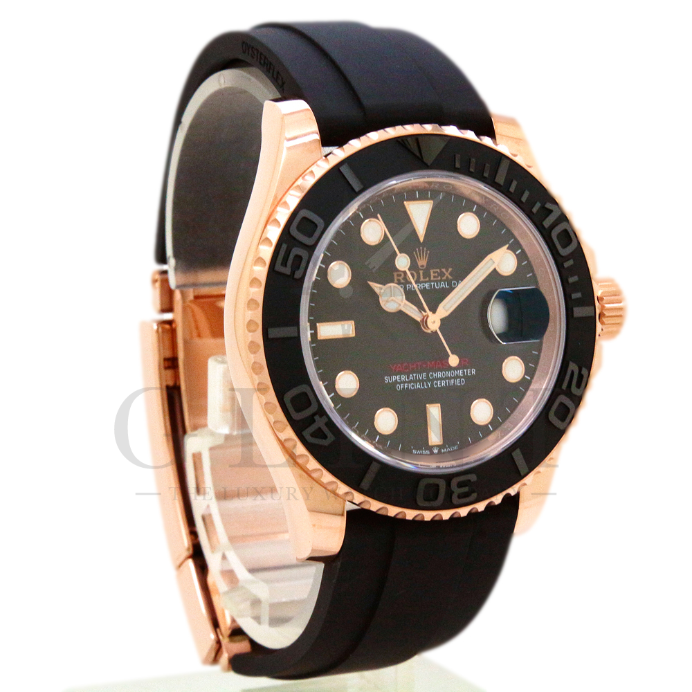 こちらはヨットマスター40 126655です。2019年に発表されたエバーローズゴールドモデルのヨットマスター。以前のモデルからは6時位置に王冠マークが足され、キャリバーがCal.3135からCal.3235に変更。また、バックルにはサブマリーナーなどで採用されているグライドロックシステムが搭載され、ブレスレットの調整が容易になりました。ブレスレットにはオイスターフレックスを採用し、軟性のあるチタン・ニッケル合金製ブレードを、しなやかで装着感に優れるエラストマー(人工ラバー)で覆っており、極めて高い耐久性と装着感を実現しております。従来のヨットマスターとは一線を画した高級感を味わえる一本です。