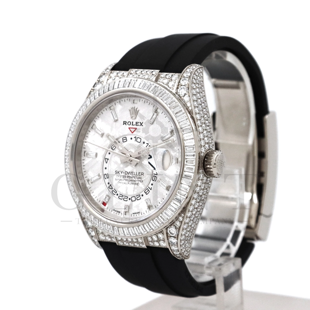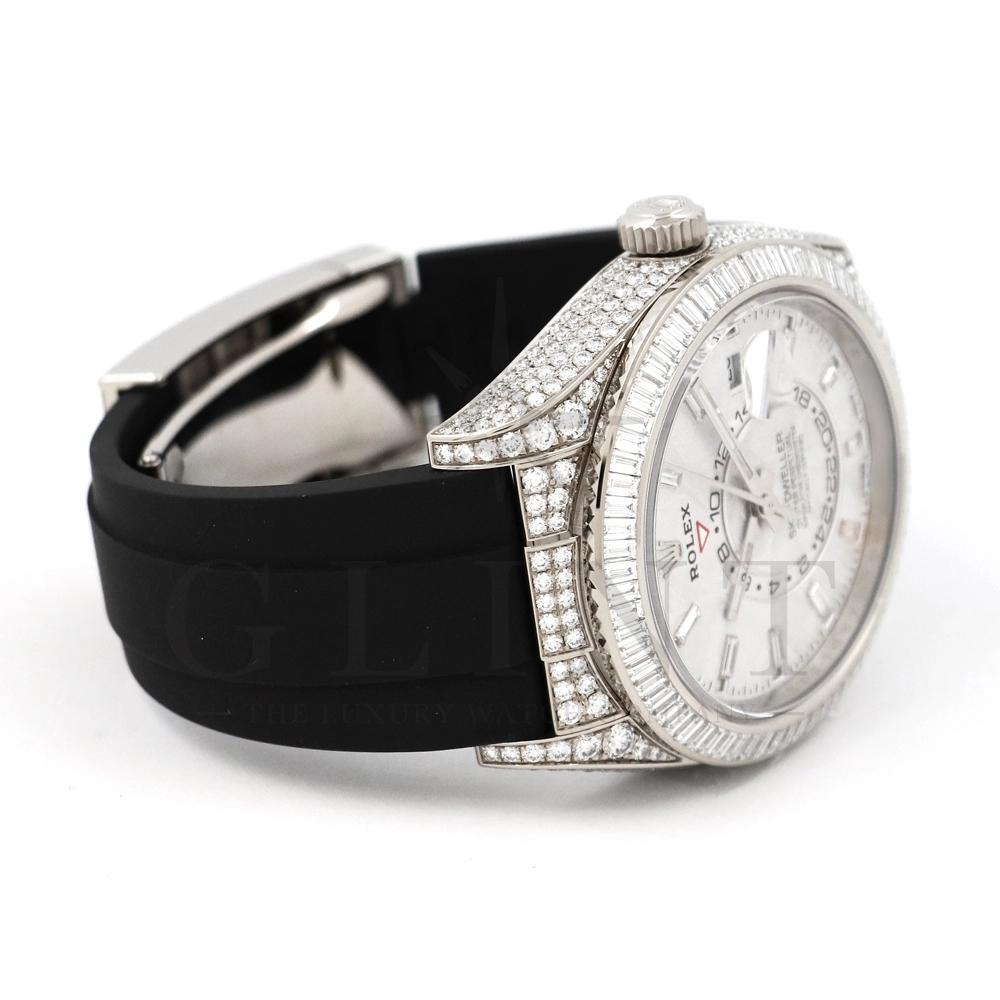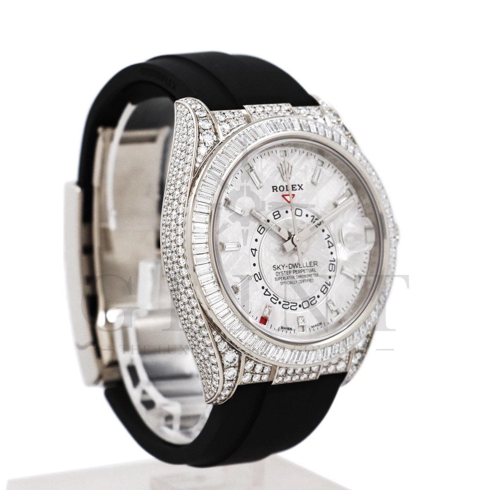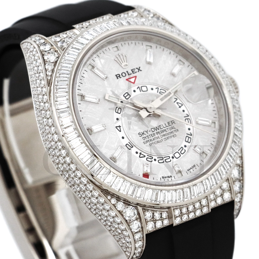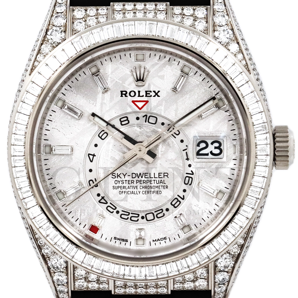 こちらはロレックス スカイドゥエラー 326259TBRです。ダイヤモンドが豪華にセットされた18Kホワイトゴールドのケースとベゼルに、文字盤にはバゲットダイヤモンドのインデックスを備えた希少なメテオライトダイヤル。2021年に発表され、ごく限られた本数しか生産されていない超レアモデルとなります。オイスターフレックスは軟性のあるチタン・ニッケル合金製ブレードにしなやかで装着感に優れるエラストマー(人工ラバー)で覆っており、極めて高い耐久性を実現しております。水や雨も気にならず、普段使いとしても快適に楽しんで頂けるでしょう。ムーブメントにはROLEXが完全自社開発し、ROLEX初のセミコンプリケーションキャリバーとなるCal.9001を搭載しており、3月1日のみに手動調整するだけで1年間実用可能なアニュアルカレンダーとデュアルタイム表示を搭載。高級感と実用性を見事に融合させた至極の一本です。