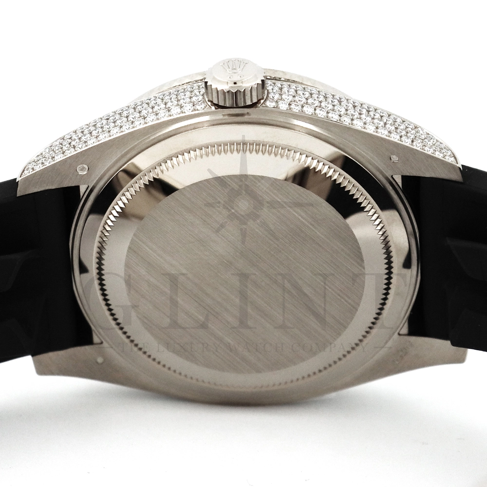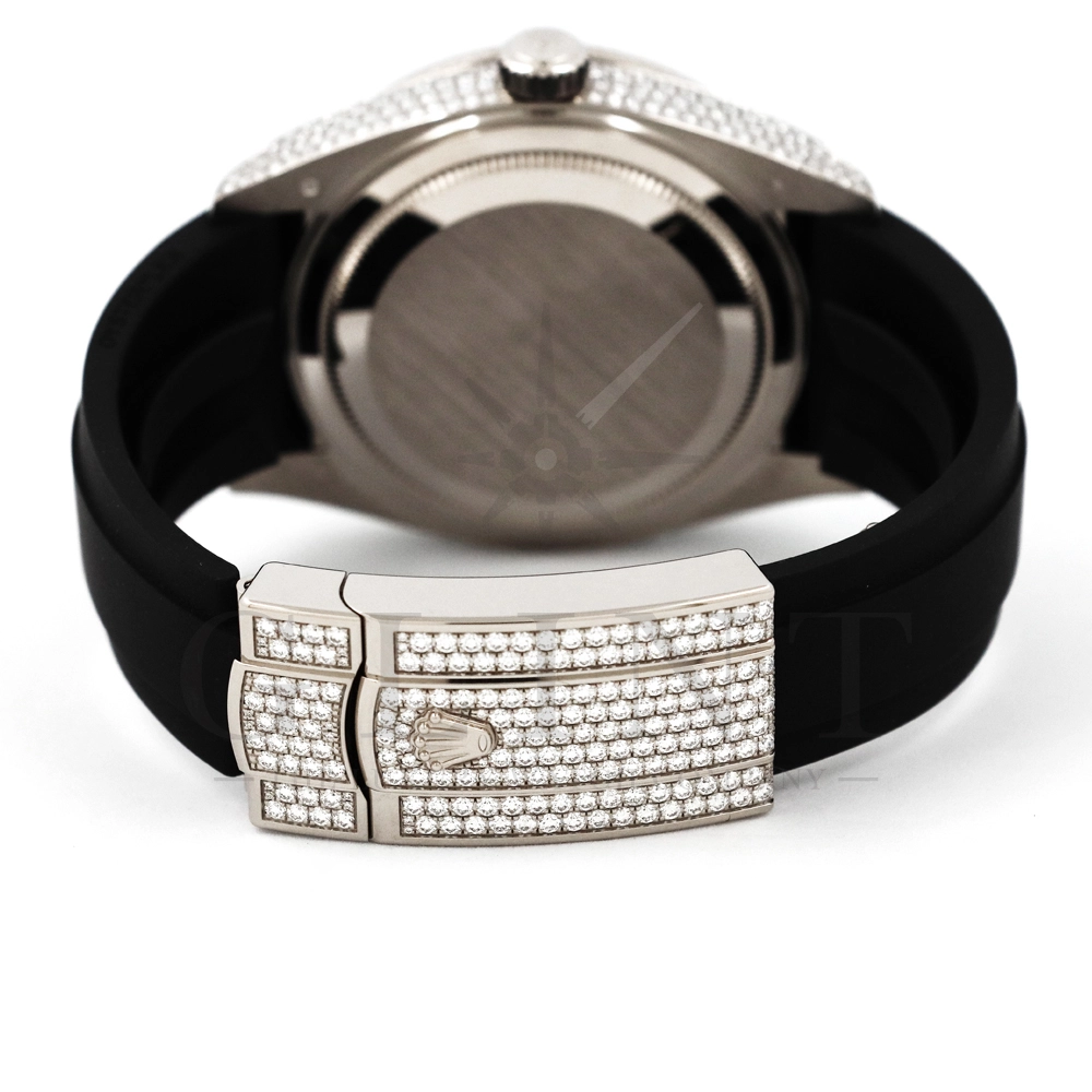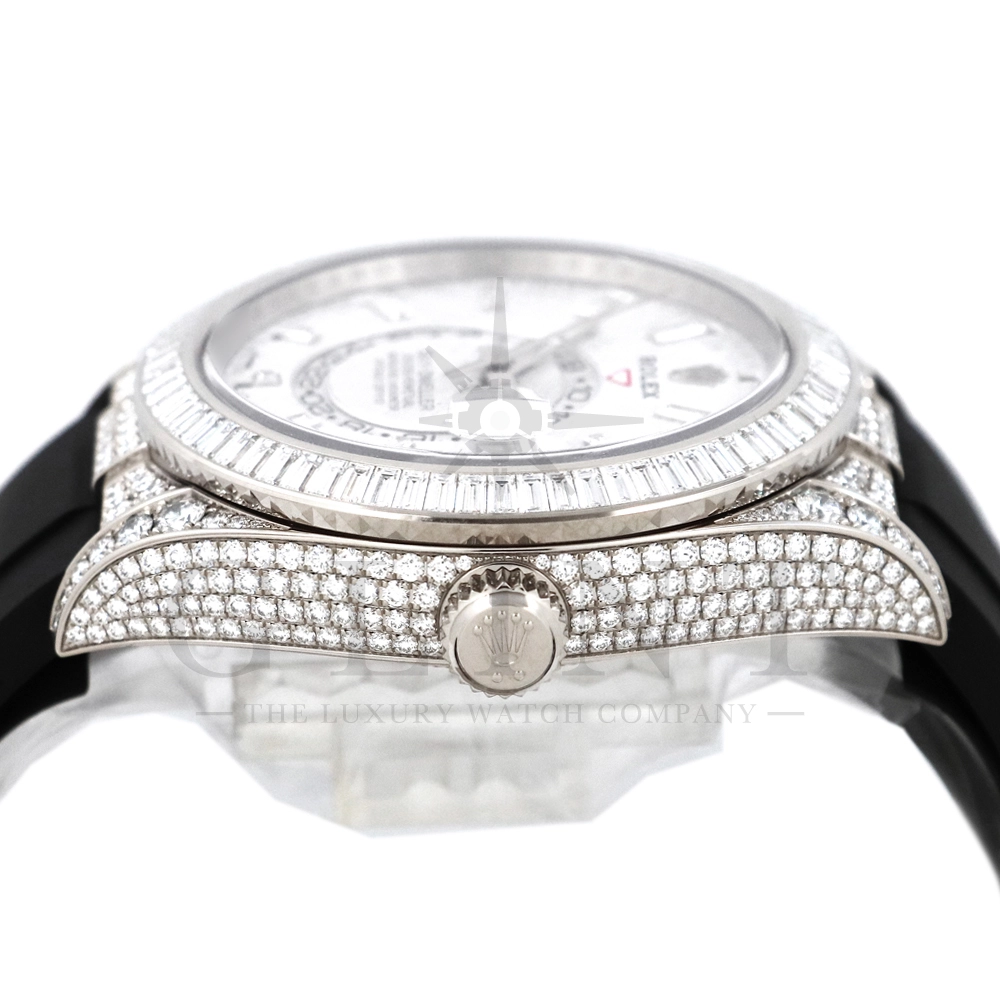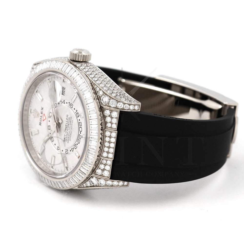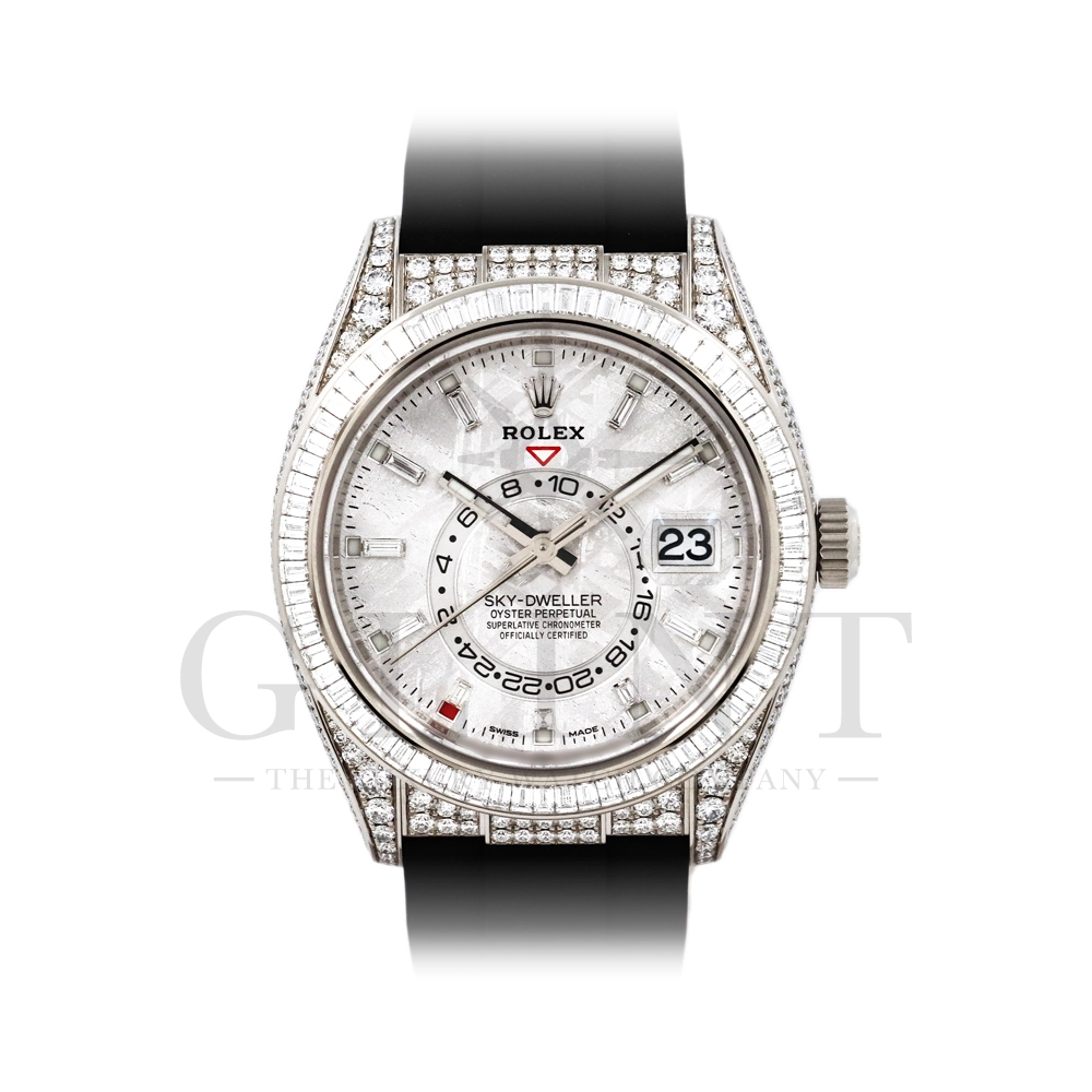 こちらはロレックス スカイドゥエラー 326259TBRです。ダイヤモンドが豪華にセットされた18Kホワイトゴールドのケースとベゼルに、文字盤にはバゲットダイヤモンドのインデックスを備えた希少なメテオライトダイヤル。2021年に発表され、ごく限られた本数しか生産されていない超レアモデルとなります。オイスターフレックスは軟性のあるチタン・ニッケル合金製ブレードにしなやかで装着感に優れるエラストマー(人工ラバー)で覆っており、極めて高い耐久性を実現しております。水や雨も気にならず、普段使いとしても快適に楽しんで頂けるでしょう。ムーブメントにはROLEXが完全自社開発し、ROLEX初のセミコンプリケーションキャリバーとなるCal.9001を搭載しており、3月1日のみに手動調整するだけで1年間実用可能なアニュアルカレンダーとデュアルタイム表示を搭載。高級感と実用性を見事に融合させた至極の一本です。