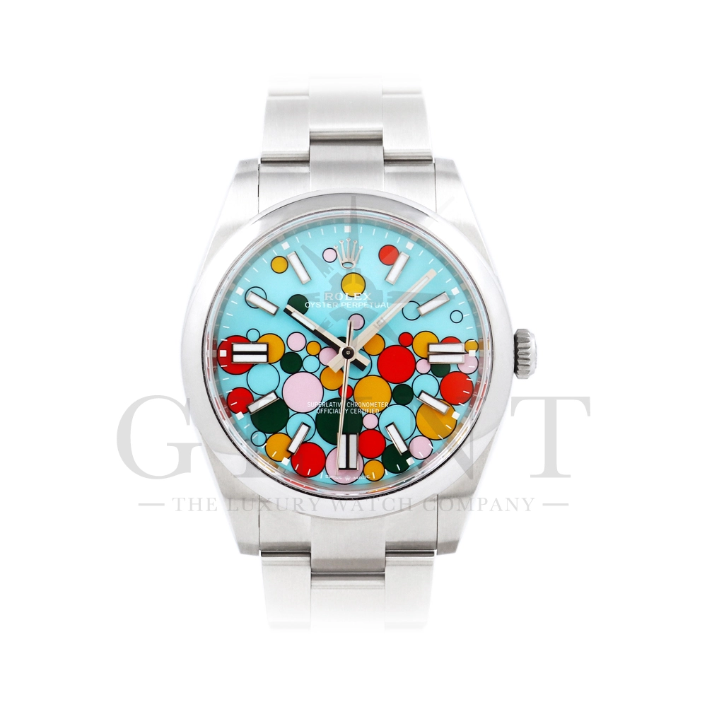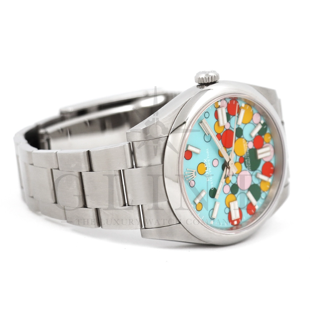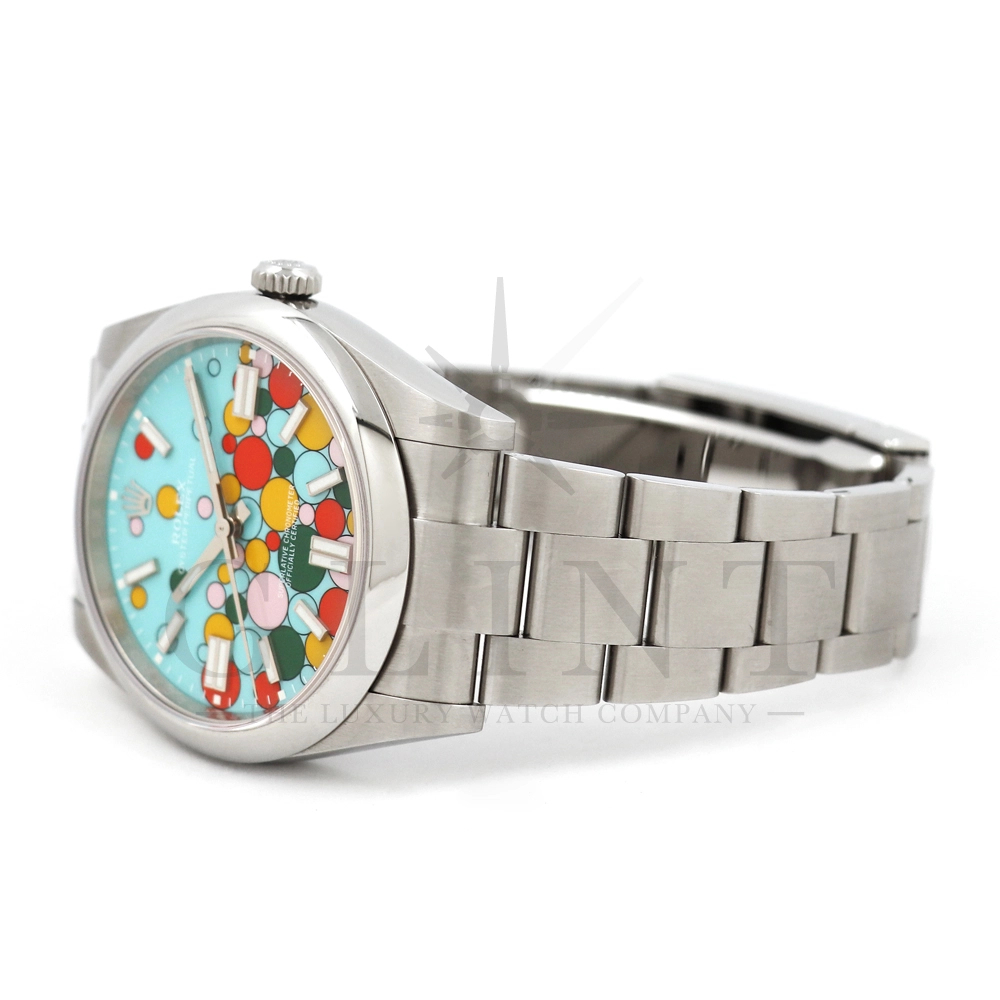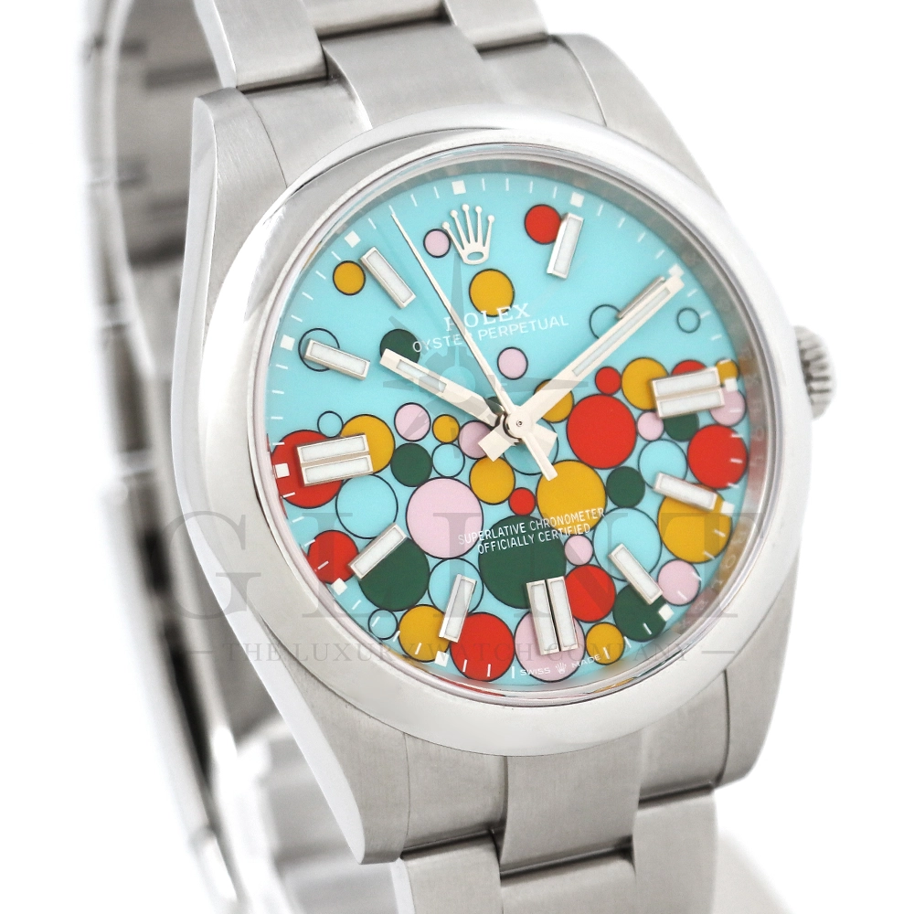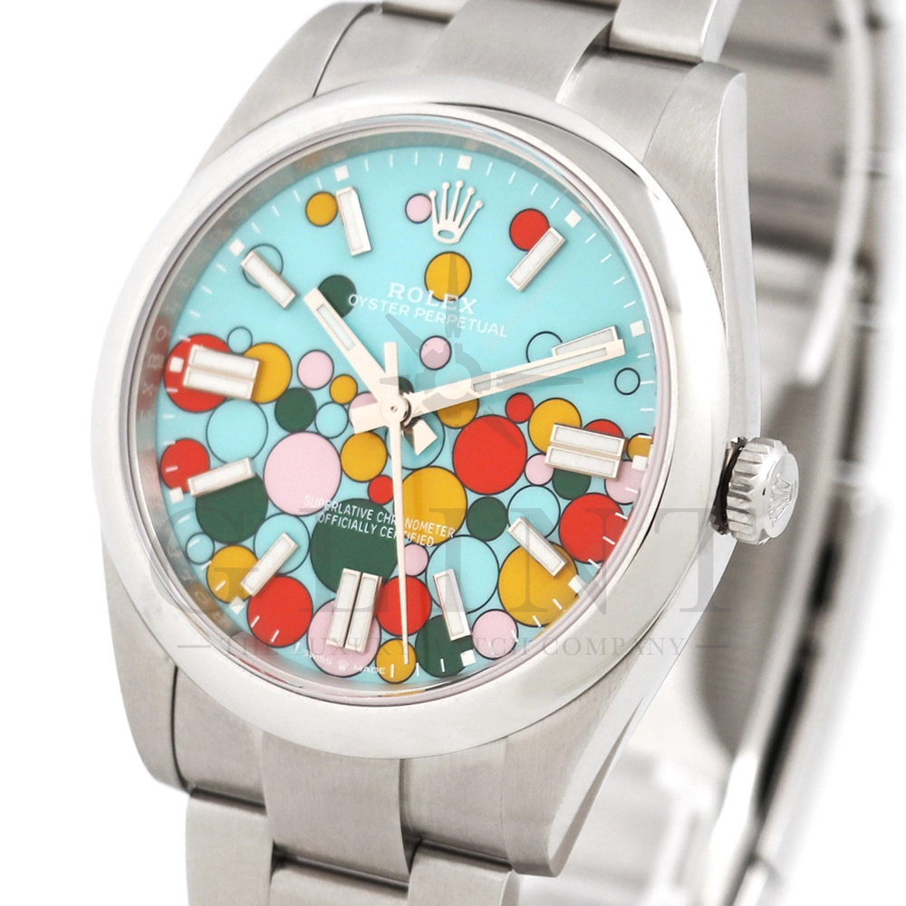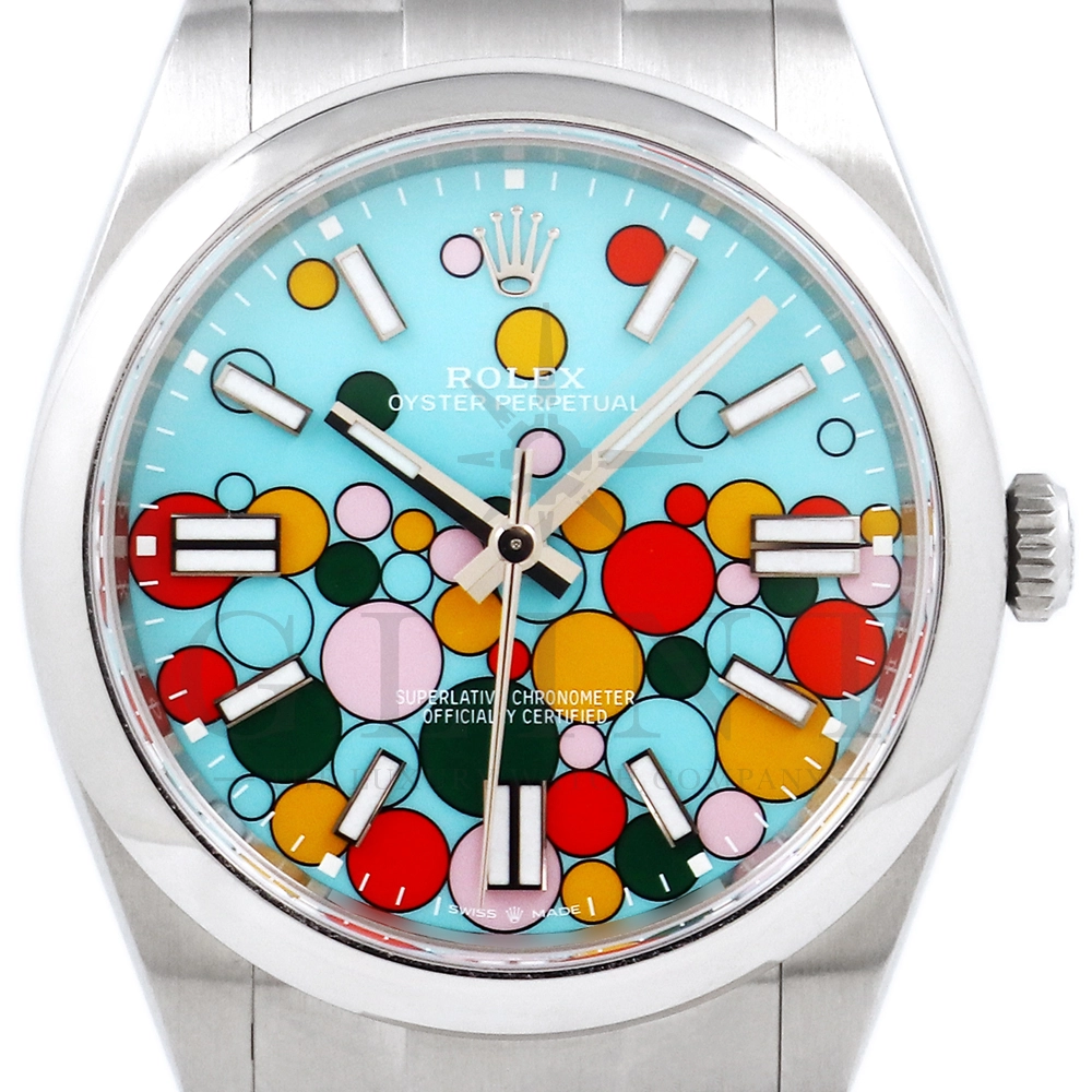 こちらはオイスターパーペチュアル 41です。「セレブレーション」と名付けられたこの新しいモチーフは「オイスターパーペチュアル」31mm、36mm、41mmで展開。黒い縁取りのさまざまなサイズのドットに2020年に発表されたラッカー文字盤のビビッドなカラーを閉じ込め、背景色に艶やかなターコイズブルーを、ドットにはキャンディピンク、イエロー、コーラルレッド、グリーンと5色の色調を取り入れたカラフルなドットが散りばめられ、明るく幸福感に満ちたデザインは新たな可能性を感じるモデルへと仕上がっております。ムーブメントは特許申請済みの耐磁性に優れたブルーパラクロムヒゲゼンマイを使用したキャリバー3230を搭載しており、パワーリザーブは70時間を誇ります。現行のオイスターパーペチュアルはサイズとカラー共にとても豊富な展開になっており、自分に合ったサイズとカラーをご選択が可能な為、男女ペアルックで付けたい方にもぜひお勧めしたいモデルです。