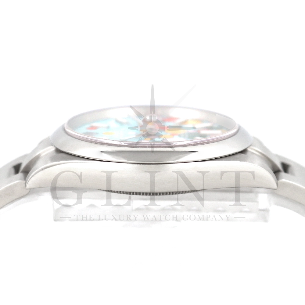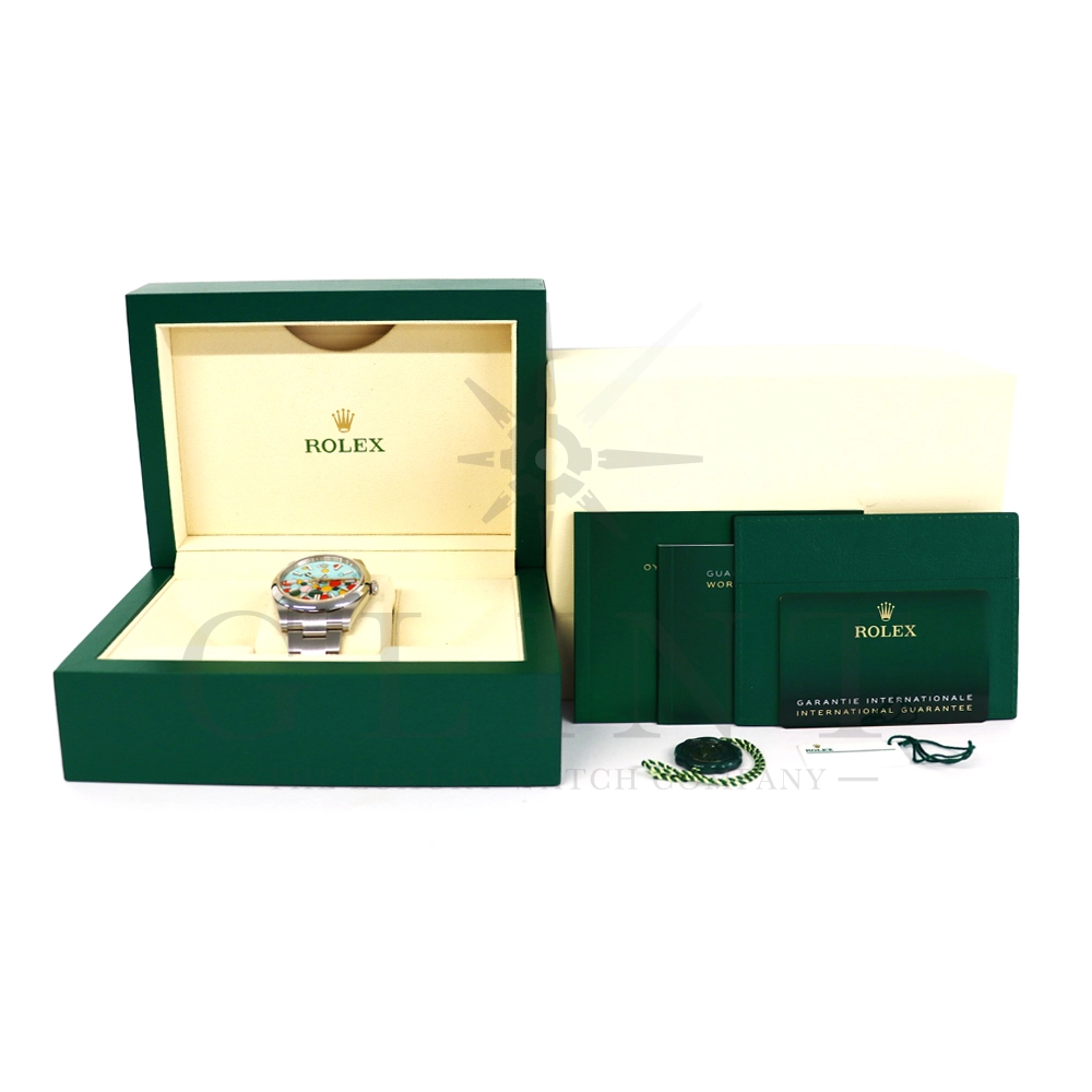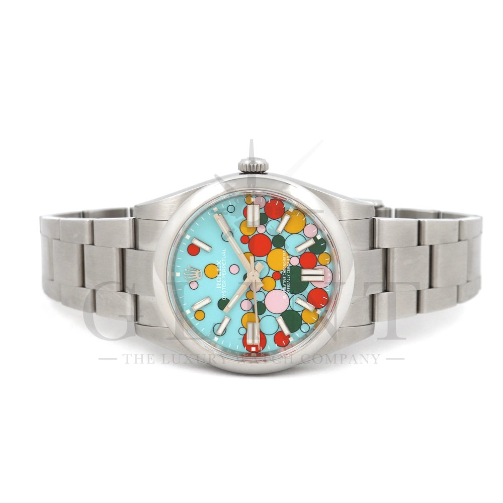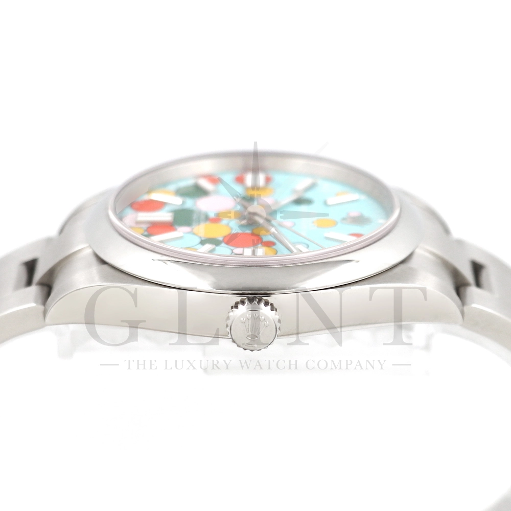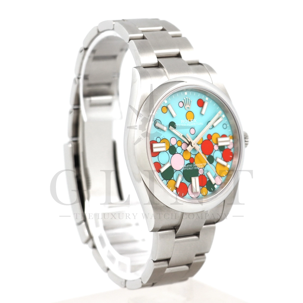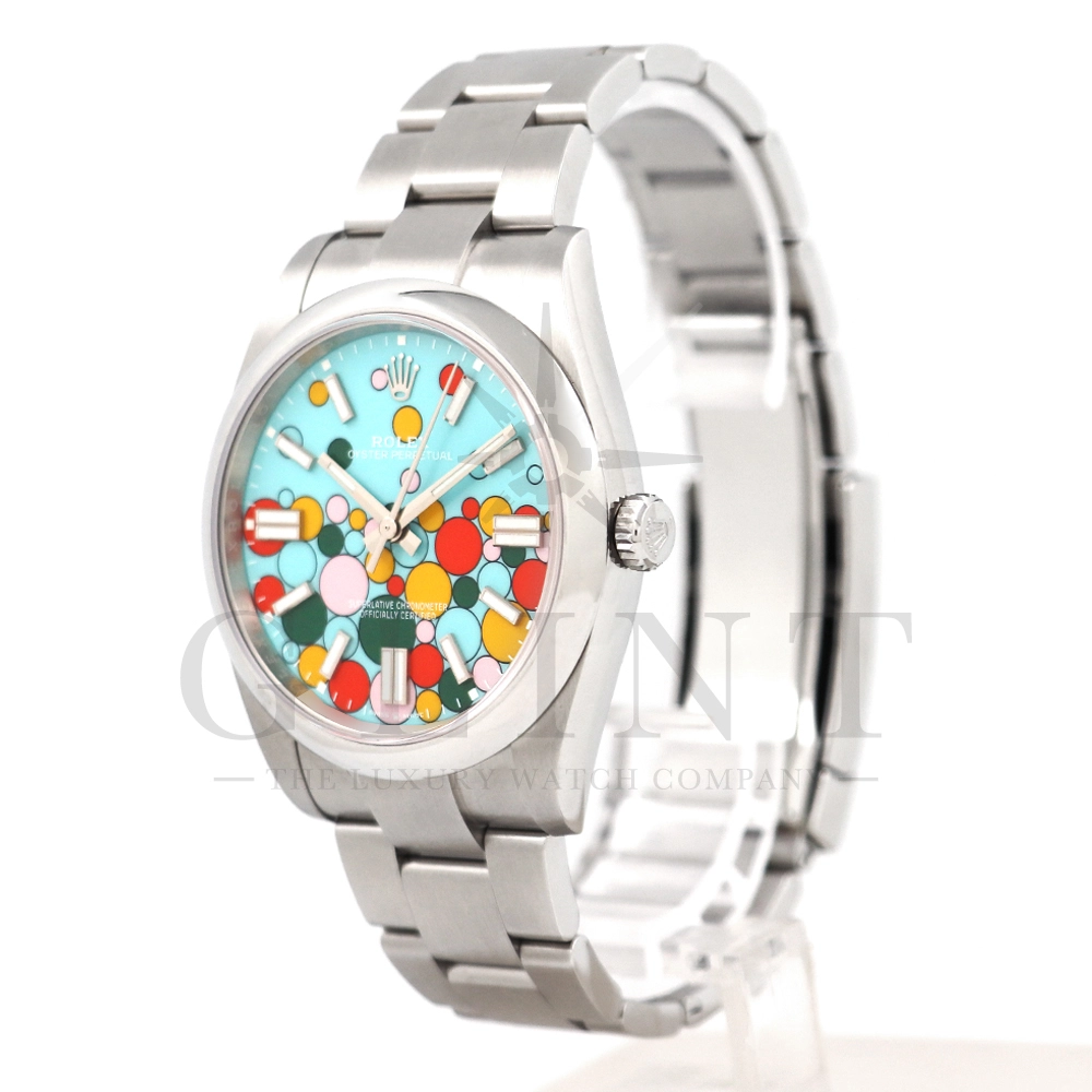 こちらはオイスターパーペチュアル 41です。「セレブレーション」と名付けられたこの新しいモチーフは「オイスターパーペチュアル」31mm、36mm、41mmで展開。黒い縁取りのさまざまなサイズのドットに2020年に発表されたラッカー文字盤のビビッドなカラーを閉じ込め、背景色に艶やかなターコイズブルーを、ドットにはキャンディピンク、イエロー、コーラルレッド、グリーンと5色の色調を取り入れたカラフルなドットが散りばめられ、明るく幸福感に満ちたデザインは新たな可能性を感じるモデルへと仕上がっております。ムーブメントは特許申請済みの耐磁性に優れたブルーパラクロムヒゲゼンマイを使用したキャリバー3230を搭載しており、パワーリザーブは70時間を誇ります。現行のオイスターパーペチュアルはサイズとカラー共にとても豊富な展開になっており、自分に合ったサイズとカラーをご選択が可能な為、男女ペアルックで付けたい方にもぜひお勧めしたいモデルです。